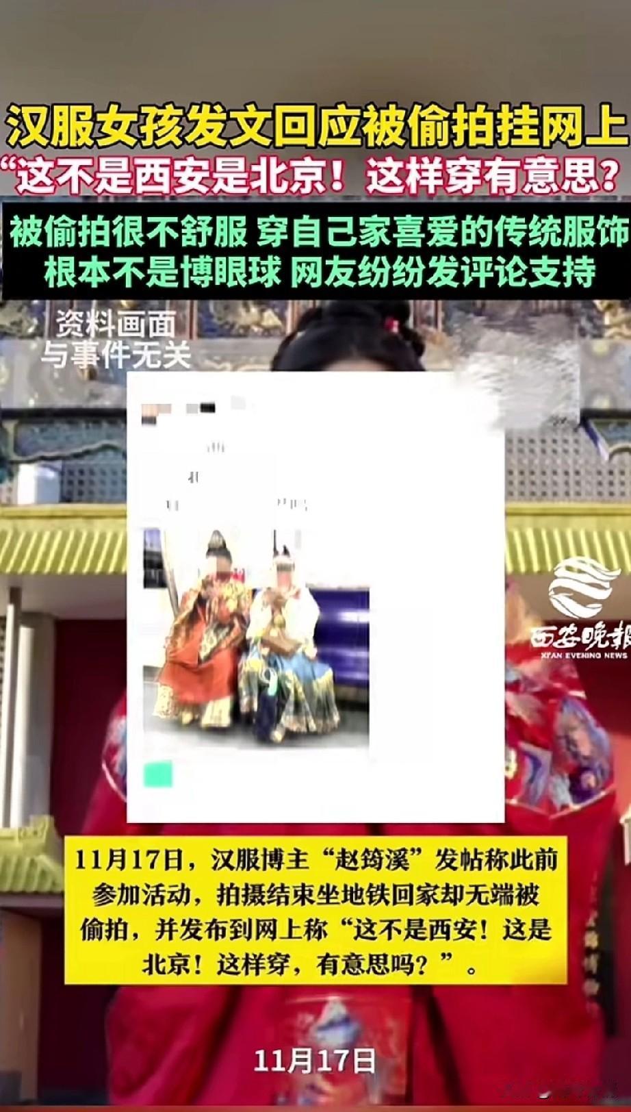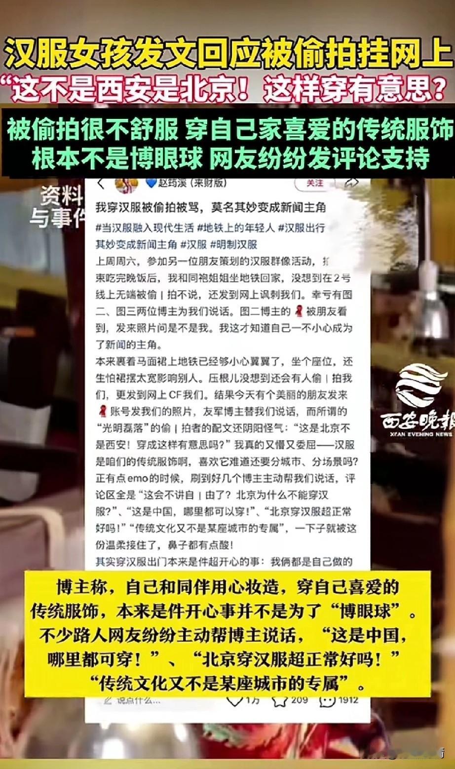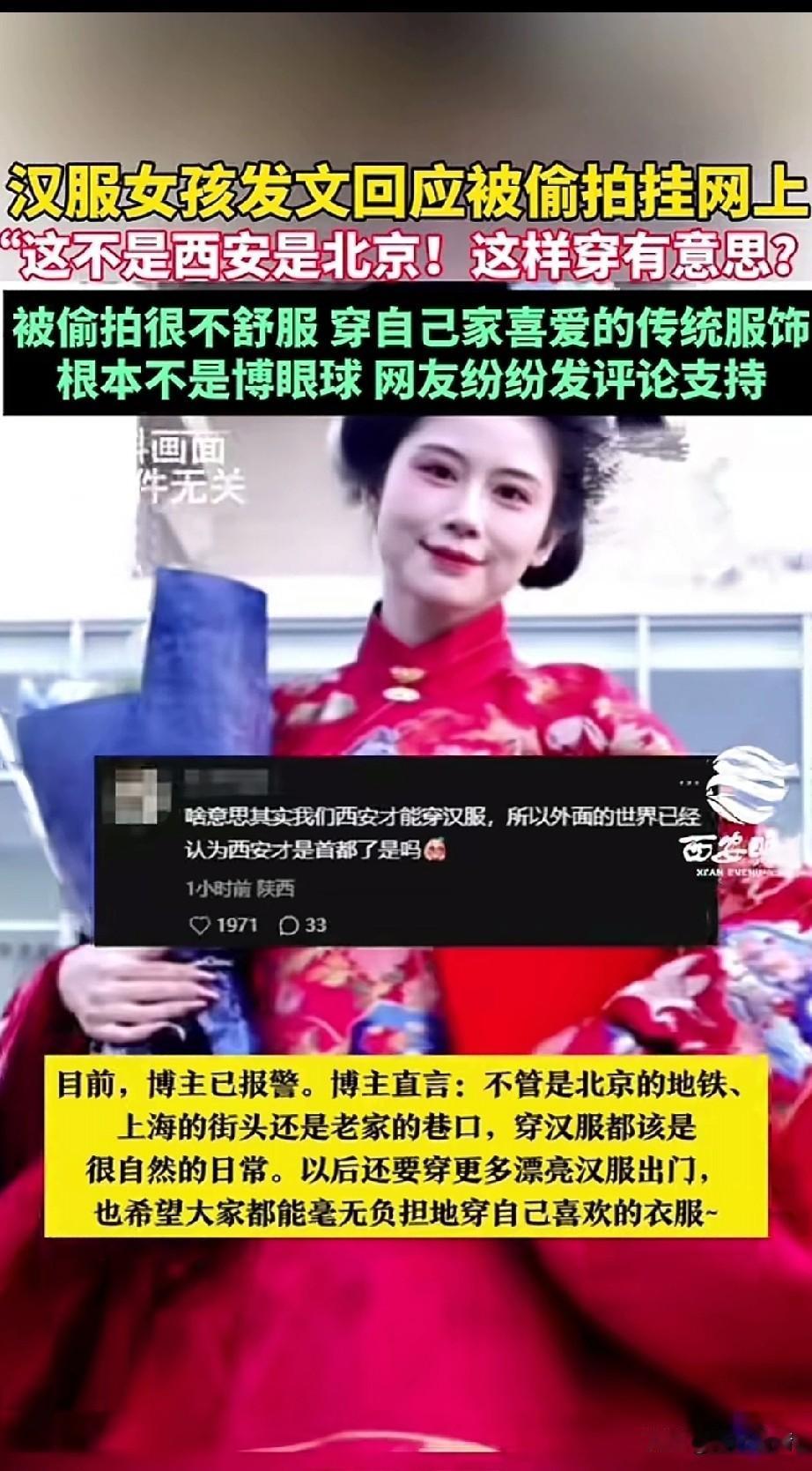 女孩回应了在北京穿汉服争议, 自己喜欢穿汉服, 在北京也可以穿汉服, 别忘了北京也是明朝的首都, 穿着汉服挺正常的, 这么好看的民族服装谁不爱, 不知道那些酸汉服的人是怎么回事, 现在穿衣自由, 如果在北京穿汉服不合适, 那穿满清服装就更不合适了, 弘扬民族文化人人有责, 在西安穿汉服可以, 在北京那就更可以了, 有人偷拍人家坐地铁的照片, 挂网上发出了不怀好意的挑衅还真是可笑, 大家对于女孩在北京穿汉服被有心人讽刺怎么看? 汉服争议 汉服乱象 汉服情感表达 汉服起源之争 巴黎汉服走秀 汉服维权 天坛汉服照