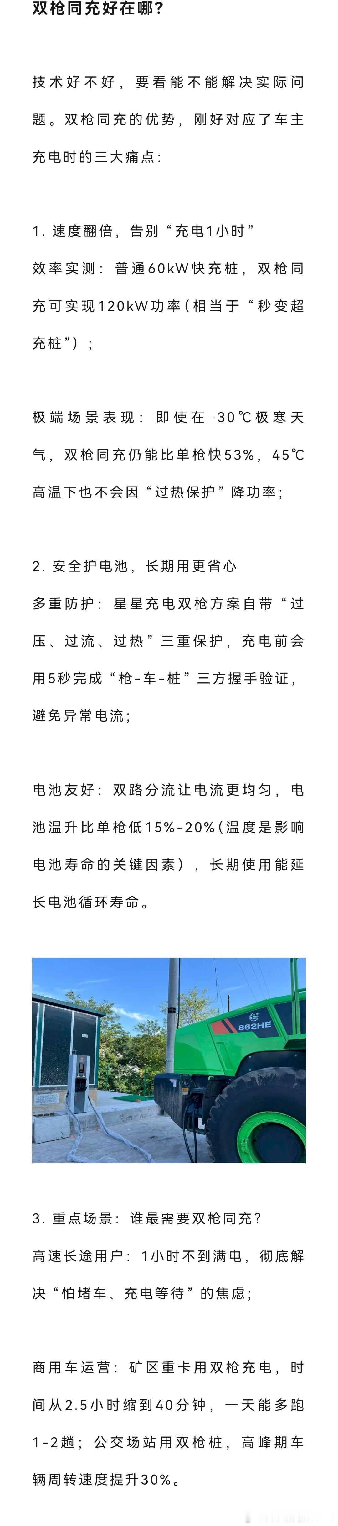 第三方纯生意人星星充电亲自下场论述双枪充电了,旁观者理得确实清楚:1、实测普通60kw快充桩,双枪能实现120kw,自动翻倍;2、双路分流让电流更均匀,电池温升比单枪低15%-20%(温度是影响电池寿命的关键因素),长期使用,比单枪更能延长电池循环寿命;3.按照星星充电的数据,公交场站那种满负荷运行的场地,高峰期双枪充电能让周转率提升30%。老基建焕发第二春、更好的养护电池、更高的充电站周转率,一条条清清楚楚。