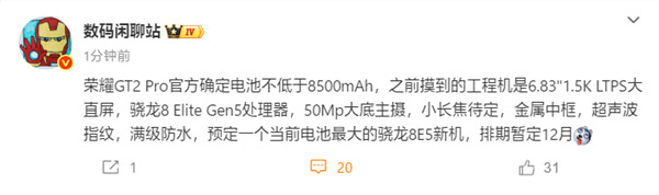 荣耀GT2 Pro 12月亮相8500mAh超大电池+骁龙8 Elite Gen5,性能续航双炸。上代344万分性价比断层第一,这代满配主摄防水,直接掀翻性能机市场。
