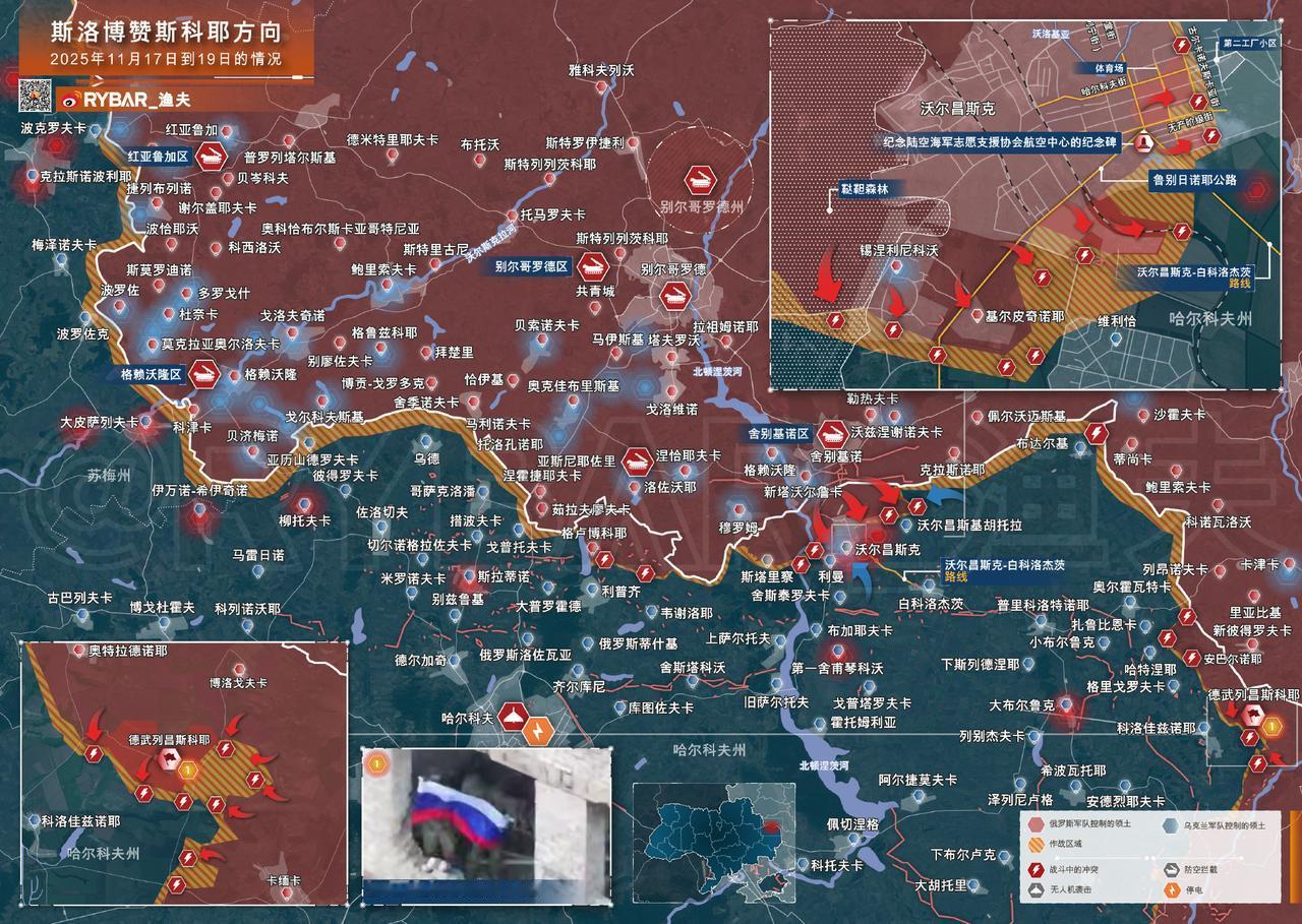 🚩斯洛博赞斯科耶方向 截至2025年11月20日的情况 在斯洛博赞斯科耶方向,俄军分队解放了德武列昌斯科耶。第18摩步师第9团官兵在镇中心升起了俄罗斯国旗。 至此,在斯洛博赞斯科耶与库皮扬斯克方向的结合部,一个延伸至俄罗斯边境的"口袋"区域已被消除。现在俄军有望向科洛德兹诺耶方向继续进攻,并沿上德武列奇纳亚河拉直战线。 📌沃尔昌斯克战线同样取得局部战果。敌军已被彻底驱逐至喷泉大街以东区域。乌军仅存的零星存在局限于古尔卡诺夫斯卡大街西侧的少数住宅建筑。 在沃尔昌斯克取得推进后,俄军继续向邻近的基尔皮奇诺耶(策格利诺耶)地区进攻,成功解放该定居点。截至11月18日,俄国防部宣布第69摩步师第82团突击分队已控制该镇,随后不久又将敌军从东部铁路沿线的林带和工业区清除,为进攻维利恰开辟了新战线。 控制区域向城南方向的扩展,使俄军能够通过北顿涅茨河畔林区继续向南推进,同时有效打击沃尔昌斯克城内及周边乌军居民点补给线的后勤系统。 ❗️尽管战线持续后撤,敌军仍未停止对俄罗斯边境地区的炮击,更持续发动无人机波次袭击。仅过去三天内已造成五名平民伤亡。 俄乌冲突新局势俄军最新进展热点观点 来源:RYBAR_渔夫