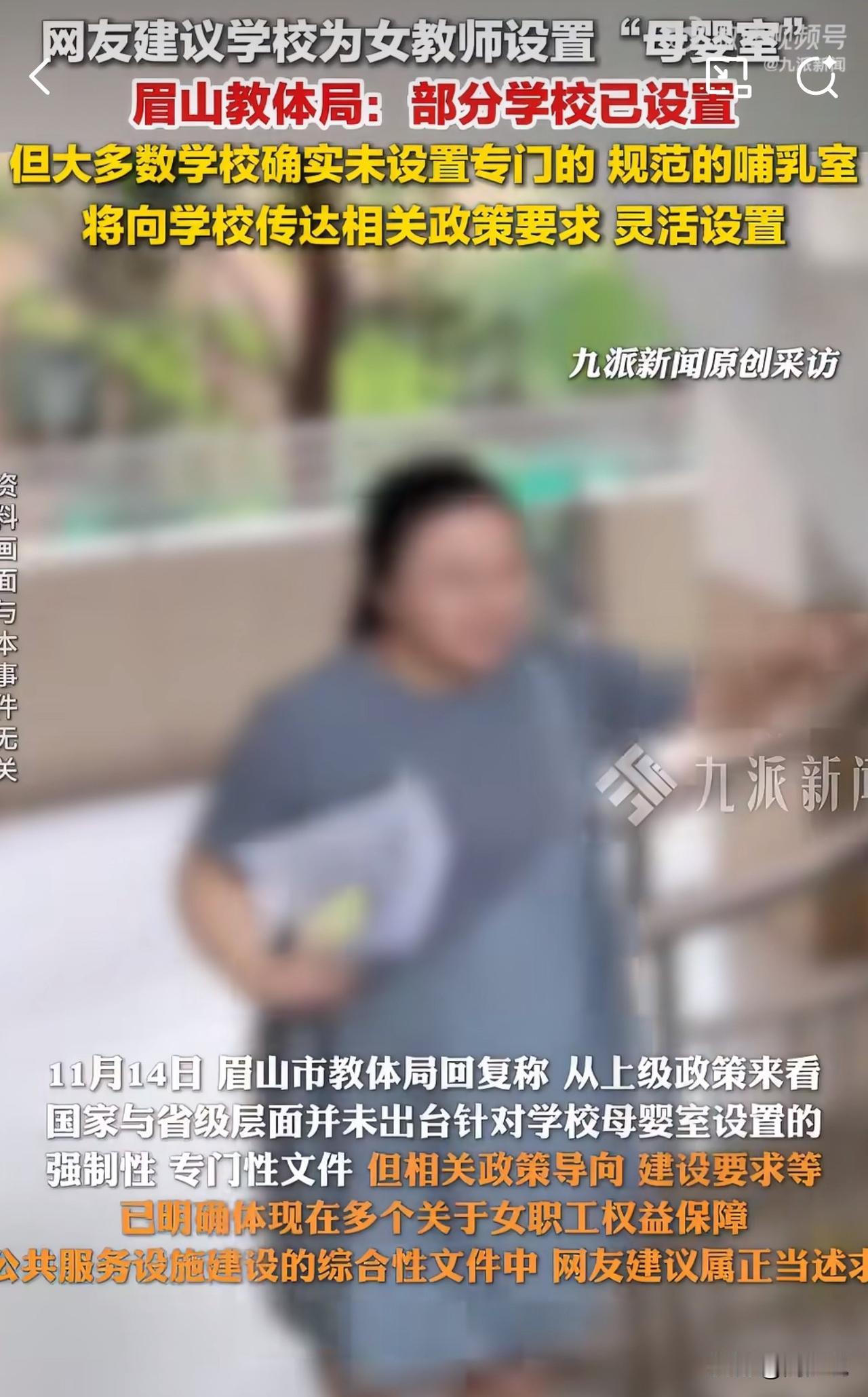 #MCN双量进阶计划#你敢信,网友建议学校设母婴室真的获官方支持了! 近日,四川眉山网友建言学校为女教师设母婴室,称校园女教师群体大、哺乳需求迫切,如今不少公共场所都有母婴室,学校更该保障这份权益。 针对网友的建议,眉山市教体局回应将推动落实,并且明确会向各县区、学校传达政策要求,鼓励整合教工之家、卫生室、闲置会议室等资源,在安全私密前提下灵活设哺乳室。 对于此举,引发众多网友纷纷点赞:“早该考虑女教师需求了,喂奶难真的很折腾人,有了母婴室,实用又暖心,这是尊重女性职场权益的好举措”。 周少想说校园母婴室不只是简单场地,更是对女教师的人文关怀。解决哺乳难题能让她们更安心工作,既体现教育系统的温度,也传递出对女性权益的重视,这样的民生小事落地,才是真正的贴近需求、服务群众。#寻美三湘# #长沙新朋友#
