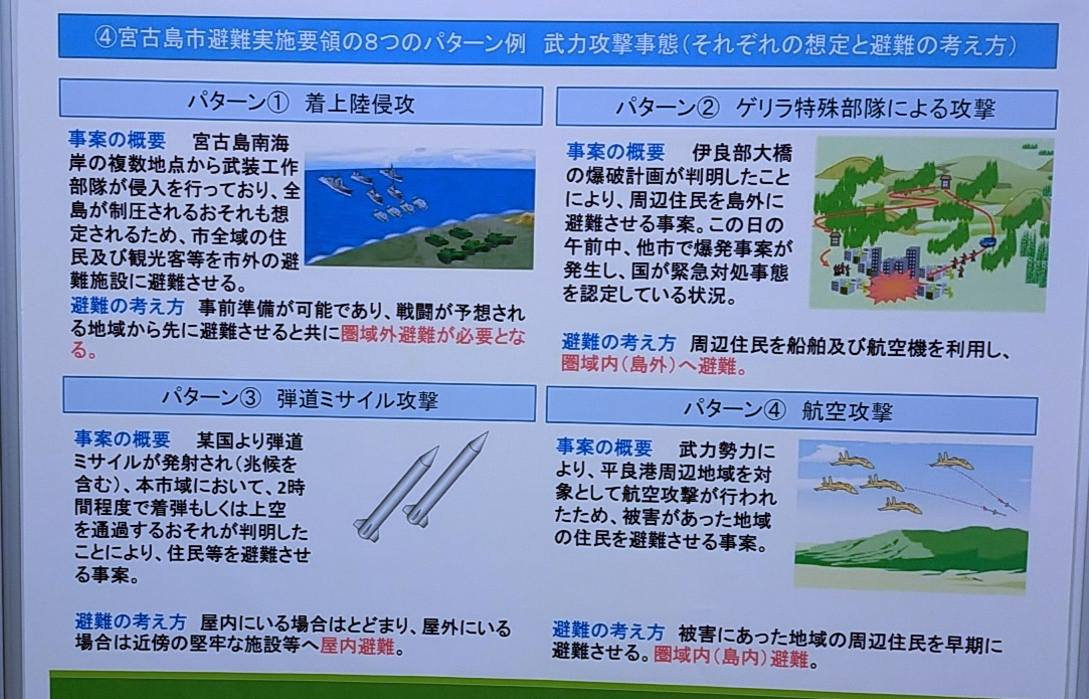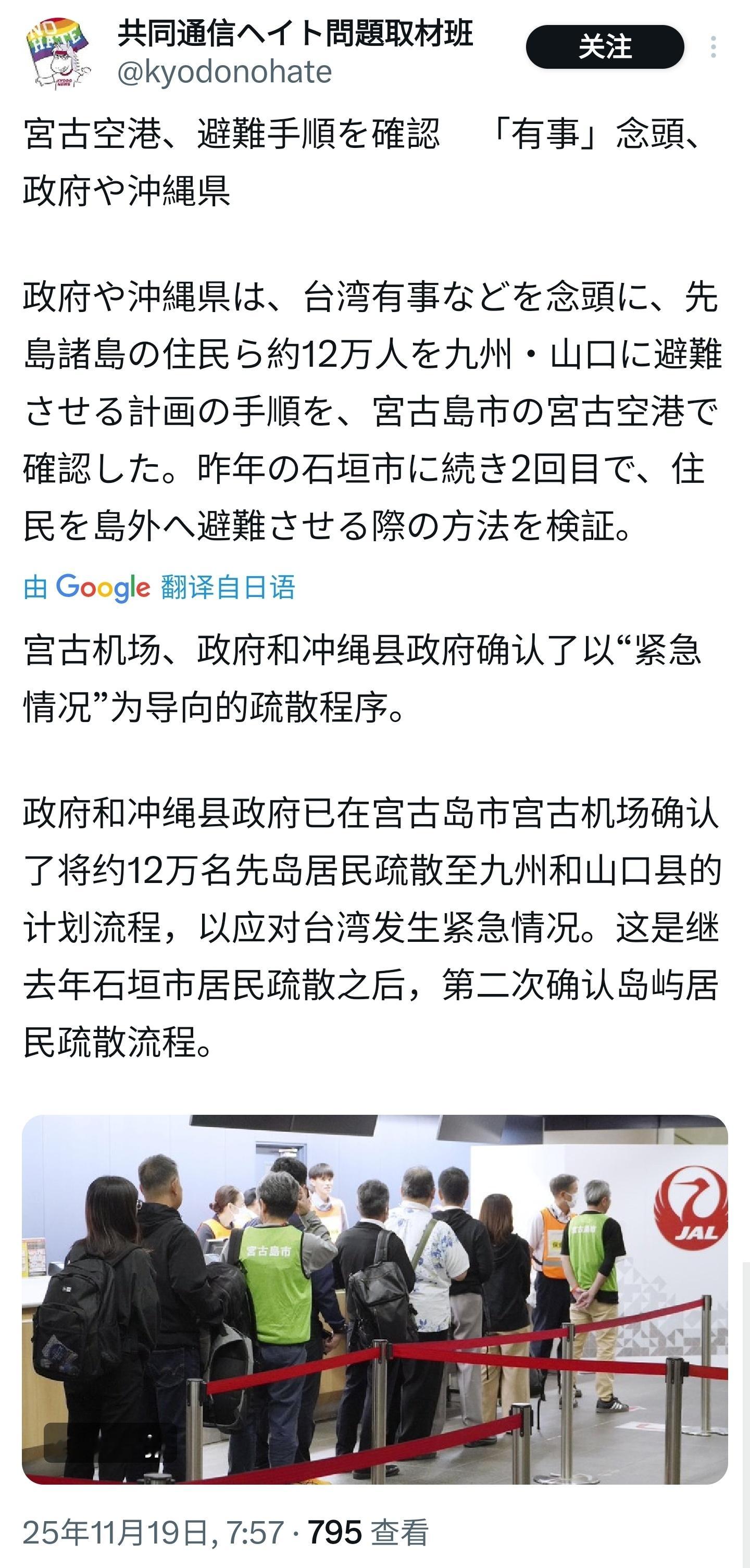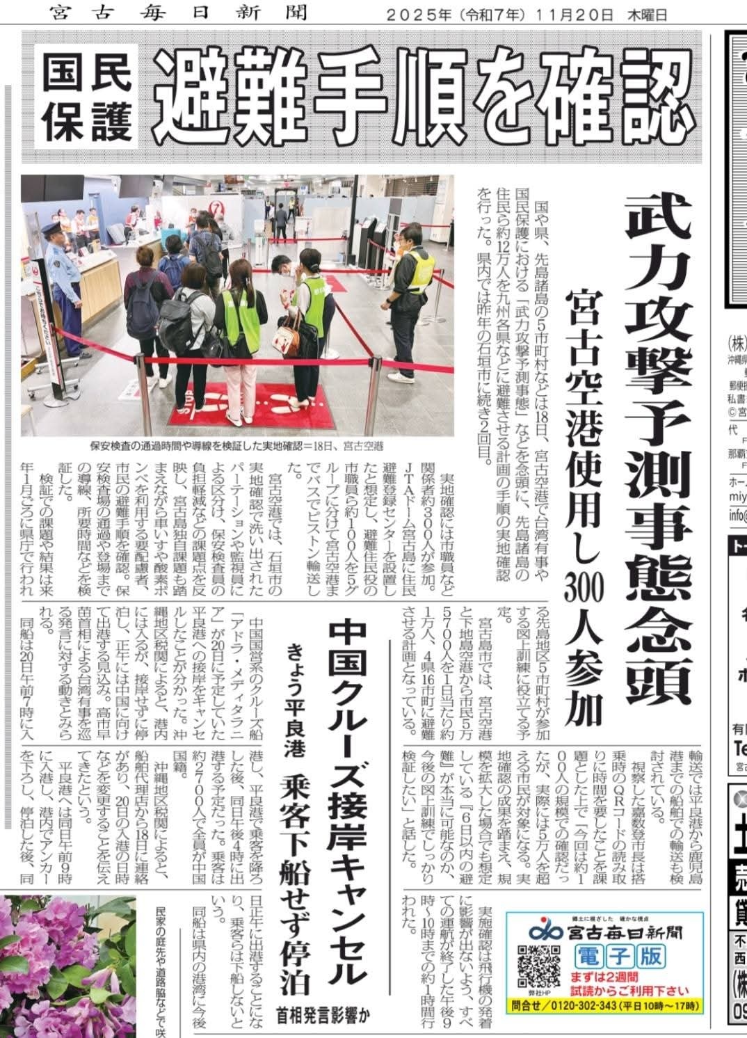 11月18日,日本政府在琉球群岛的宫古机场举行避难流程实地演练,日本和美国正向琉球群岛部署导弹发射部队,假设在台湾发生突发事态或出现“武力攻击预兆”情况下,需要将琉球群岛中的先岛地区约 12万名居民撤离到九州等地。此次演练共有 约300名政府相关人员 参加,是继去年石垣市后,冲绳县第二次进行同类实操。这次仅是百人规模的流程确认,但真正需要撤离的宫古市民超过5万。日本政府计划明年年初进行图上演习以进一步验证所谓‘6天内完成全面撤离’到底是否可行。