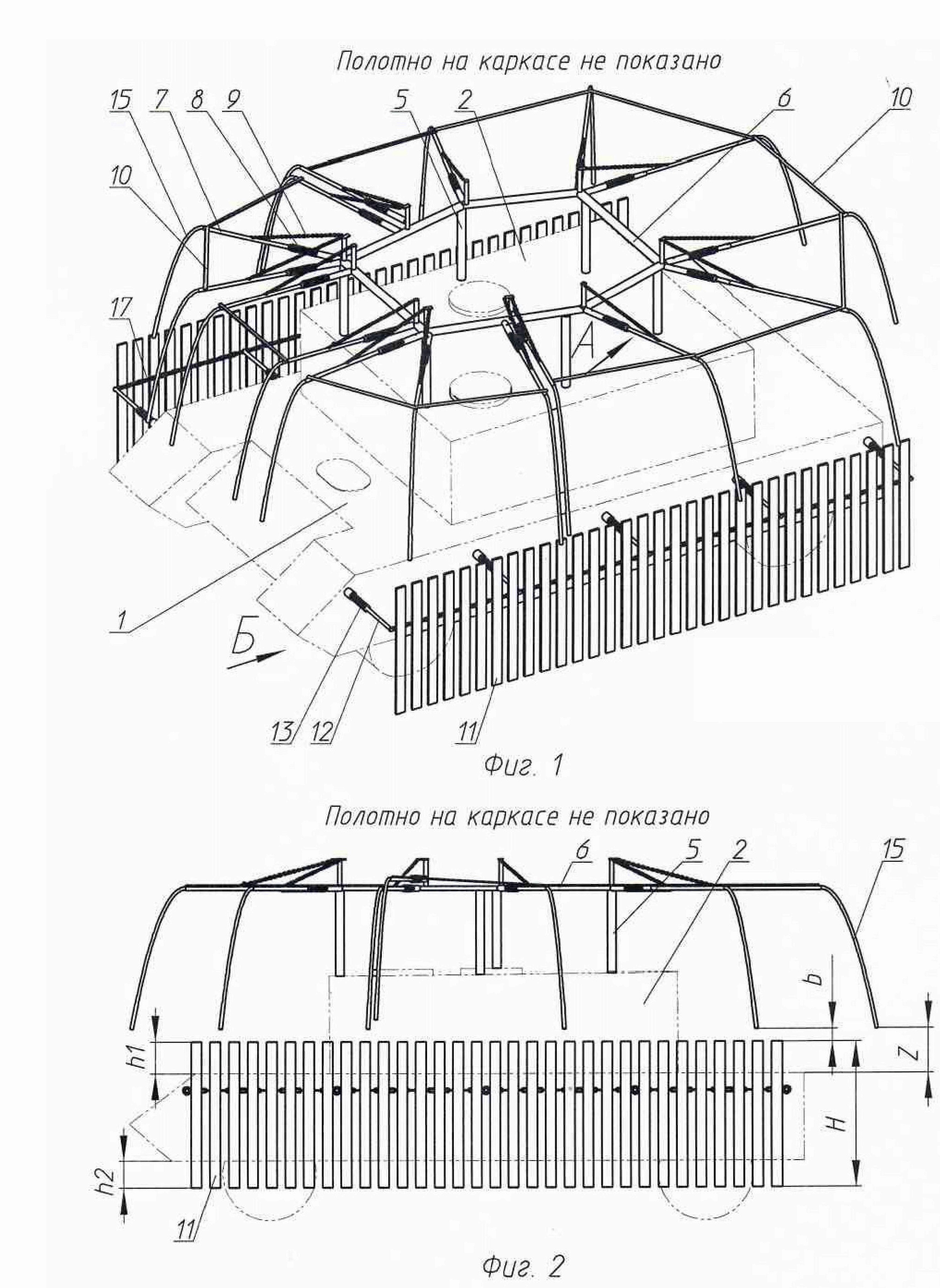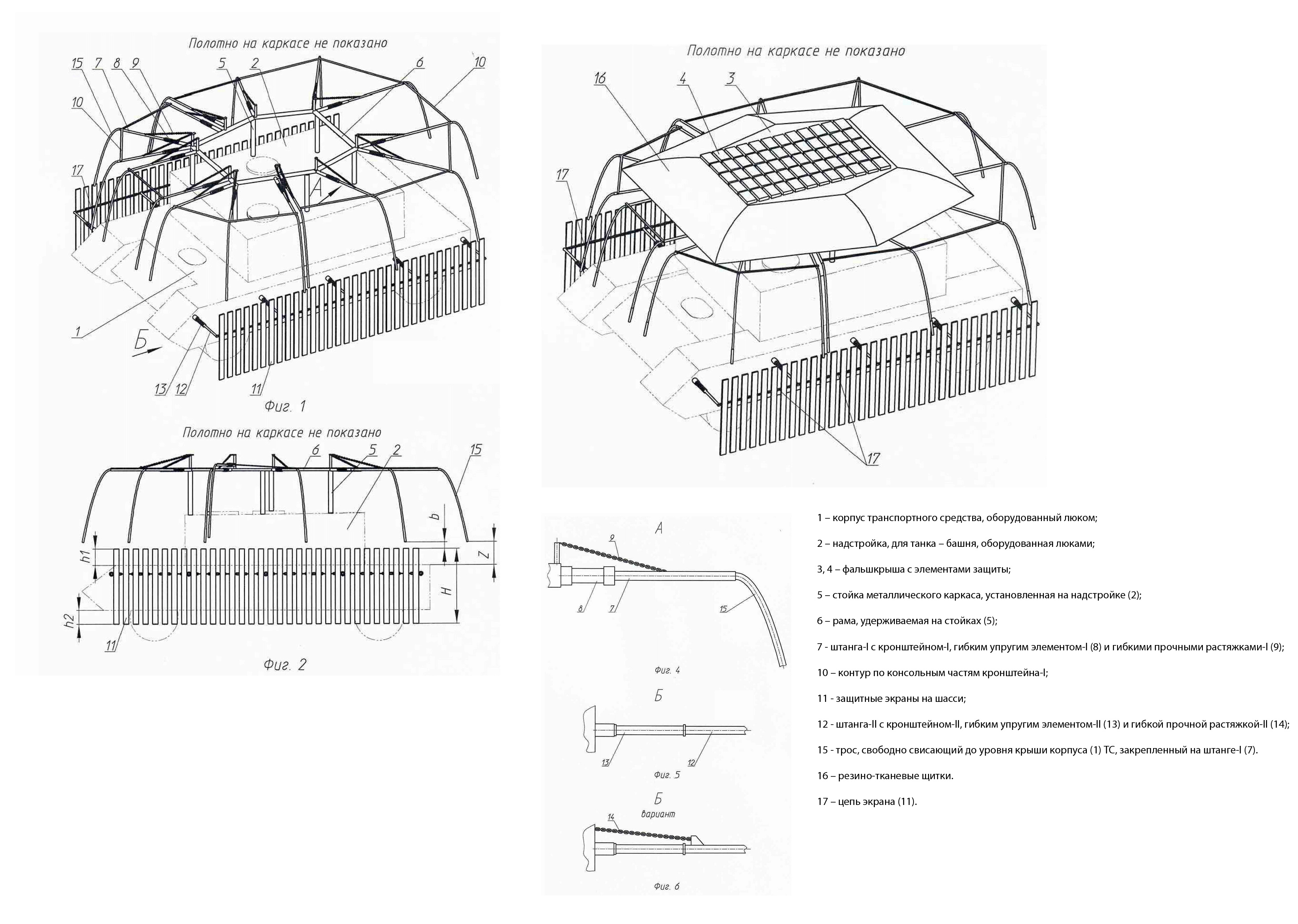 乌拉尔的反无人机桌罩乌拉尔机车车辆制造厂科研生产联合体公司(UVZ,隶属于俄罗斯国家技术集团)注册的一项新发明专利公开了一种保护装甲战斗车辆(主要是坦克)炮塔和车体免受携带聚能装药战斗部的自杀式无人机攻击的方法及装置。该解决方案的核心是一个轻质可拆卸框架,安装在炮塔上方,其上张设大型防无人机网(网状顶篷)。沿框架周边固定至少四根径向悬臂杆,这些悬臂杆延伸至车辆外形轮廓之外,将防护网支撑到安全距离处,以确保无人机战斗部在距离装甲足够远处起爆。外侧悬臂杆通过柔性弹性部件安装,并采用拉索或链条加固,使其在撞击障碍物(树木、建筑物等)时能够偏转,而不会破坏整体结构或撕裂防护网。附加防护包括可选装的侧部柔性屏帘:沿车体侧方安装在类似的可折叠悬臂杆上,垂挂橡胶帆布或聚氨酯条带/链条,覆盖从顶部上方至底甲板下方的侧向投影区域;以及从顶部悬臂杆末端自由垂挂的粗电缆(直径18-50毫米),用于提前触发或缠绕无人机螺旋桨。整套系统为被动防护设计,具有快速安装/拆卸、便于维修的特点,比传统的金属条栅装甲或内置爆炸反应装甲的顶棚防护层显著轻量化,同时保障乘员通过舱门进出,并维持对FPV无人机和巡飞弹的360度顶部及侧向局部防护。图片来源:Andrei_bt