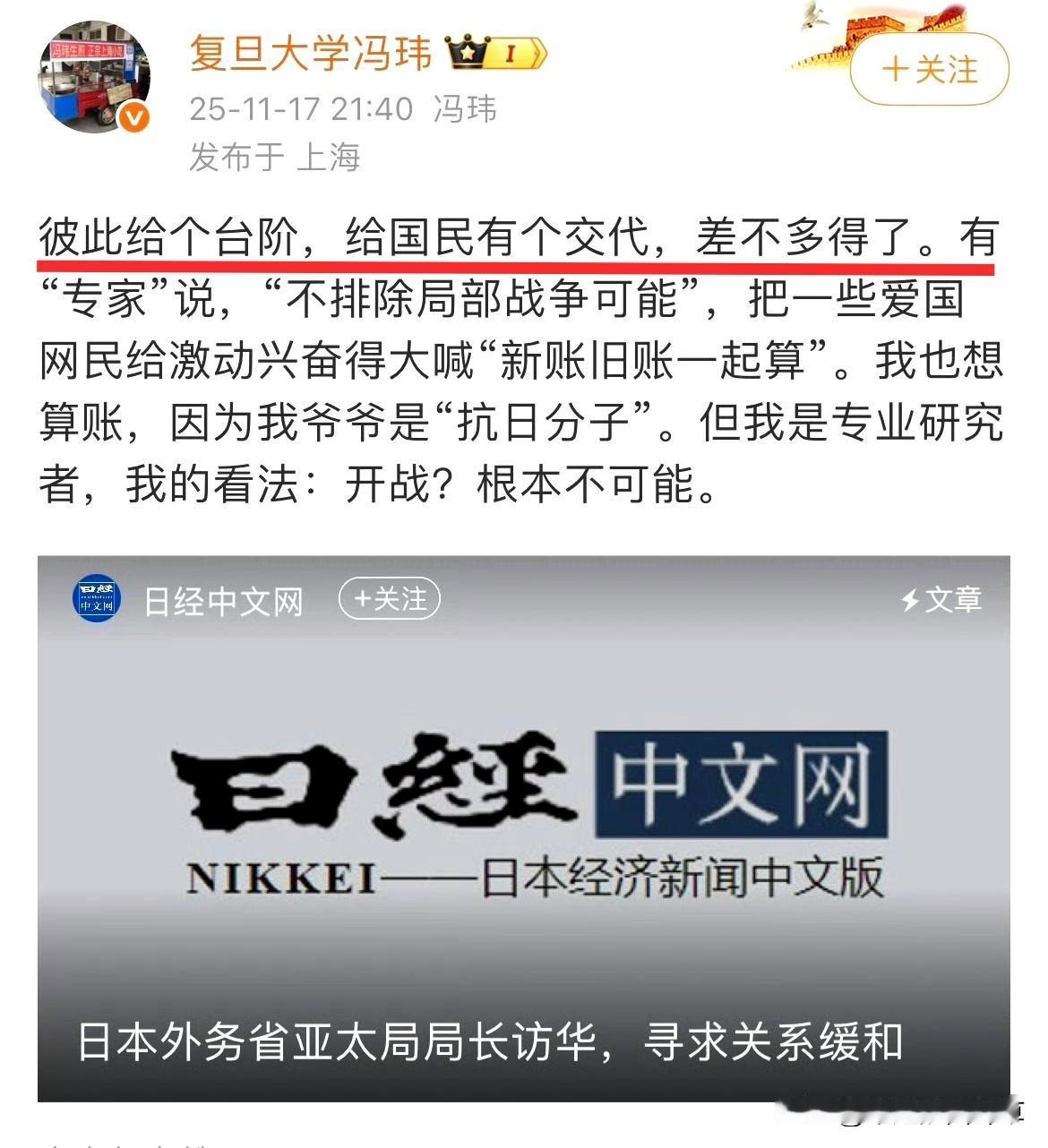 复旦教授冯玮一句“彼此给个台阶,差不多得了”给日本解围的发言,不光让自己彻底站在舆论风口,更让整个乱扯歪理的学者圈都慌了——这事儿,可比他们想的严重多了。 根据网上所说他早有前科:曾宣称“南京大屠杀是误杀”,替天皇撇清罪责,遭全网痛批数典忘祖,学校停其课程,谴责声至今未平。11月17日,再发争议言论:喊“彼此给个台阶,给国民有个交代,差不多得了”,嘲讽爱国网民“新账旧账一起算”是“激动兴奋”,更以“专业研究者”身份断言“开战?根本不可能”。自称“爷爷是抗日分子”也遮不住立场荒谬,网友直戳核心:“国家出钱让你研究日本,不是让你替它说话!” 当年日本偷袭珍珠港前,美国认定其不敢宣战,谈和之际遭偷袭,太平洋舰队重创。对日本,我们从不敢掉以轻心。 佩洛西窜台后,我们打破“海峡中线”,抵近军演成常态;南海问题上,对方越挑衅,我们越能名正言顺巩固主权。 伟人早说过,当年日本敢侵略,是觉得中国人“一盘散沙、没血性”。如今中国强起来,靠的是民族信仰与底线。学者该守底线,而非歪曲历史。 以前个别学者乱说话没人较真,现在不一样了:背弃立场者,丢饭碗还遭万人唾骂。历史是血写的,坚守底线不该是共识吗?