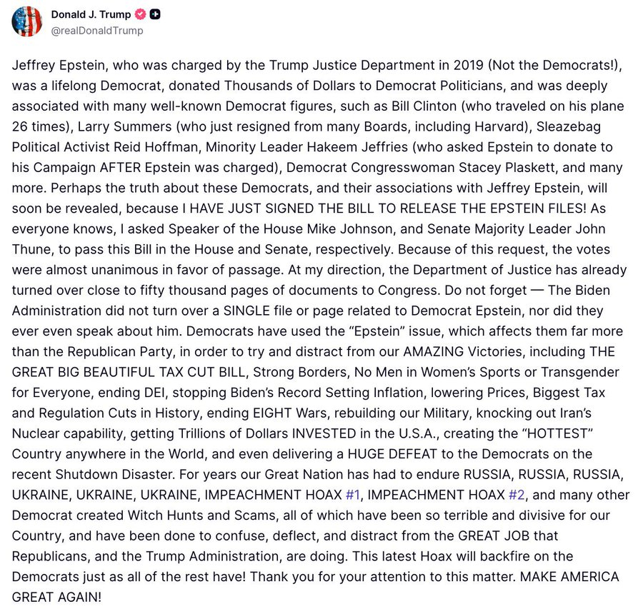 阿川宣布,他刚刚签署了公布爱泼斯坦档案的法案,帖子全文:杰弗里·爱泼斯坦于2019年被特朗普司法部(而非民主党!)起诉,他生前是民主党人,曾向民主党政客捐赠数千美元,并与许多知名的民主党人士关系密切,例如比尔·克林顿(曾26次乘坐他的私人飞机)、拉里·萨默斯(刚刚辞去包括哈佛大学在内的多个董事会职务)、卑鄙的政治活动家里德·霍夫曼、少数党领袖哈基姆·杰弗里斯(在爱泼斯坦被起诉后,杰弗里斯还要求爱泼斯坦向他的竞选活动捐款)、民主党众议员斯泰西·普拉斯克特等等。或许这些民主党人及其与杰弗里·爱泼斯坦的关系真相很快就会水落石出,因为我已经签署了公开爱泼斯坦档案的法案!众所周知,我已分别要求众议院议长迈克·约翰逊和参议院多数党领袖约翰·图恩在众议院和参议院通过这项法案。由于这项请求,投票结果几乎全票通过。在我的指示下,司法部已向国会提交了近五万页文件。请记住——拜登政府没有提交任何与民主党人爱泼斯坦有关的文件或资料,他们甚至从未提及过他。民主党人利用“爱泼斯坦”事件(该事件对他们的影响远大于对共和党的影响)来转移人们对我们取得的惊人胜利的注意力,这些胜利包括:伟大的减税法案、强大的边境、禁止男性参加女子体育运动、允许跨性别者平等、终止多元化、公平和包容性(DEI)、阻止拜登创纪录的通货膨胀、降低物价、历史上最大规模的减税和监管改革、结束八场战争、重建我们的军队、摧毁伊朗的核能力、吸引数万亿美元投资美国、打造世界上最“火热”的国家,甚至在最近的政府停摆灾难中给予民主党人沉重打击。多年来,我们伟大的国家不得不忍受“俄罗斯、俄罗斯、俄罗斯”、“乌克兰、乌克兰、乌克兰”、“弹劾骗局1”、“弹劾骗局2”以及其他许多民主党人炮制的政治迫害和骗局,所有这些都对我们的国家造成了极其严重的破坏和分裂,其目的在于混淆视听、转移视线,掩盖共和党和特朗普政府所做的伟大工作。这次最新的骗局终将像之前的骗局一样,反噬民主党!感谢您对此事的关注。让美国再次伟大!