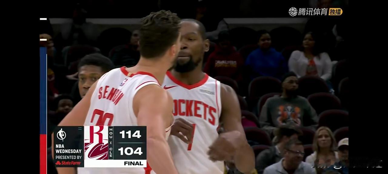 杜兰特20分!火箭114比104战胜骑士!申京28分,已经成为这支火箭队的绝对核心了! 火箭奥科吉跌出首发,最近几场首发连续挂零,毕竟昙花一现! 火箭第四节快跑不动了!米切尔单节17分,瞬间得分爆炸!打的火箭一个措手不及! 篮板球火箭51比39,骑士双塔莫布利和艾伦没有抢过火箭篮板球! 火箭队:申京28分10篮板7助攻!杜兰特20分3篮板3助攻!谢泼德12分! 骑士队:米切尔21分3板2助攻!亨特25分!莫布利18分6板!艾伦8分7板!
