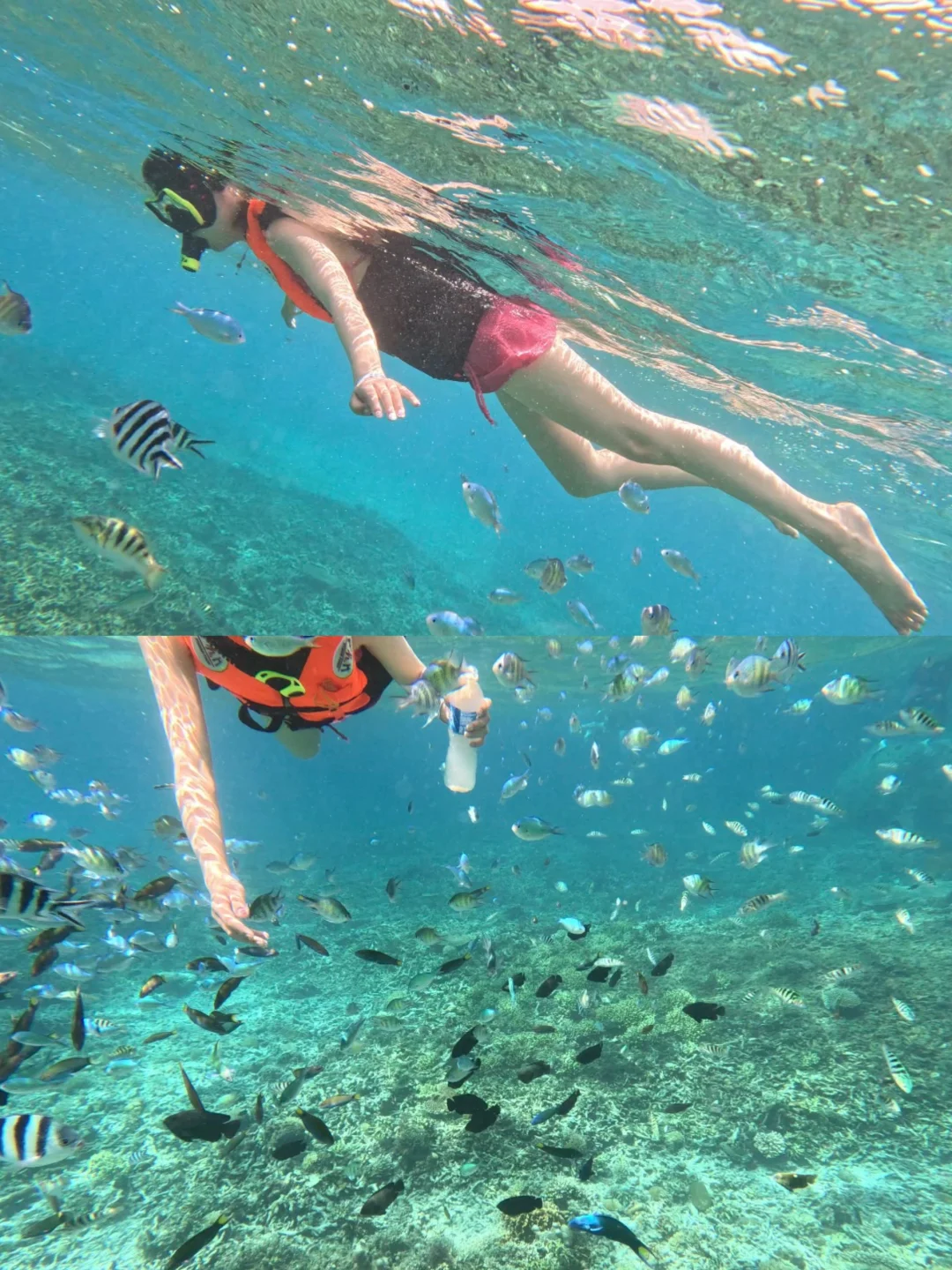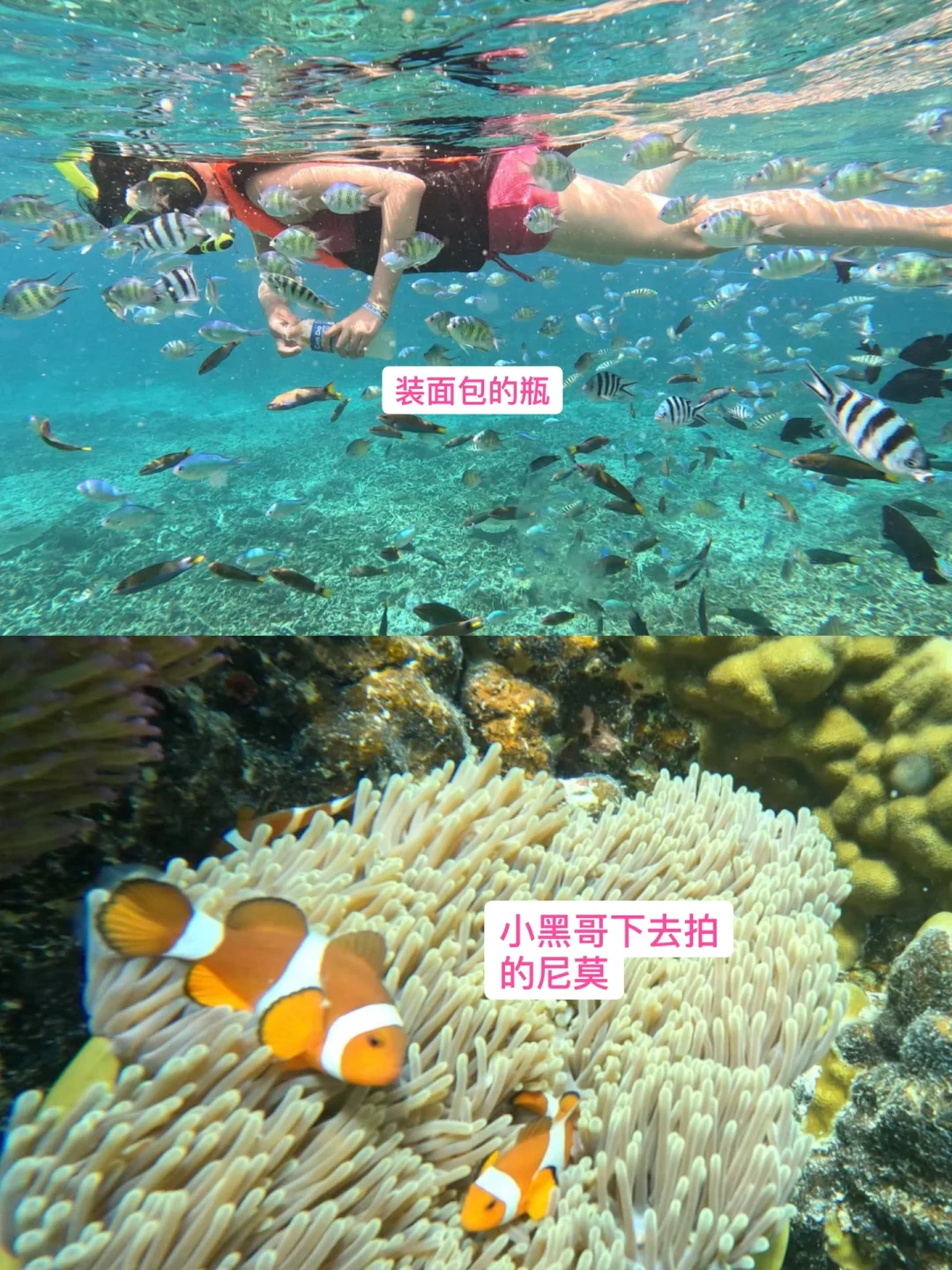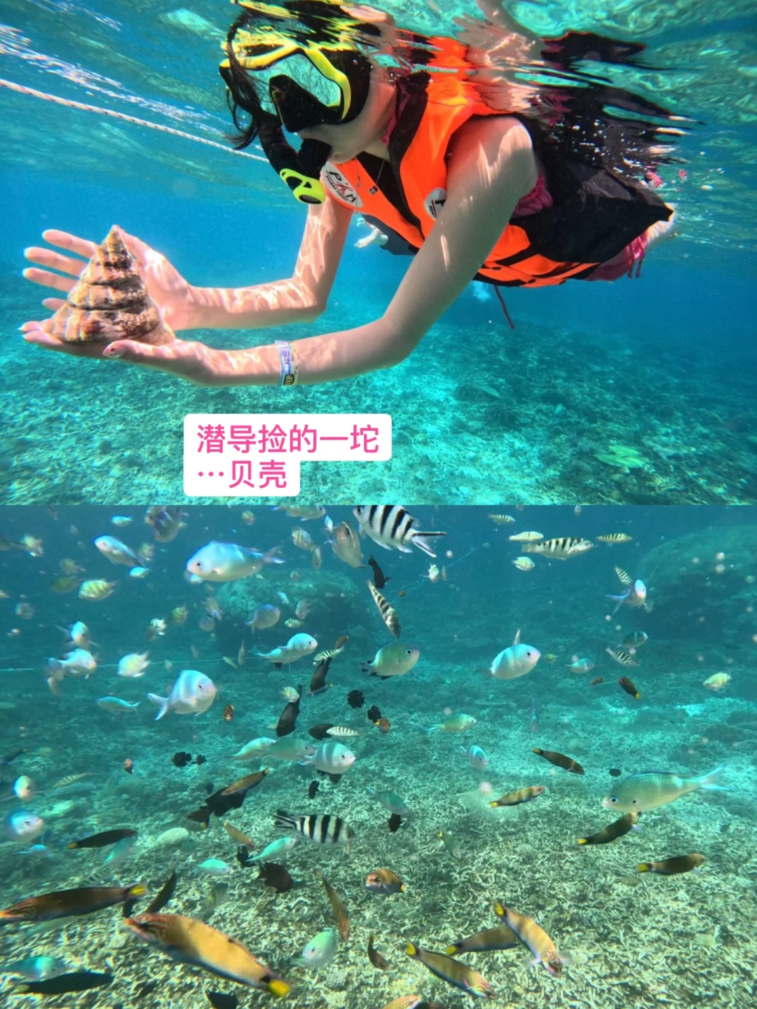 我跟领队说不会游泳🏊♀️,他找了一个小黑哥全程带着我,那天浪大,基本都是小黑哥拉着我游,全程帮我录视频拍照📸 每一潜都会带面包吸引小鱼过来给我拍照!简直不要太会!!身边环绕的都是小鱼,还会潜下去拍尼莫,捡贝壳给我拍照,但是不能带走,拍完就放回去了