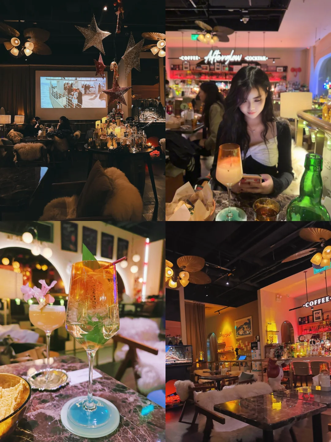 小食不好吃,我们也是饿了才点的,酒的造型很好看,颜值高,但配不上这个价位。7点准时去的没什么人,这家店氛围感十足,拍照很出片,还会放电影,是一家很浪漫的店,容易被搭讪