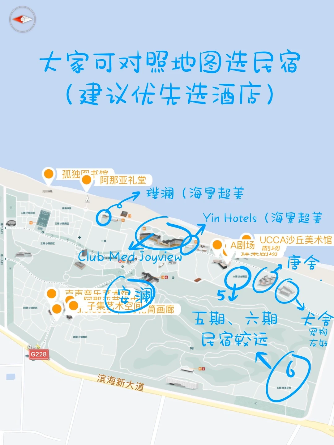 首先下载阿那亚App衣食住行游玩看展基本全靠它 - 🔹🔹交通🔹🔹 🚗自驾:很方便,北京出发4h左右能到达 🚄火车:坐到昌黎站(慢车)会近一些,票价也相对便宜,从昌黎打车到阿那亚约30左右;坐到北戴河(高铁/动车)打车约80-90 🚌班车:这个时🈶️时🈚️,具体可关注App(参加P8 - 🔹🔹住宿🔹🔹 建议住阿那亚社区内,有酒店/民宿两种选择 🏨酒店:经济实惠选安澜准没错,海景房可选璞澜、Yin hotels、Club med joyview,带宠物可选犬舍,等等按需选择 🏨民宿:建议大家对着地图选,因为园区很大,有的民宿离海边教堂很远,人少住民宿不划算,一家游玩或者人多适合住民宿 🌟住安澜一天24h无论在园区哪都可以免费用车,经常早上叫个车去海边看日出,看完再回酒店补觉💤 - 🔹🔹吃饭🔹🔹 社区有8个食堂及各种餐厅,食堂价格不贵,但餐厅有的挺贵的!关键还报吃,适合拍照,食堂有营业时间,错过就没有了。每天菜单都不一样,第二食堂是业主专用食堂 海风酒吧(巨坑,刚点完酒就端上来了,难喝的跟兑的似的。在海边,晚上吹吹海风还是很惬意的 - 🔸社区内有公交及站点 🔸社区内有食堂、艺术中心、电影院、运动场、图书馆、儿童乐园等等 🔸建议大家入住园区内酒店,真的会方便很多,而且淡季特别划算❗️ 🌟淡季:价格便宜,住过超便宜299一晚的安澜,还是跨年那2天。(当然也住过2k+一晚的😭价格波动真的很大)淡季人少一些,海边会很冷,海边的沙滩上会结冰,冬季的阿那亚非常美,人少好出片,就是冷 圣诞快到了,阿那亚圣诞氛围布景也很好看的,一般到跨年圣诞的布景都还没拆 🌟旺季:去哪里拍照人都很多,但夏天的阿那亚会经常举办一些活动,音乐节啦!还有露天电影院在沙滩上,非常有氛围感 - 阿那亚适合慢慢逛,疯狂打卡一天也能逛完。不过放松在这边呆个两三天,享受慢下来的生活,真的蛮惬意的。建议至少住一晚,可以早起看日出🌅 - 📷拍照Tips: 要想拍到无人的教堂,就是日出过后大家都回去补觉那会儿,海边、教堂、孤独的图书馆啦都没什么人,可以尽情的拍。遇上好天气怎么拍都是大片 iPhone日出的时间很准,提前半小时就可以驱车前往海边啦