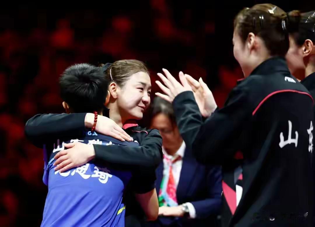 陈梦哭了,在山东乒乓球女团3比2击败河北队夺冠后,陈梦激动地抱着赢下关健局的范思崎,流下了泪水。 山东女乒的陈梦,带几位没有名气的球员参加团体比赛。一路过关斩将,进前8,冲进半决赛,战胜多路好手,挺进决赛。 决赛对手是名气最大的孙颖莎带领的河北队,有多名国手参赛。况且,孙颖莎势头正猛,在全运会女单夺冠后,女团夺冠的呼声很高。 陈梦参加了双打和单打王添艺的比赛都赢下为团队得2分,孙颖莎两场单打得2分。关健的第5局按规则,由山东能打硬仗的范思琦对河北国手何卓佳。 何卓佳不愧乒坛老手,干净利落赢下前2局,河北队胜利在望。但范思崎在陈梦及教练的指导鼓励下,顽强拼博,连扳3局,反败为胜! 在那一刻,山东女团的姑娘们高兴地抱在一起庆祝。陈梦,在球场满场的喝倒彩时没掉过泪,在被王曼昱半决赛淘汰时没流泪,范思崎赢下关健局后,她直用手抹眼泪。