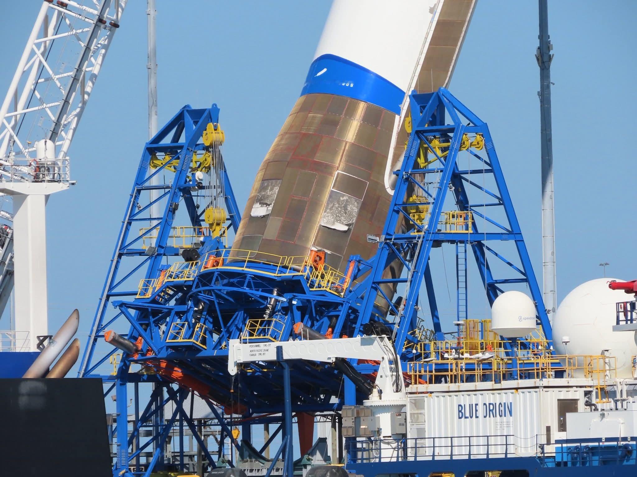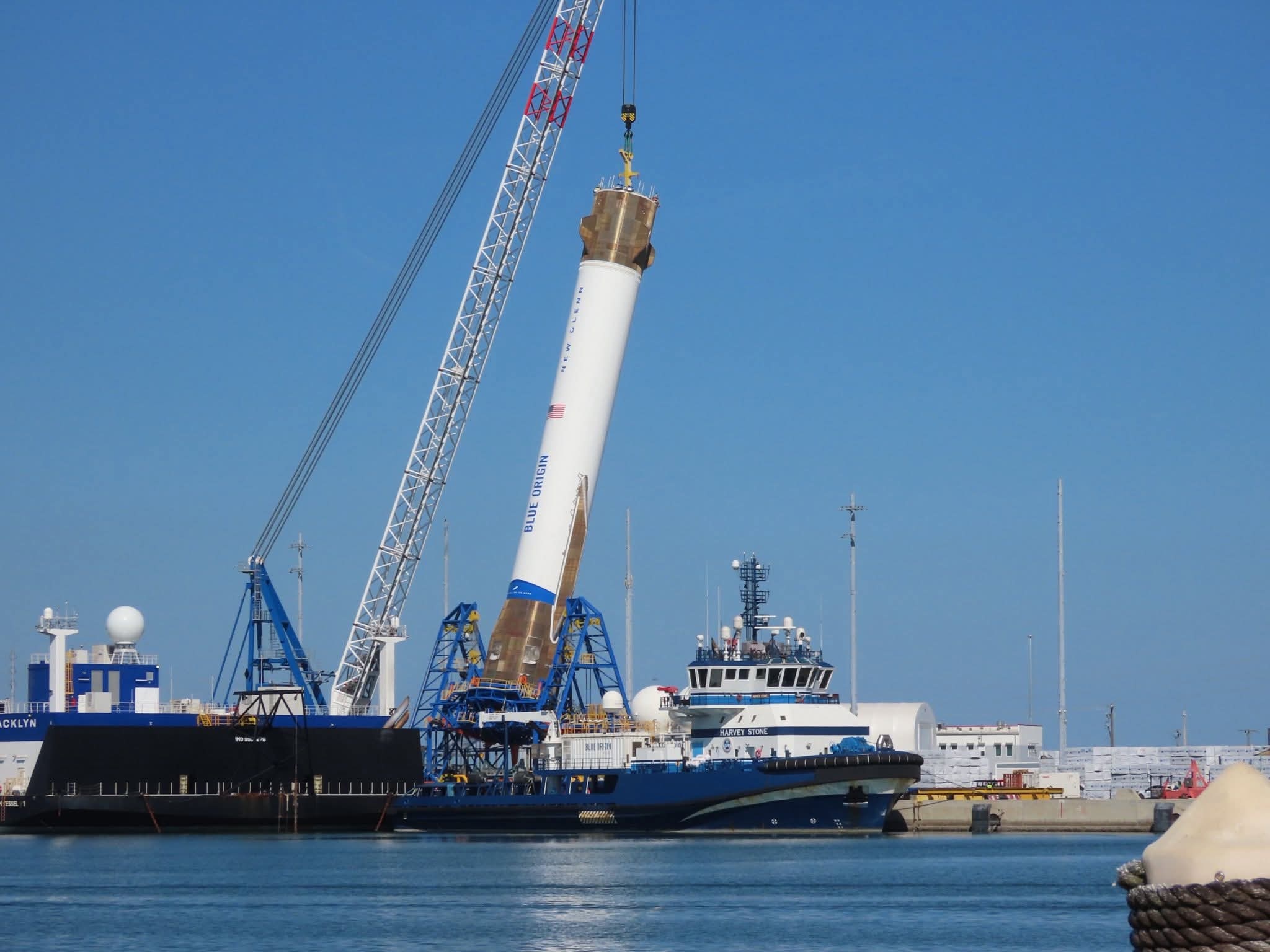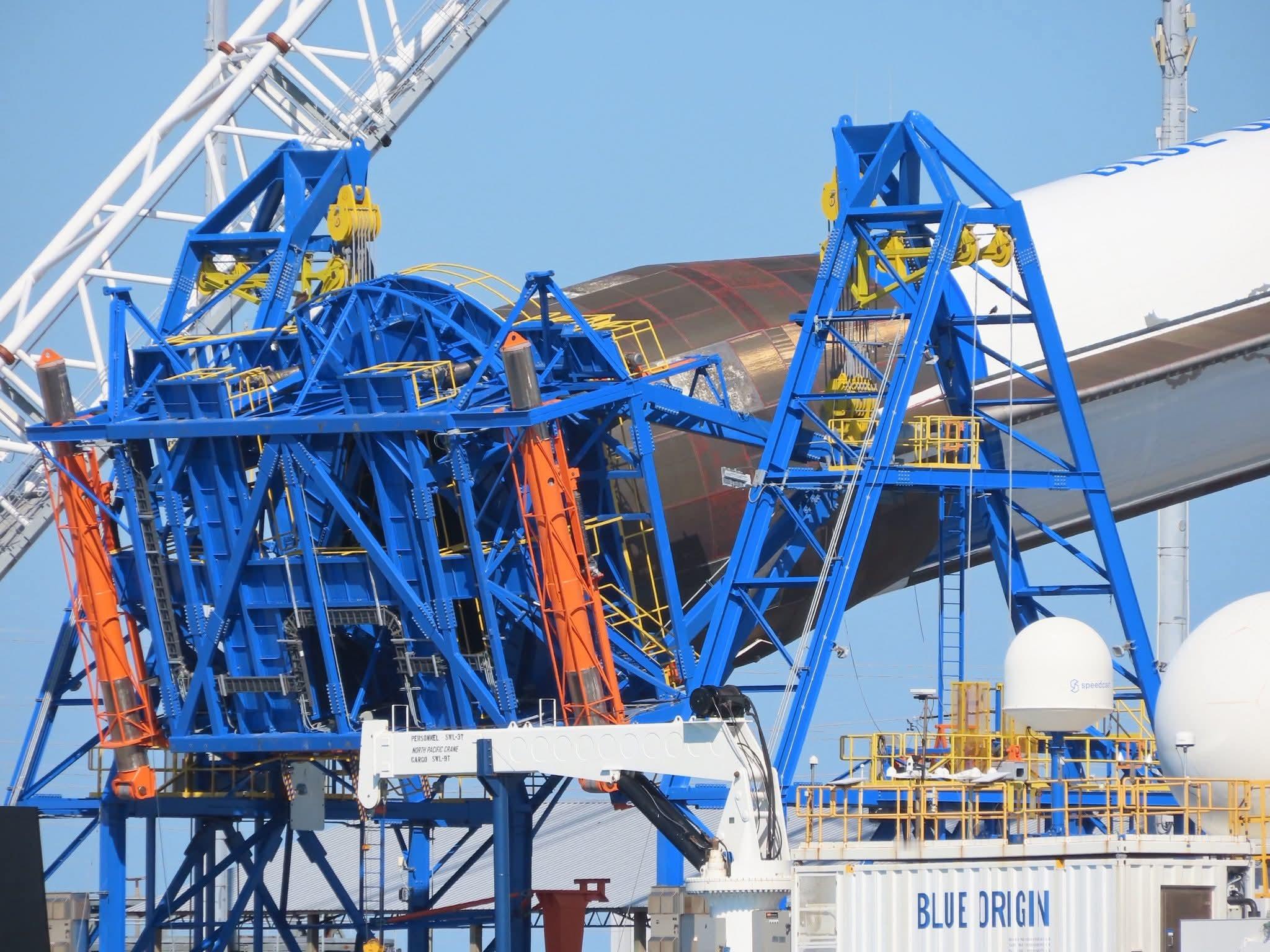 昨天在卡纳维拉尔港,蓝色起源正在利用翻转装置对回收的新格伦火箭一级助推器进行水平放置作业。