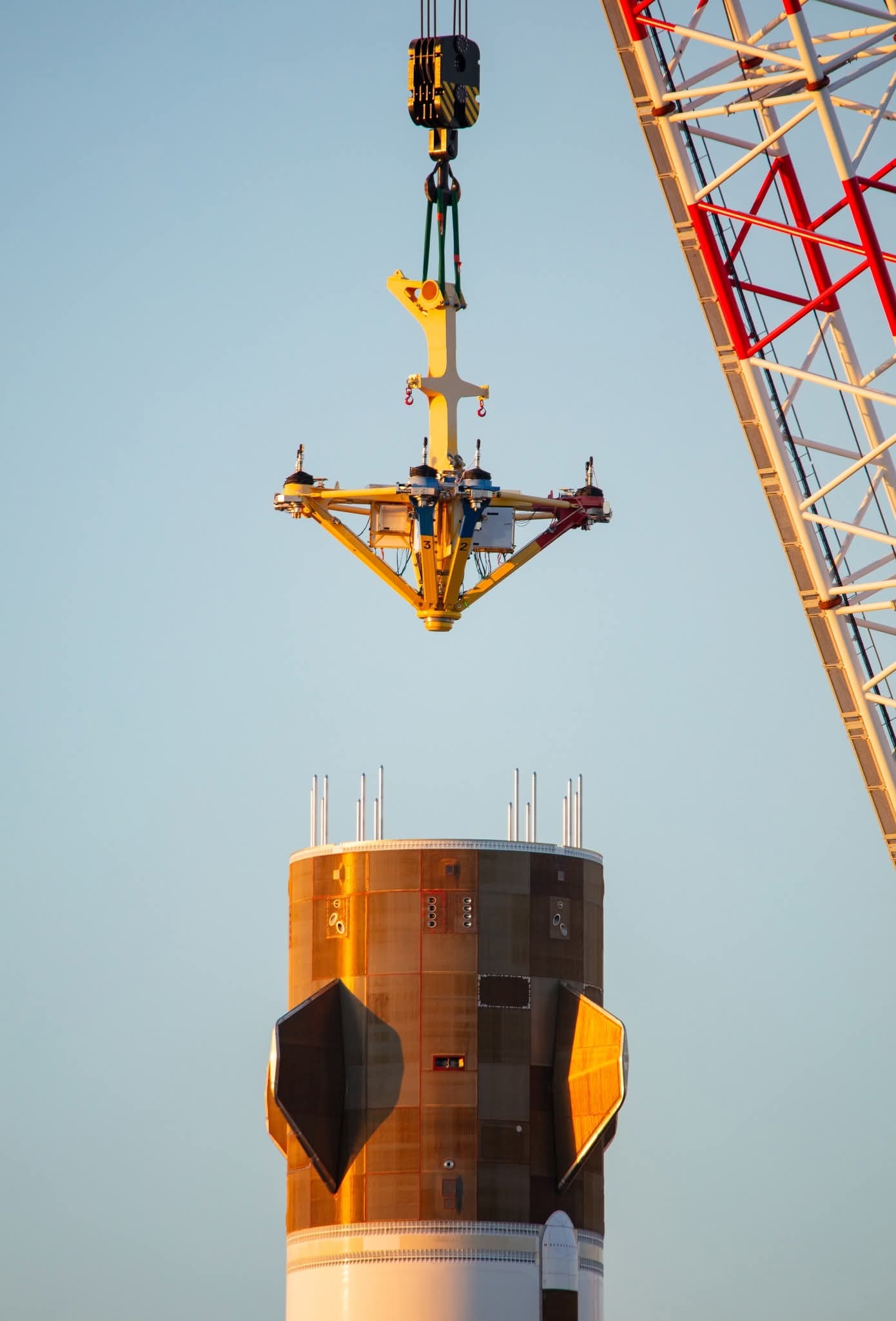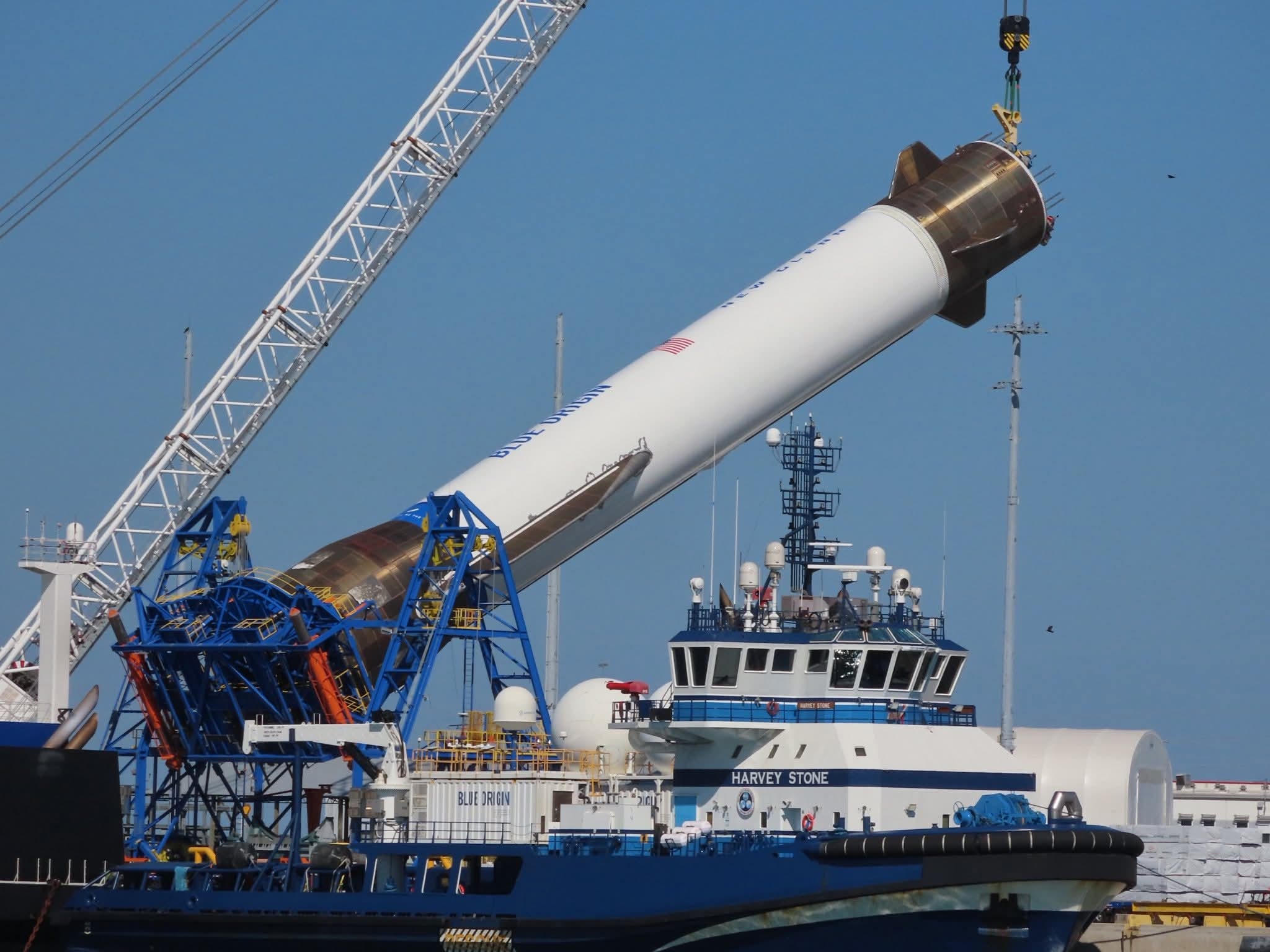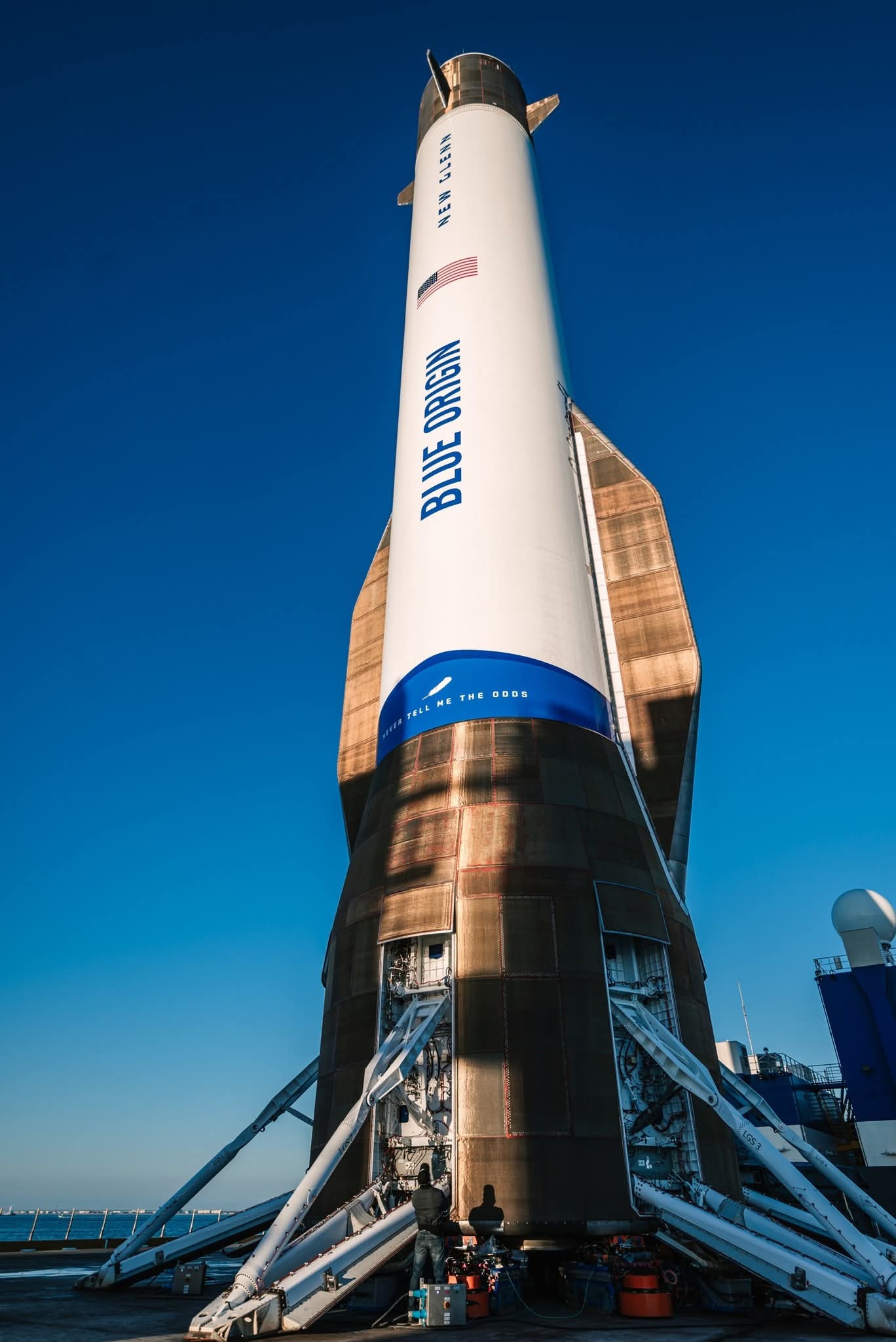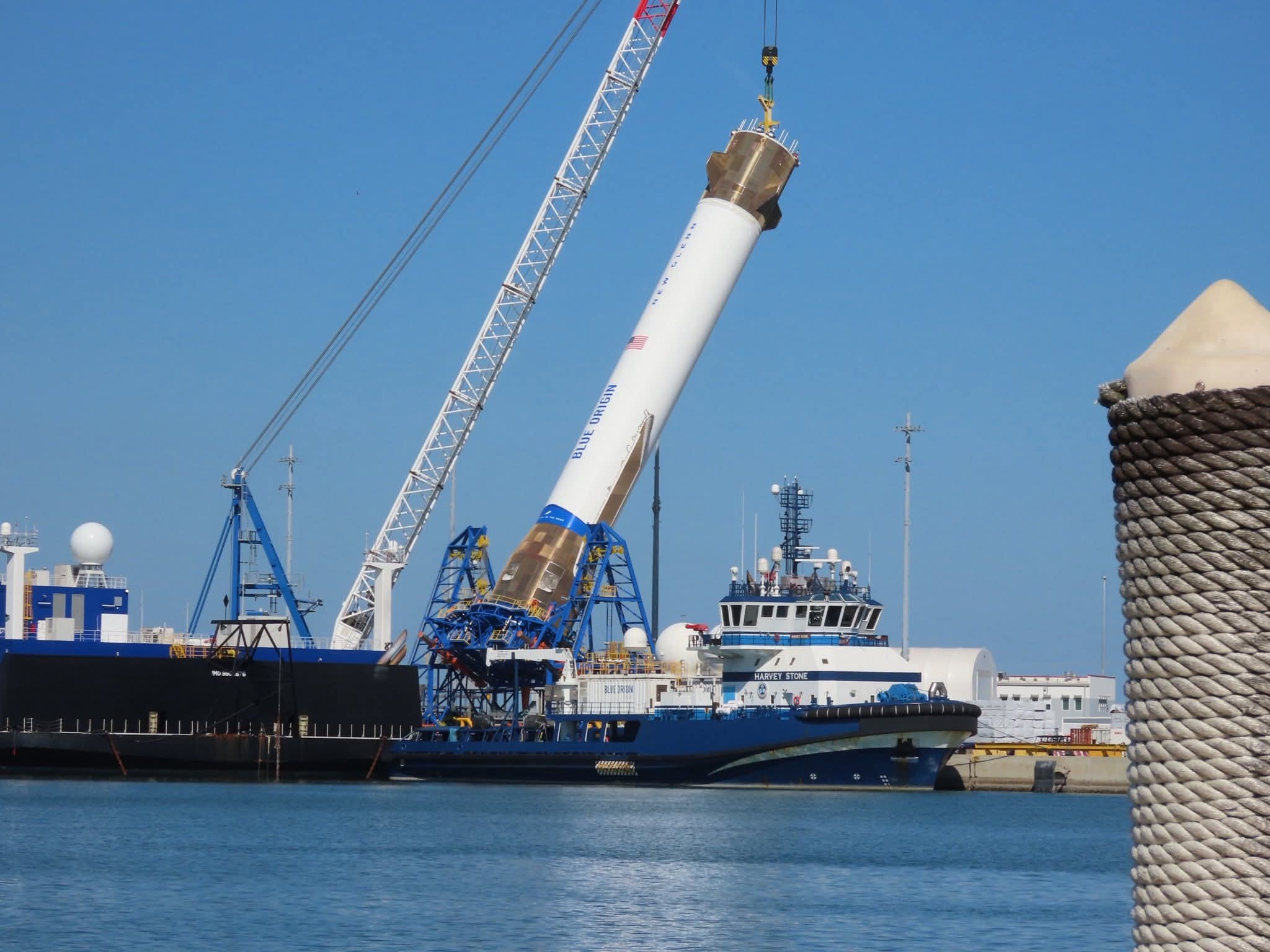 昨天在卡纳维拉尔港,蓝色起源正在利用翻转装置对回收的新格伦火箭一级助推器进行水平放置作业。