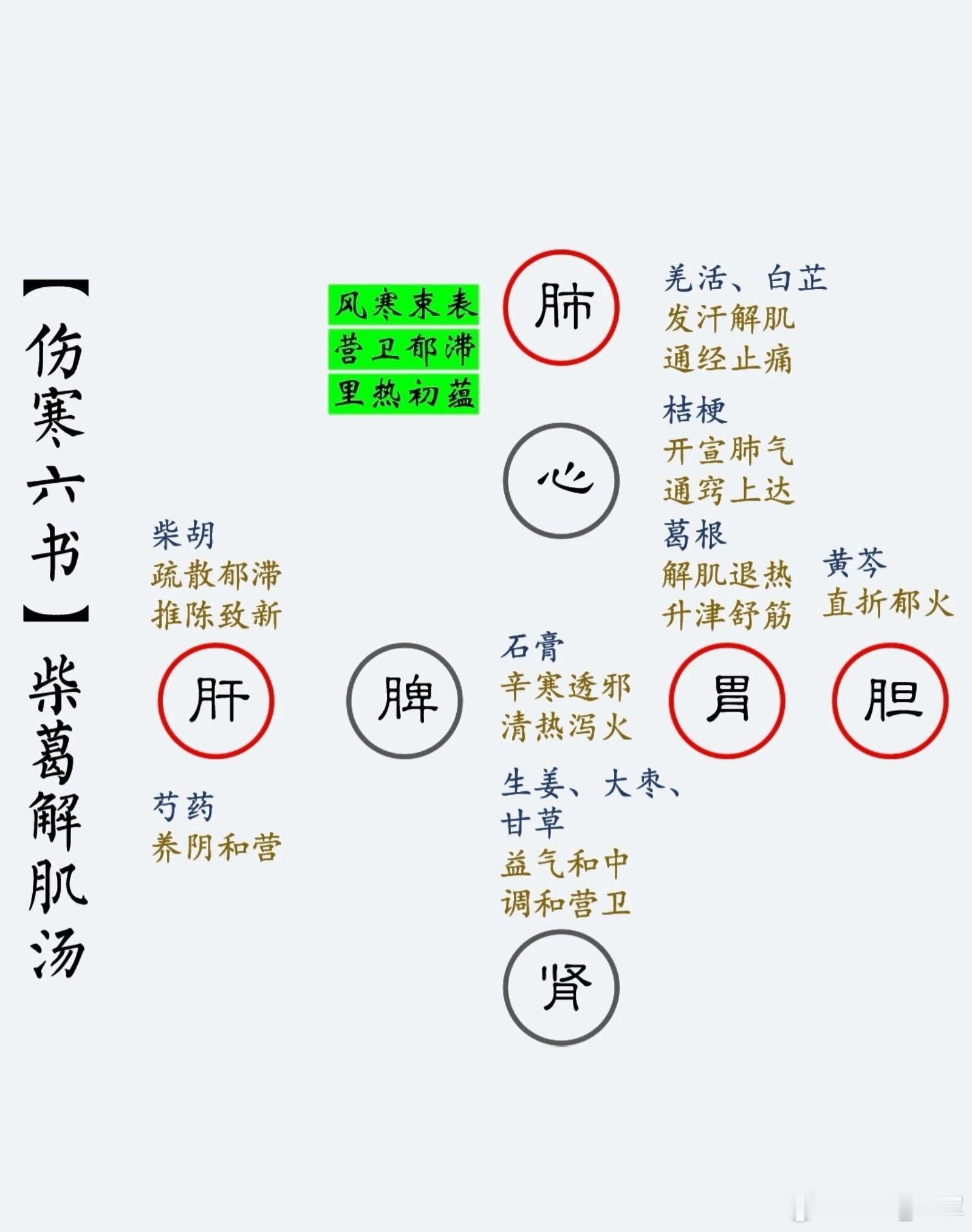 柴葛解肌汤(《伤寒六书》)组成:柴胡(3g)、干葛(9g)、甘草(3g)、黄芩(6g)、羌活(3g)、白芷(3g)、芍药(6g)、桔梗(3g)(原著本方无用量)。用法:水二盅,加生姜三片,大枣二枚,槌法加石膏末一钱(3g),煎之热服(现代用法:水煎温服)。功用:解肌清热。主治:外感风寒,郁而化热证。恶寒渐轻,身体增盛,无汗头痛,目疼鼻干,心烦不眠,咽干耳聋,眼眶痛,舌苔薄黄,脉浮微洪。证治机理:本方所治证候太阳风寒未解,化热入里。外感风寒,本应恶寒较甚,而此恶寒渐轻,身热增盛者,为寒郁肌腠逐渐化热所致。因表寒未解,故恶寒仍在,并见头痛、无汗等症。阳明经脉起于鼻,经眼眶下行;少阳经脉行于耳后,经面颊到眶下。入里之热初犯阳明、少阳,故目痛鼻干、眼眶痛、咽干、耳聋;热扰心神,则见心烦不眠;脉浮而微洪是外有表邪,里有热邪之征。此证乃太阳风寒未解,郁而化热,渐次传入阳明,波及少阳,故属三阳合病。治宜辛凉解肌,兼清里热。方解:方中葛根味辛性凉入阳明,外透肌热,内清郁热;柴胡味辛性寒入少阳,善于祛邪解表退热。二药相须,解肌清热之力著,共用为君。羌活、白芷助君药辛散发表,并止诸痛;黄芩、石膏清泄里热,俱为臣药。其中葛根配白芷、石膏,清透阳明之邪热;柴胡配黄芩,透解少阳之郁热;羌活发散太阳之风寒。如此配合,三阳兼治,治阳明为主。桔梗宣畅肺气以利祛邪外出;芍药、大枣益阴养血,既防热邪伤阴,又制疏散太过;生姜发散风寒,均为佐药。甘草调和药性,为使药。配伍特点:本方温清相伍,三阳并举,表里同治,重在疏泄透散。辨证要点:本方为治疗太阳风寒未解,入里化热,初犯阳明或三阳合病之常用方。以发热重,恶寒轻,头痛,眼眶痛,鼻干,脉浮微洪为辨证要点。使用注意:原书各药均未著用量,但用法中注明石膏为一钱,表明入里之热不甚,用量不宜过大,免大寒之性,有碍辛凉之品解肌疏散。