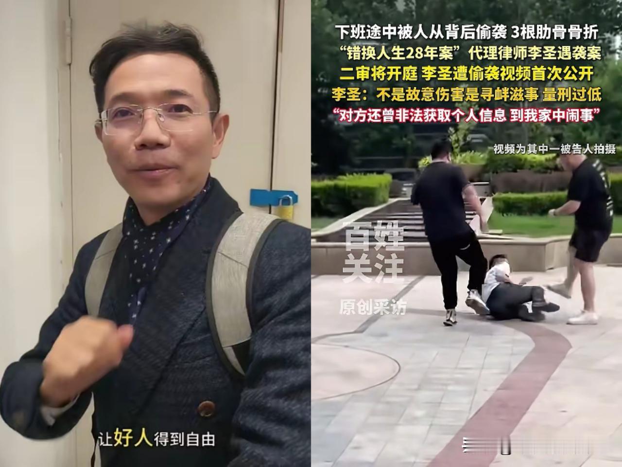 李圣律师被袭现场这一幕太让人气愤了 大家发现没 李圣代理错换人生案时被两人背后偷袭,被打成轻伤二级,三根肋骨骨折,法院一审判主谋王某一年九个月,他觉得量刑太轻要抗诉。 更过分的是李圣的老母亲被找到住处殴打,对方想逼他放弃案子,结果他还是把主谋告上法庭,王某上诉却称自己是被索要三万块才给的,这说法把自己说成受害者,听着就离谱。 坚持为当事人维权却遭此对待,这样的律师不该被更多人支持吗?