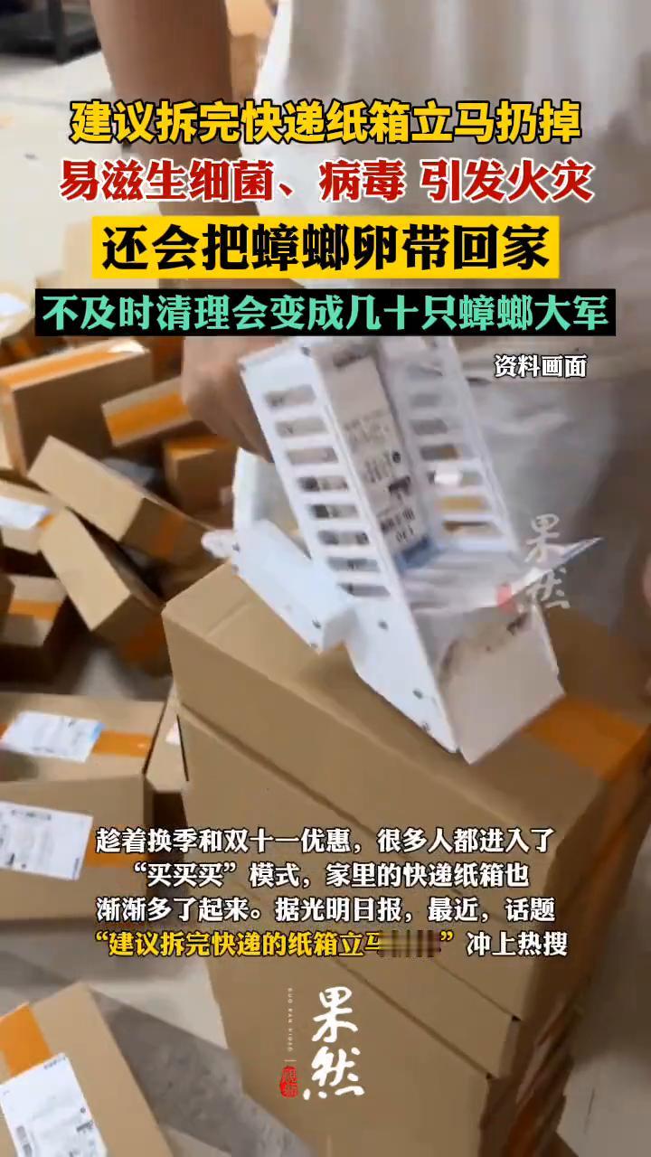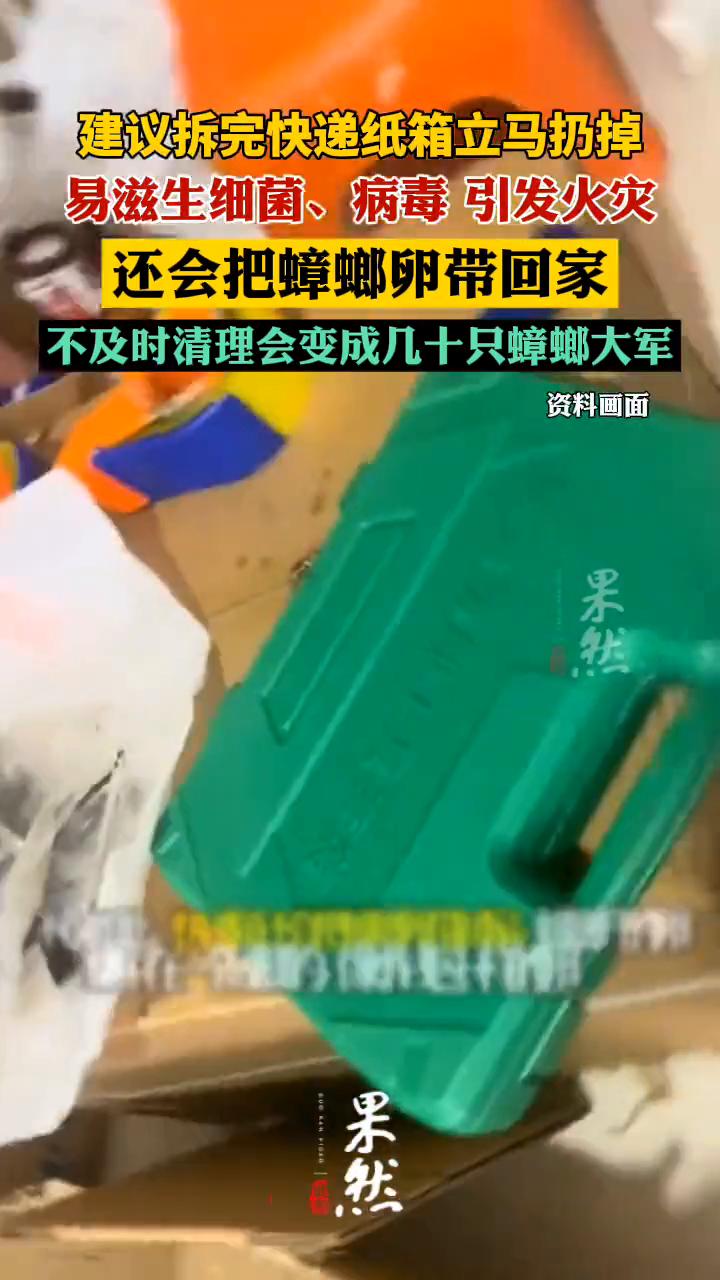 建议拆完快递纸箱立马扔掉,易滋生细菌、病毒引发火灾。 果然。 趁着换季和双十一优惠,很多人都进入了"买买买"模式,家里的快递纸箱也渐渐多了起来。据光明日报,最近话题"建议拆完快递的纸箱立马扔掉"冲上热搜。 囤积的快递纸箱易释放TVOCs,可能含有大肠杆菌、金黄色葡萄球菌、沙门氏菌等细菌;诺如病毒、带状疱疹病毒等病毒,还有可能引发火灾。不仅如此,快递箱还会把蟑螂卵带回家。蟑螂产的卵集中在一个硬质的、像小钱包一样的卵鞘里,里面包含数十枚卵,堪称"蟑螂压缩包"。不及时清理很快就能变成几十只蟑螂大军。纸箱甲醛 废纸箱收纳盒