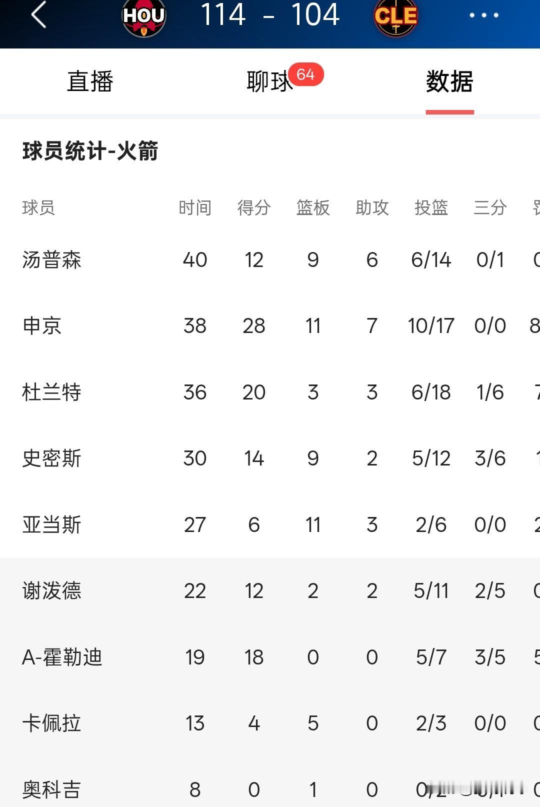 NBA积分榜丨火箭5连胜升至西部第二,火箭114-104客胜骑士,火箭队拿到一波5连胜,总战绩10胜3负升至西部第二。 火箭反客为主第-节打出33-19,上半场结束时火箭队已经领先17分,三节打完骑士队追到3分,火箭末节轰下40分锁定胜局。 本场比赛奥科吉回到替补席,火箭队篮板球51-39领先,申京28分11板7助,杜兰特20分3板3助,火箭队6人得分上双。