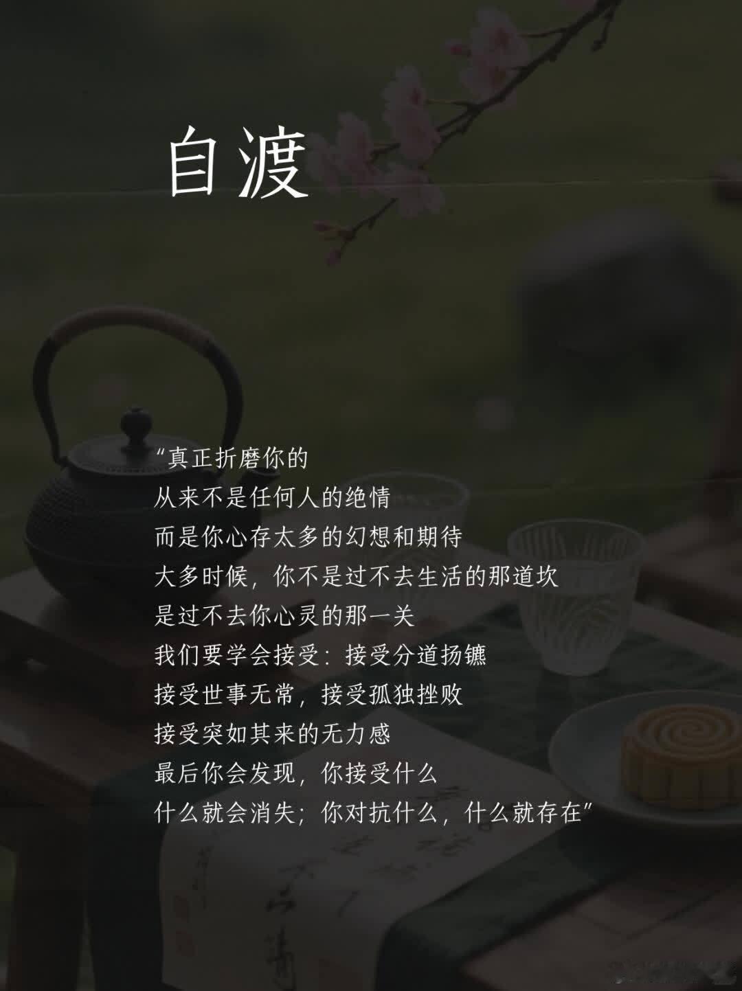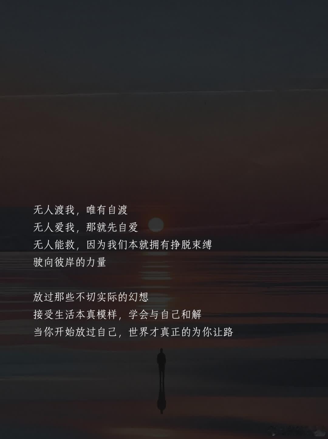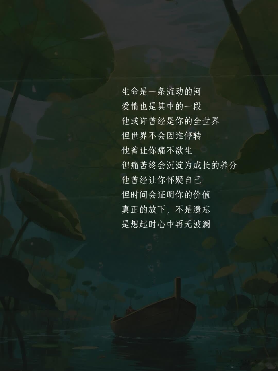 自渡 “真正折磨你的, 从来不是任何人的绝情, 而是你心存太多的幻想和期待。 大多时候,你不是过不去生活的那道坎, 是过不去你心灵的那一关。 我们要学会接受:接受分道扬镳, 接受世事无常,接受孤独挫败, 接受突如其来的无力感。 最后你会发现,你接受什么, 什么就会消失;你对抗什么,什么就存在。” 是的,困住我们的往往是自己。 不是外面的风雨有多大, 而是心里的执念太深。 世界本就在无声地抚慰着我们, 只是我们总和自己较劲,不肯放过自己。 年轻时,笃信“所爱隔山海,山海皆可平”, 觉得爱情无所不能, 总期待一个圆满的结局, 或者是一个救赎自己的人。 那时的勇气炽热滚烫,仿佛取之不尽。 后来才明白,最难平的其实是人心。 那些为爱付出的真心, 有时换不来同等的珍惜, 留下的伤痕最终结成了保护自己的茧。 我们学会了在风雨中独自撑伞, 修补生活的裂缝。 曾经像李商隐笔下“春蚕到死丝方尽”般耗尽心力去爱, 后来发现那份不顾一切的冲动, 如同耗尽的电量,再难充满。 我们见过自己最狼狈的样子: 深夜无声的泪水,掌心掐出的月牙, 还有那些辗转反侧、怀疑自己的时刻。 而最痛的领悟是:没有人会来。 哭到窒息时,纸巾要自己擦; 醉到街头时,回家的路得自己走; 翻看旧信息时,不会有那句“我在”。 我们曾苦苦等待一个拯救者, 最终懂得能真正把自己拉出泥潭的,只有自己。 生命是一条流动的河, 爱情也是其中的一段。 他或许曾经是你的全世界, 但世界不会因谁停转; 他曾让你痛不欲生, 但痛苦终会沉淀为成长的养分; 他曾经让你怀疑自己, 但时间会证明你的价值。 真正的放下,不是遗忘, 是想起时心中再无波澜。 所以 我们学着向内求, 不再向外苦苦追求答案, 而是回归内心, 寻找那份属于自己的平静。 学会自爱, 如同黑塞所启示的不再执着于“被爱”, 而是先学会珍视自己,滋养自己。 学会独自坚强,即使无人撑伞, 也要在雨中清晰辨认自己的模样; 即使拥抱曾经带来的荆棘, 仍有勇气拥抱生活。 学会与遗憾和解, 允许遗憾存在, 但心要朝向阳光生长。 无人渡我,唯有自渡。 无人爱我,那就先自爱。 无人能救,因为我们本就拥有挣脱束缚、 驶向彼岸的力量。 放过那些不切实际的幻想, 接受生活本真模样,学会与自己和解。 当你开始放过自己,世界才真正的为你让路。