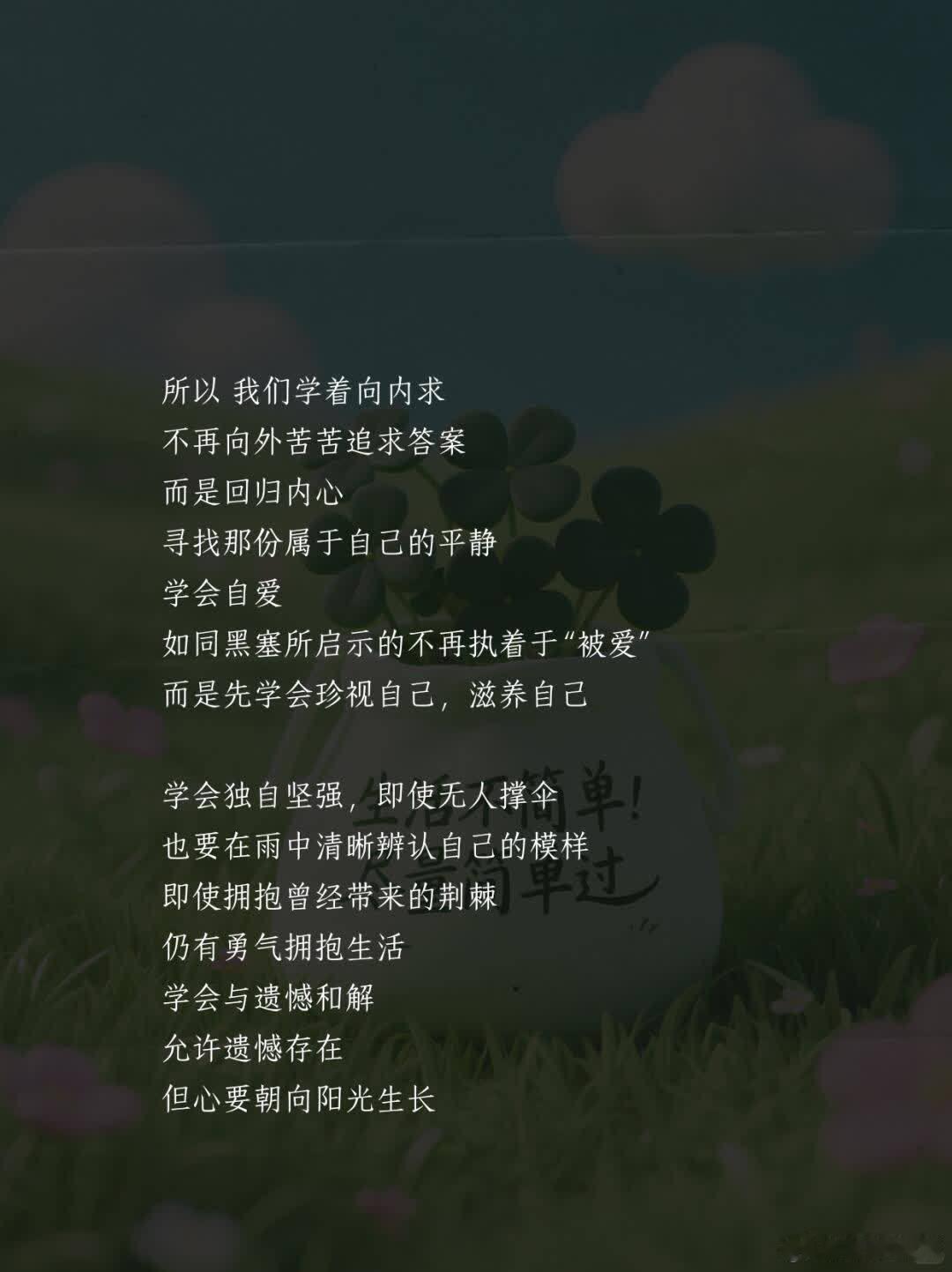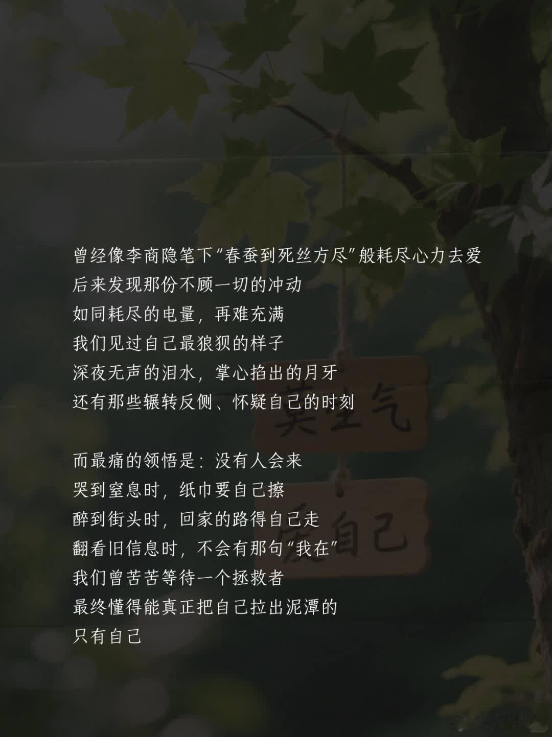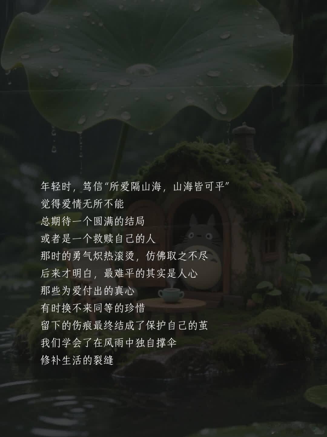 自渡 “真正折磨你的, 从来不是任何人的绝情, 而是你心存太多的幻想和期待。 大多时候,你不是过不去生活的那道坎, 是过不去你心灵的那一关。 我们要学会接受:接受分道扬镳, 接受世事无常,接受孤独挫败, 接受突如其来的无力感。 最后你会发现,你接受什么, 什么就会消失;你对抗什么,什么就存在。” 是的,困住我们的往往是自己。 不是外面的风雨有多大, 而是心里的执念太深。 世界本就在无声地抚慰着我们, 只是我们总和自己较劲,不肯放过自己。 年轻时,笃信“所爱隔山海,山海皆可平”, 觉得爱情无所不能, 总期待一个圆满的结局, 或者是一个救赎自己的人。 那时的勇气炽热滚烫,仿佛取之不尽。 后来才明白,最难平的其实是人心。 那些为爱付出的真心, 有时换不来同等的珍惜, 留下的伤痕最终结成了保护自己的茧。 我们学会了在风雨中独自撑伞, 修补生活的裂缝。 曾经像李商隐笔下“春蚕到死丝方尽”般耗尽心力去爱, 后来发现那份不顾一切的冲动, 如同耗尽的电量,再难充满。 我们见过自己最狼狈的样子: 深夜无声的泪水,掌心掐出的月牙, 还有那些辗转反侧、怀疑自己的时刻。 而最痛的领悟是:没有人会来。 哭到窒息时,纸巾要自己擦; 醉到街头时,回家的路得自己走; 翻看旧信息时,不会有那句“我在”。 我们曾苦苦等待一个拯救者, 最终懂得能真正把自己拉出泥潭的,只有自己。 生命是一条流动的河, 爱情也是其中的一段。 他或许曾经是你的全世界, 但世界不会因谁停转; 他曾让你痛不欲生, 但痛苦终会沉淀为成长的养分; 他曾经让你怀疑自己, 但时间会证明你的价值。 真正的放下,不是遗忘, 是想起时心中再无波澜。 所以 我们学着向内求, 不再向外苦苦追求答案, 而是回归内心, 寻找那份属于自己的平静。 学会自爱, 如同黑塞所启示的不再执着于“被爱”, 而是先学会珍视自己,滋养自己。 学会独自坚强,即使无人撑伞, 也要在雨中清晰辨认自己的模样; 即使拥抱曾经带来的荆棘, 仍有勇气拥抱生活。 学会与遗憾和解, 允许遗憾存在, 但心要朝向阳光生长。 无人渡我,唯有自渡。 无人爱我,那就先自爱。 无人能救,因为我们本就拥有挣脱束缚、 驶向彼岸的力量。 放过那些不切实际的幻想, 接受生活本真模样,学会与自己和解。 当你开始放过自己,世界才真正的为你让路。