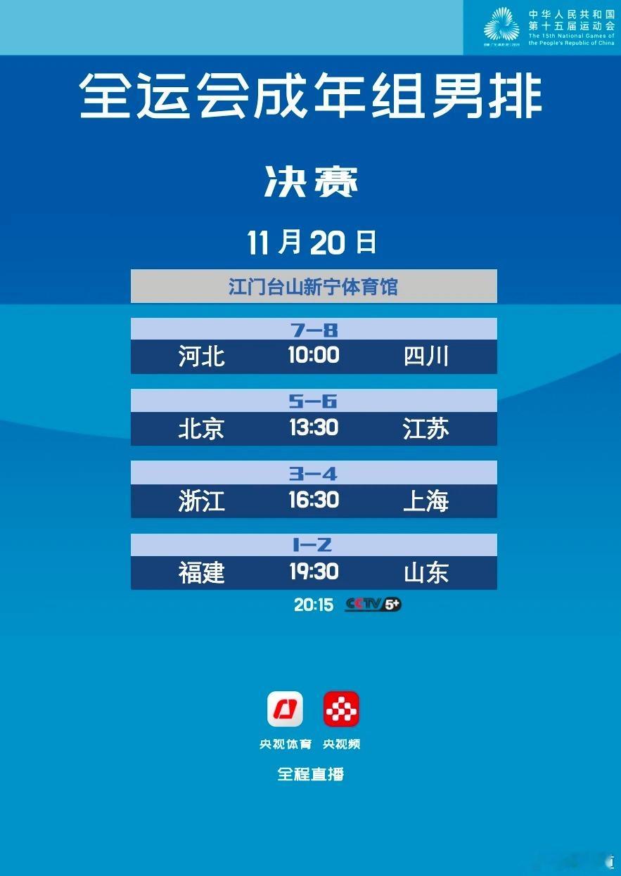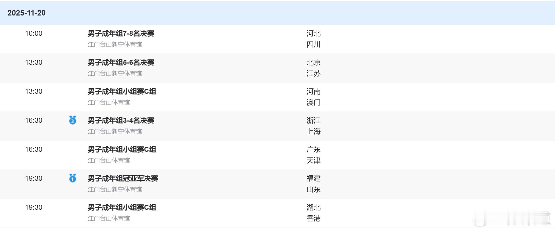 11月20日 星期四 男子成年组赛程10:007-8名决赛:河北 vs 四川13:305-6名决赛:北京 vs 江苏小组赛C组:河南 vs 澳门16:303-4名决赛:浙江 vs 上海小组赛C组:广东 vs 天津19:30冠亚军决赛:福建 vs 山东小组赛C组:湖北 vs 香港