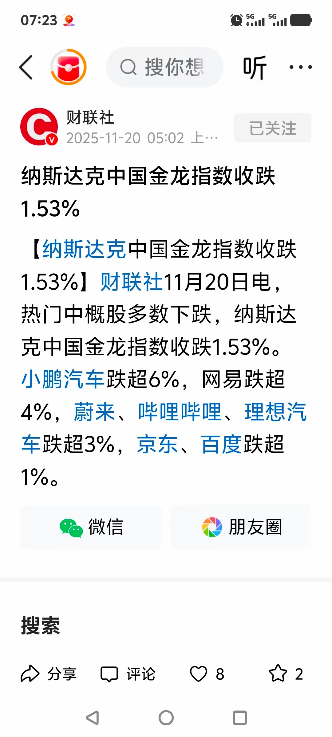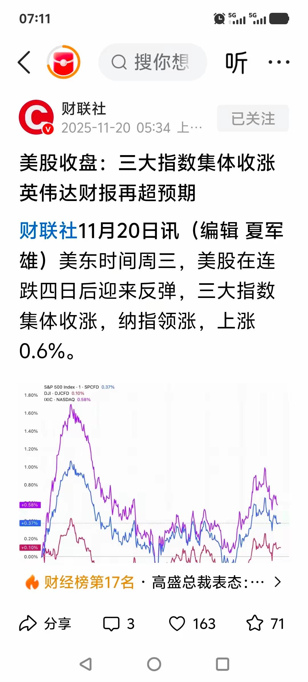 大家期待和观望的数据来了!近段时间全球投资者持观望态度,期待某个财报数据落地,这不数据来了,且超预期了!昨夜英伟达公告:三季度财报收入750亿美元,环比增长22%,同比增长62%。英伟达财报超预期公告后,带动美股三大指数均收涨:道指收涨0.10%,纳指收涨0.59%,标普500指数收0.38%,大型科技股多数上涨。然而,中国纳斯达克金龙指数却收跌1.53%,中概股多数下跌。全球股市调整是不是受这个财报的影响呢?今天就能得出结论!早安: