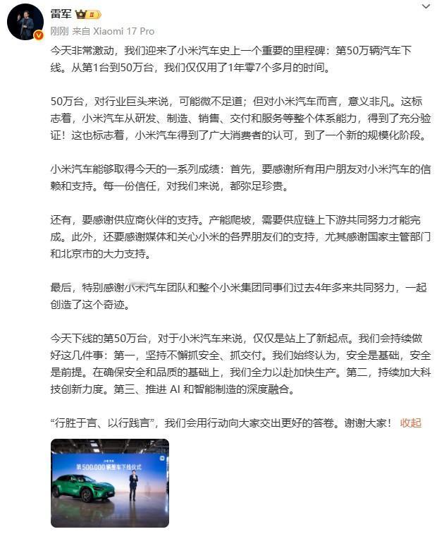 11月20日,小米汽车官宣第50万辆整车正式下线。 从首辆交付(2024年3月28日)至50万辆整车下线用时602天(不到20个月),刷新全球新能源车企最快纪录。 作为对比,特斯拉达成同样成绩需30个月,理想需40个月。 雷总现场强调安全是基础,继续推进AI赋能智能制造,提升制造业效率极限。 值得一提的是,小米汽车全年35万辆的销售目标大概率提前完成,冲击40万辆大关。【来自懂车帝车友圈】