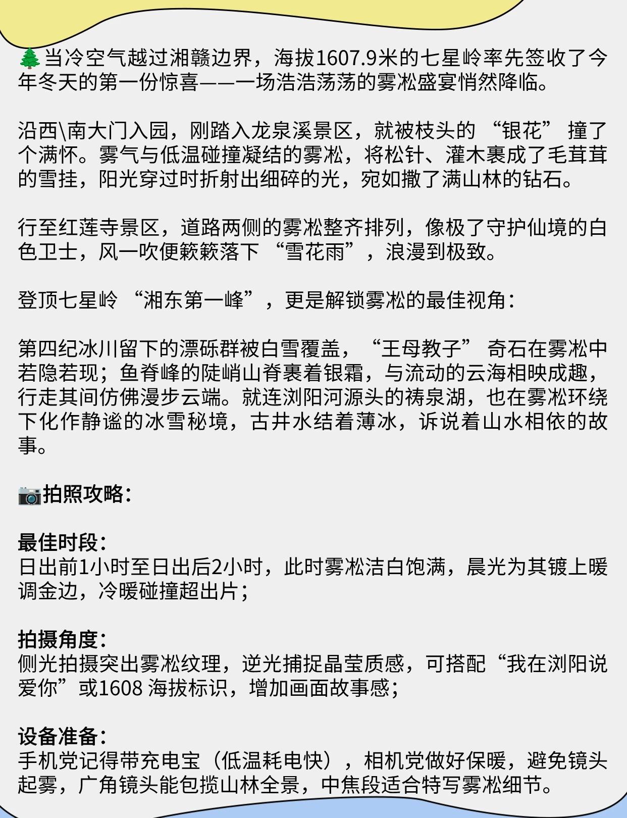 初雪映山❄️!大围山今冬第一场雾凇出现! ➡️当冷空气越过湘赣边界,海拔1607.9米的七星岭率先签收了今年冬天的第一份惊喜——一场浩浩荡荡的雾凇盛宴悄然降临。 · 沿西\南大门入园,刚踏入龙泉溪景区,就被枝头的 “银花” 撞了个满怀。雾气与低温碰撞凝结的雾凇,将松针、灌木裹成了毛茸茸的雪挂,阳光穿过时折射出细碎的光,宛如撒了满山林的钻石。 · 行至红莲寺景区,道路两侧的雾凇整齐排列,像极了守护仙境的白色卫士,风一吹便簌簌落下 “雪花雨”,浪漫到极致。 · ⛰️登顶七星岭 “湘东第一峰”,更是解锁雾凇的最佳视角: 第四纪冰川留下的漂砾群被白雪覆盖,“王母教子” 奇石在雾凇中若隐若现;鱼脊峰的陡峭山脊裹着银霜,与流动的云海相映成趣,行走其间仿佛漫步云端。就连浏阳河源头的祷泉湖,也在雾凇环绕下化作静谧的冰雪秘境,古井水结着薄冰,诉说着山水相依的故事。 · 📷拍照必看: 雾凇美景转瞬即逝,想要定格这份浪漫,这些技巧一定要记牢: ✅最佳时段:日出前1小时至日出后2小时,此时雾凇洁白饱满,晨光为其镀上暖调金边,冷暖碰撞超出片; ✅拍摄角度:侧光拍摄突出雾凇纹理,逆光捕捉晶莹质感,可搭配“我在浏阳说爱你”或1608 海拔标识,增加画面故事感; ✅设备准备:手机党记得带充电宝(低温耗电快),相机党做好保暖,避免镜头起雾,广角镜头能包揽山林全景,中焦段适合特写雾凇细节。 · 🚶‍♀️路线推荐:自驾从西大门入园,依次游览龙泉溪→红莲寺→七星岭,海拔越高雾凇越密集,务必给车辆装防滑链; · ⚠️安全提示:走大路避开暗冰,山间气温低,羽绒服、雪地靴、手套缺一不可;出发前可拨打景区咨询电话0731—83488701,确认雾凇现状; · 信息 | 图源:大围山森林公园 综合整理:长沙本地宝 长沙雾凇 大围山 大围山雾凇 大围山的雾凇 南方人看雪的快乐 走进冬日山野 赏雪好去处 冬日雪景拍照 轻松无障碍看雾凇