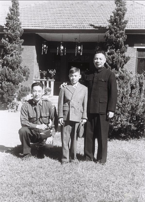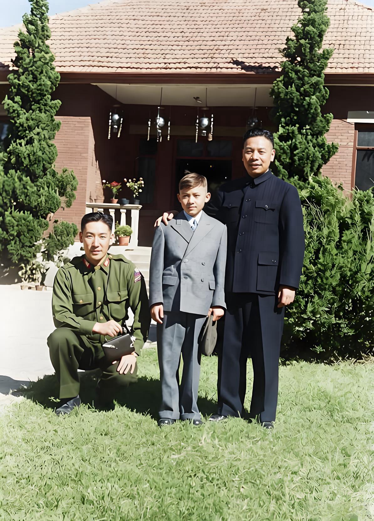 1946年7月7日,时任国民党中央干部学校要职的蒋经国,与年幼的长子蒋孝文和中校军衔的蒋纬国合影于首都南京的蒋家官邸庭院中。