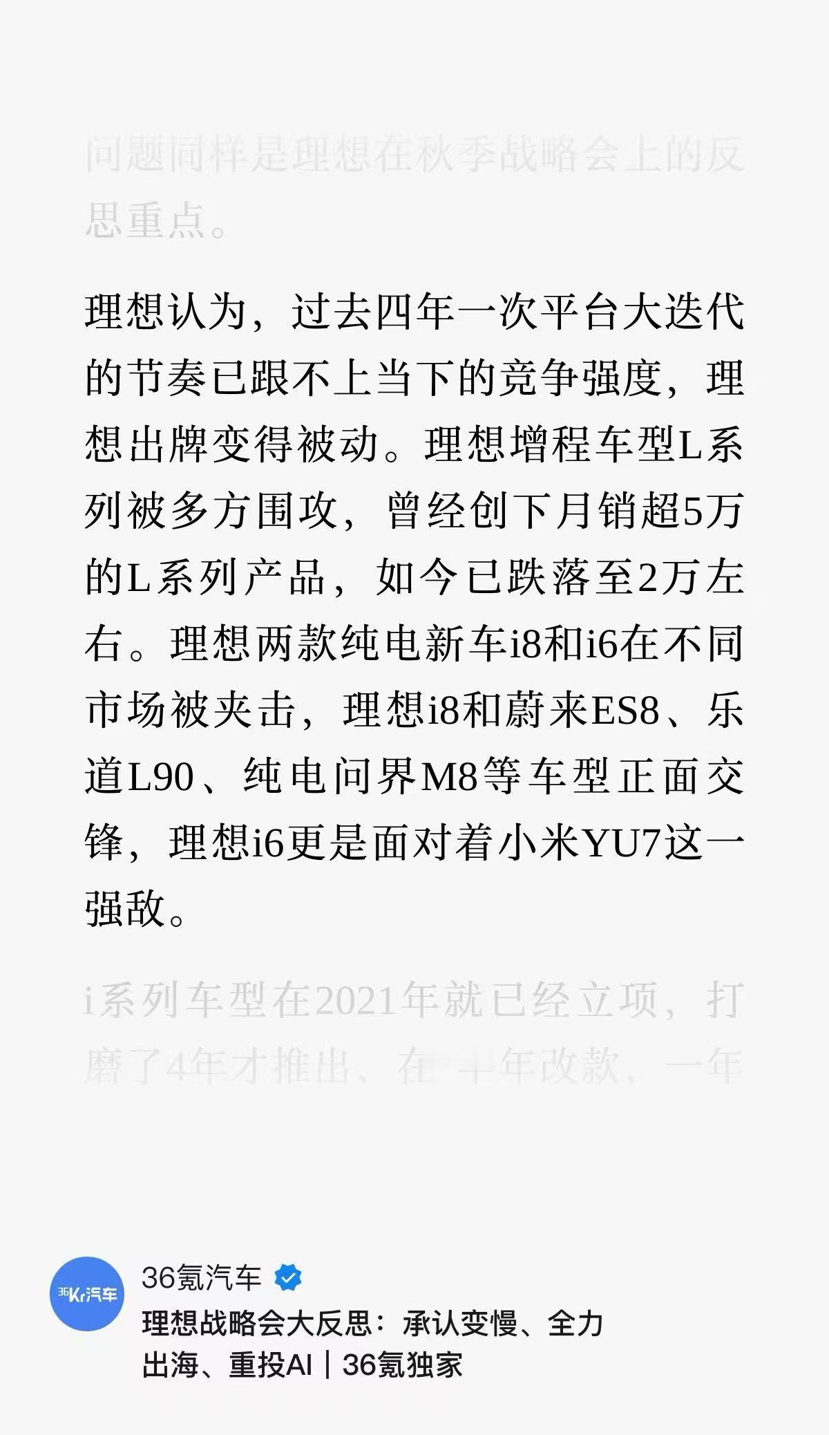 理想早期之所以能占据优势,因为当时没有遇到强有力的竞争对手,面对的也多是从传统赛道刚转型的车企。这种相对宽松的竞争环境,让理想在战略上产生了一些误判。不过,他们已经意识到了这个问题。
