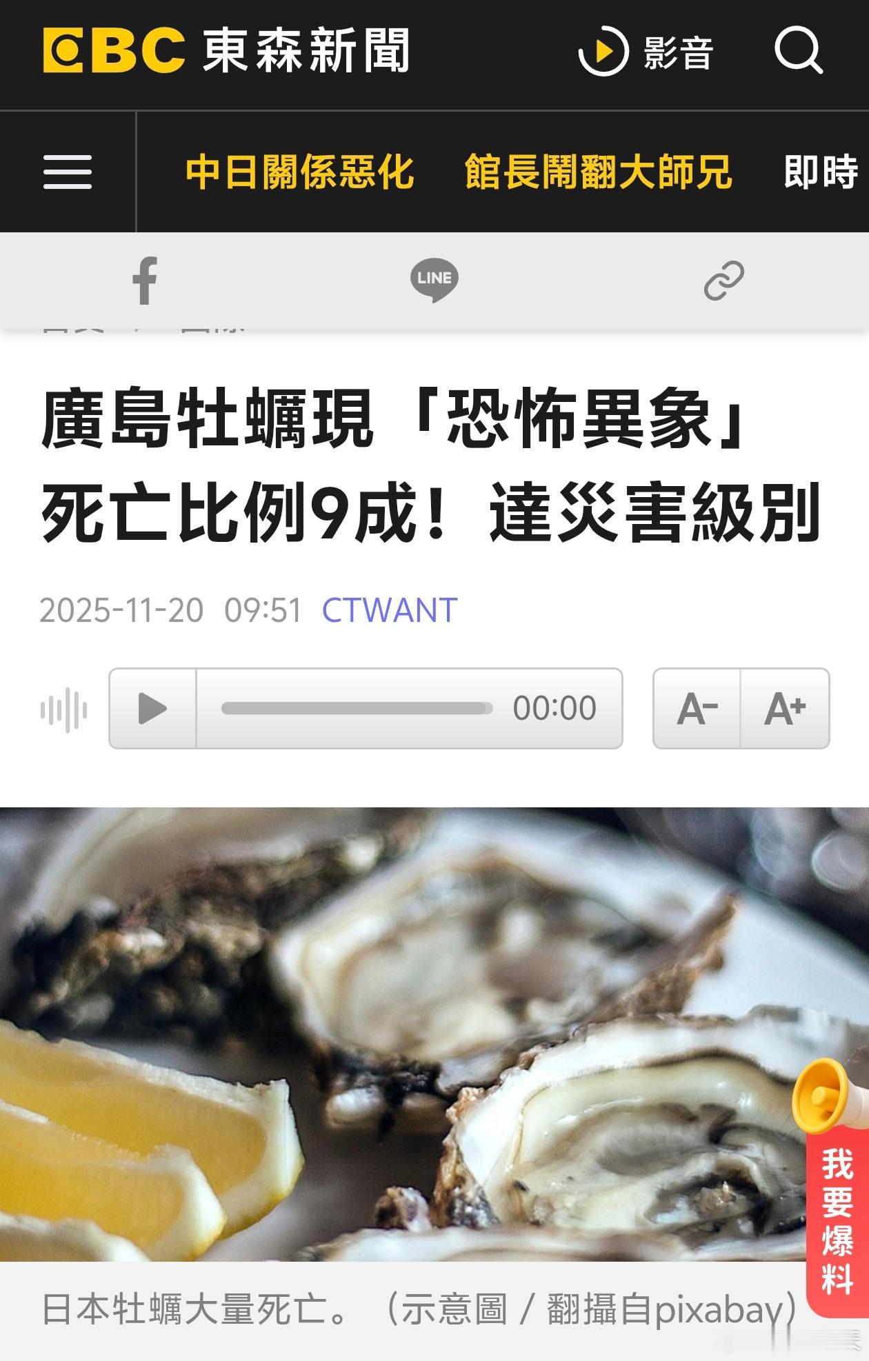 广岛牡蛎现「恐怖异象」死亡比例9成!达灾害级别广岛县向来以日本第一的养殖牡蛎(生蚝)产量闻名,但今年秋季开始,原本该迎来丰收的海域却接连传出牡蛎大量死亡的警讯。自上月开始收成以来,广岛县中部与吴市等沿岸地区的渔场灾情愈发严重,不少养殖业者通报死亡比例高达9成,产量大幅下滑。日本专家此前多次表示原因不明,近期解释称今年夏季异常酷热导致海水温度长时间偏高,再加上降雨稀少,使海水盐分浓度提升,可能让牡蛎无法承受环境变化,产生生理障碍并大量死亡。广岛县知事汤崎英彦则直言:「目前的状况已是灾害级别。」他强调「说到广岛就想到牡蛎」的品牌价值不能受损,并透露县府正研议金融支援与新型养殖技术的研究补助,希望在环境快速变动的时代,为产业找到新的生存方式。