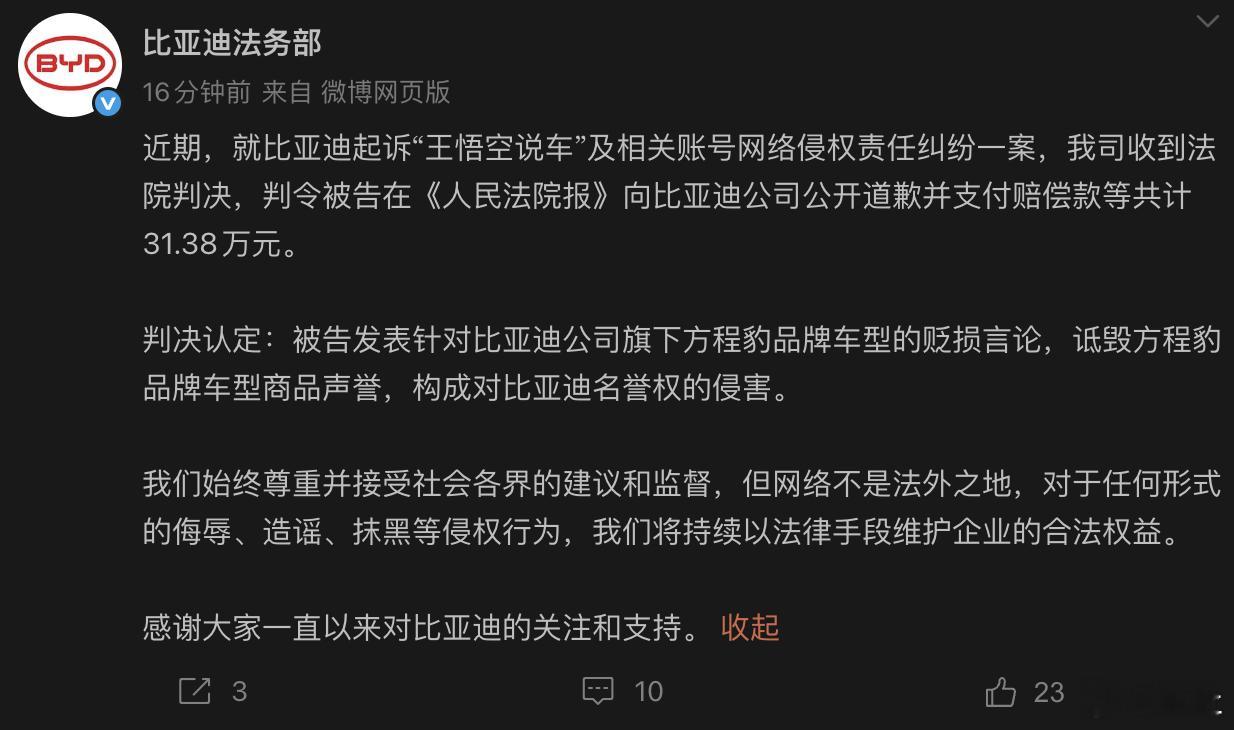 比亚迪法务部冲拳出击了!!比亚迪法务部今日发文,近期,就比亚迪起诉“王悟空说车”及相关账号网络侵权责任纠纷一案,我司收到法院判决,判令被告在《人民法院报》向比亚迪公司公开道歉并支付赔偿款等共计 31.38 万元。