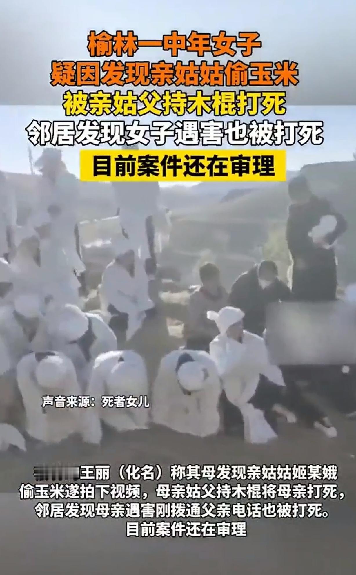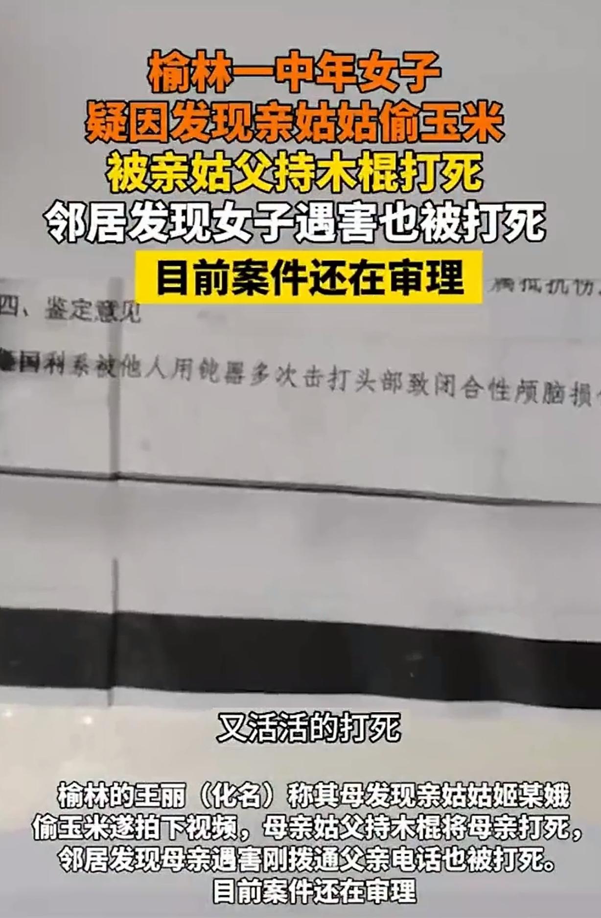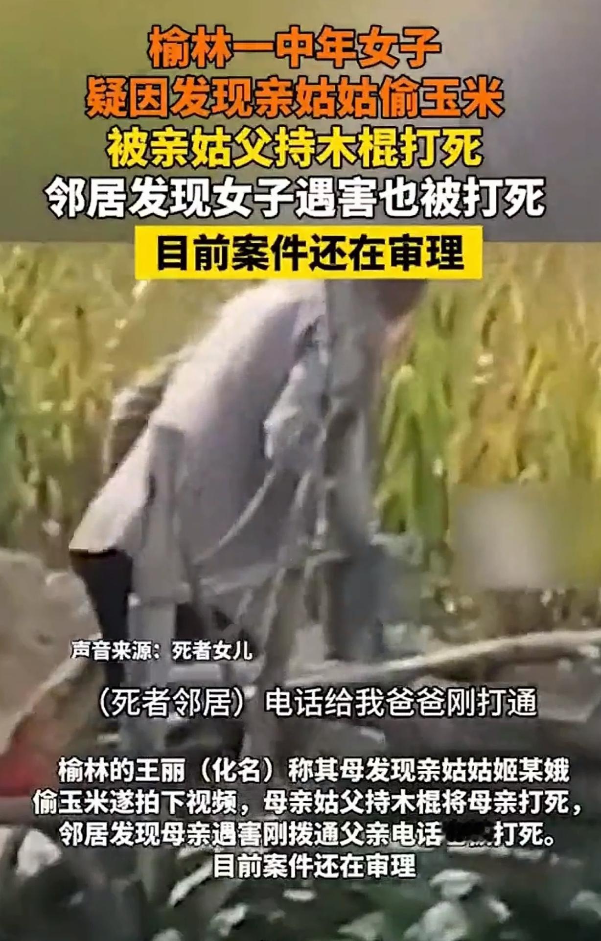 “真是无法无天!”陕西榆林,一女子发现亲姑姑偷自家玉米,她就姑姑不承认,随手拍下视频,万万没想到,姑父一棒子把她打死了,邻居看到女子被害,赶紧给女子丈夫打电话,又被姑父活活打死。网友:以前肯定有过节,不然不会这么狠。 2025年5月27日的早晨,姬女士在帮女儿王丽收拾储草坑时,猛一抬头,发现亲姑姑姬某娥在偷自家玉米。 按理说亲姑姑,如果想吃玉米,言语一声随便掰,能吃多少呀,都是一家人还用得着偷吗,就是非亲非故的乡亲们,谁想吃,吱一声,进地里随便掰。 但姬某娥可不是掰几个玉米煮了吃,而是拿着大麻袋,还鬼鬼祟祟,姬女士一看就怒从心起,这个姑姑小偷小摸,贪小便宜出了名了,竟然偷到自己侄女头上了。 姬某没有上去制止,而是拿出手机偷拍了视频,她怕姑姑扭头就不承认,说自己诬陷她,然后倚老卖老,拿辈分压人,到时候自己就说不清楚了。 没想到,姑姑发现姬女士拍视频,竟然勃然大怒先发制人,跟姬女士吵了起来。 然后,姑姑直接跑回家,把姬女士姑父王某叫来,这下可不得了了,王某手里拿着手腕粗的木棒,气势汹汹来了。 见到姬女士后,王某不由分说,劈头盖脸用木棒往姬女士脑袋上打了几十下。 姬女士没想到姑父会打她,等她反应过来,已经倒地不起血流如注。 王某打完人扬长而去,可怜的姬女士,血肉模糊,当场身亡。 过了一会,邻居老陈来给姬女士帮忙储草,看到躺在血泊中的姬女士已经被害,吓得他倒吸一口凉气,赶紧哆哆嗦嗦掏出手机,给姬女士丈夫打电话。 可老陈刚打通电话,还没来的及说话,就被王某从背后当头一棒,毫无防备的老陈应声倒地,木棒又雨点一般打在他身上,他毫无招架之力,很快也遇难了。 当天,王丽没在家,他弟弟最终发现母亲和老陈的尸体报了警,2小时后,凶手被抓捕归案,可到目前为止,姬女士的亲姑姑还逍遥法外。 母亲和邻居老陈出事后,王丽悲痛欲绝,她本身就是贫苦的农民,生了四个孩子,每天为了养家糊口,没有能力和时间对母亲尽孝,可子欲养而亲不待,母亲竟然以这样的方式离开了她,她无法接受。 包括老陈的儿子也是一样,父亲为人随和,乐善好施,乡里乡亲谁家有事都乐于帮忙。 案发当日,父亲去给王丽家帮忙储草,看到姬女士被害,拍了两张照片,然后准备给王丽父亲报信,却被王某认为多管闲事,乱棍打死。 他们想不通,为啥王某如此猖狂,妻子偷人家玉米,他不但不制止,还行凶,导致两条生命遭遇不测,两个家庭随之破裂。 目前,姬某娥只收到了行政处罚,而王某的案件正在审理。 是真搞不明白了,几个玉米闹出2条人命!为啥要偷?自己亲戚的别说要,但凡你说想吃了,不得掰一麻袋给你?那些说城市套路深,想要回农村的看看吧,农村是个什么样! 两家估计早已不和,这姑父也是恶魔一个,在我们这,亲戚进菜地随便拿,不用通报,过后再说一声就行,哪怕路过看到正在拿,都会笑着说多拿点,不会当做来偷的。 玉米引发的悲剧:人性与法律的深思 几个玉米,竟酿成两条人命的惨剧,实在令人痛心疾首。姬某娥偷自家侄女玉米,本是贪小便宜的不当之举,若能坦诚沟通,或许不会引发后续风波。 可她不仅不承认,还叫来姑父行凶,如此行径,严重违背道德伦理。 姑父王某更是恶魔,面对妻子的错误,不加以劝阻,反而暴 力相向,将姬女士打死后,又对无辜的邻居老陈痛下杀手,手段残忍,令人发指。这不仅破坏了两个家庭,也让社会安全感蒙上阴影。 姬某娥仅受行政处罚,而王某案件审理中,法律的公正裁决至关重要,必须让凶手得到应有的惩处。 这件事也反映出部分人法律意识淡薄,遇事冲动行事。 农村本应是淳朴之地,却出现如此恶性事件,我们无论身处何地,都要坚守道德底线,增强法律意识,以和平理性方式解决矛盾。 《刑法》第232条规定:故意杀人的,处死刑、无期徒刑或者十年以上有期徒刑;情节较轻的,处三年以上十年以下有期徒刑。 王某手持手腕粗木棒,连续多次猛击姬女士头部数十下,攻击部位为致命要害,手段极其凶残。 事后,面对目击者邻居老陈,王某再次以相同方式行凶灭口,说明王某对被害人死亡结果持积极追求或放任态度,具有明确杀人故意。 姬女士因“钝器多次击打头部导致闭合性颅脑损伤”当场死亡,邻居老陈亦被“乱棍打死”。 两次行凶间隔短,王某在未受任何威胁的情况下主动实施暴力,行为与死亡结果存在直接因果关系。 光天化日下因琐事连杀两人,手段残忍、社会危害性极大。为掩盖罪行杀害报警的邻居老陈,符合杀害特定对象,如证人,加重处罚规定,应面临死刑或无期徒刑的顶格量刑。 姬某娥偷窃玉米若数额较大或多次实施,村民证实其“长期顺手牵羊”,偷盗农作物价值超千元即可入刑。 姬某娥没直接行凶,但故意将冲突告知王某并引发其暴力行为。 如果证据表明她明知王某有暴力倾向仍教唆报复,可能构成故意杀人罪的教唆犯或帮助犯。 关注@灋律盐究员 学法辩是非,用法止纷争。
