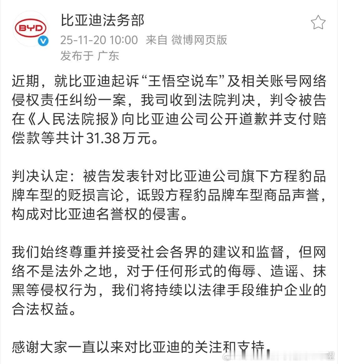 法院判王悟空向比亚迪公开道歉并赔偿31万只看金额的话确实太少,威慑力一般如果考