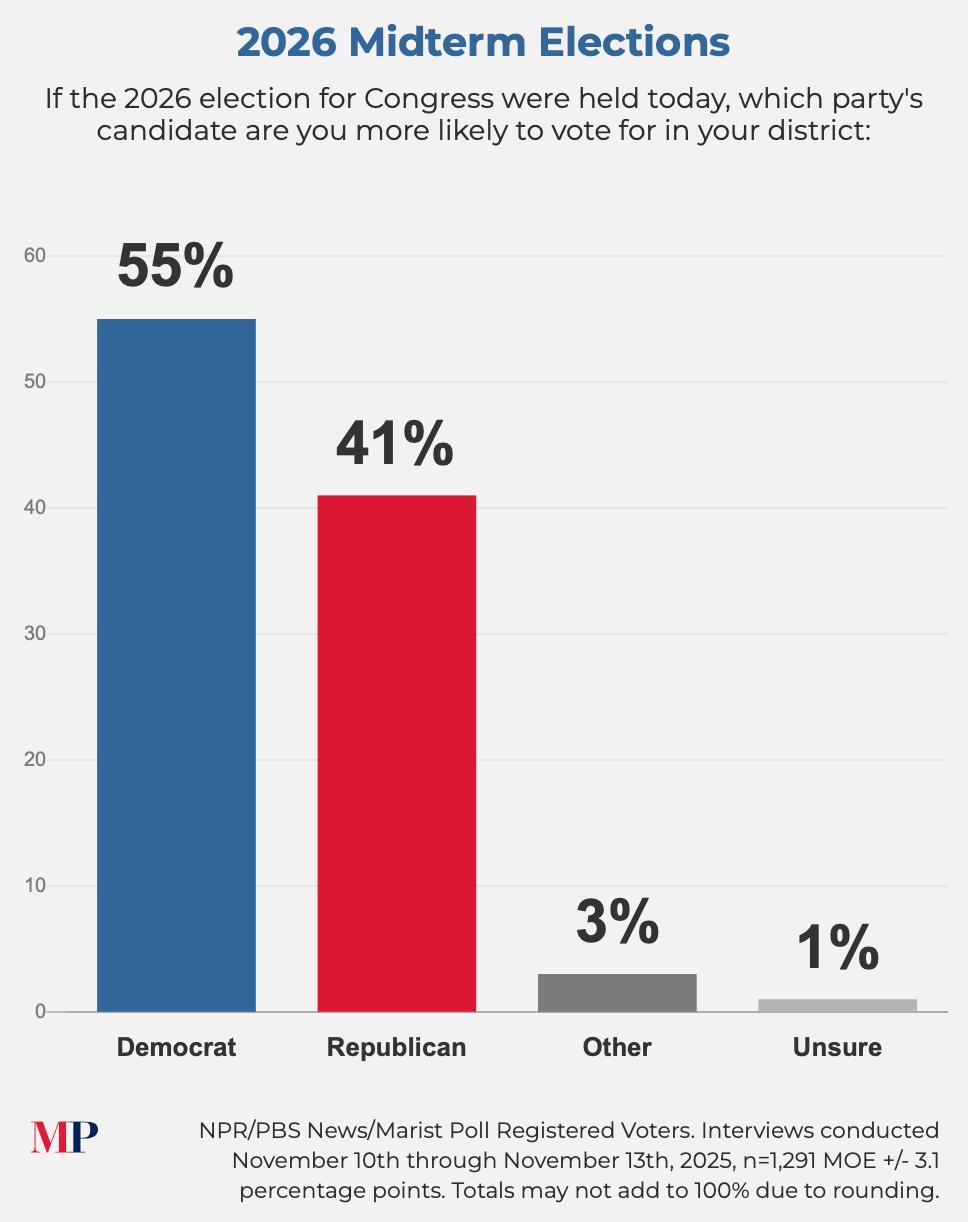 最新民调显示,民主党在2026年中期选举的综合民调上取得两位数领先,55%的登记