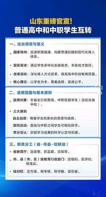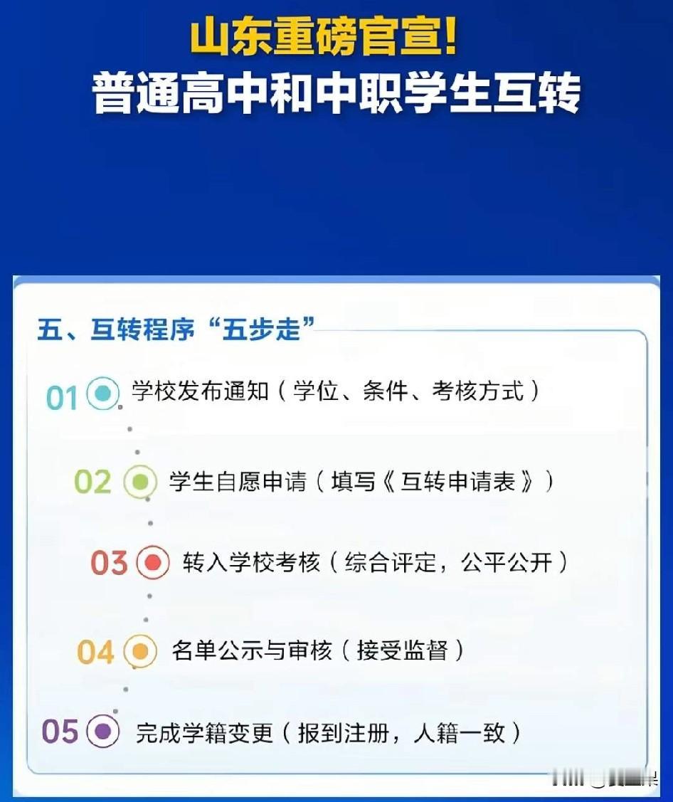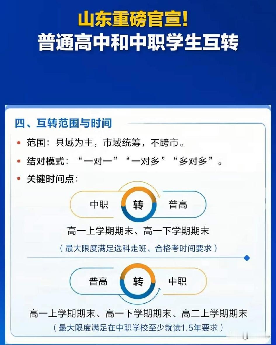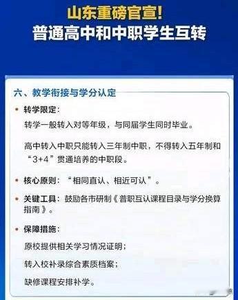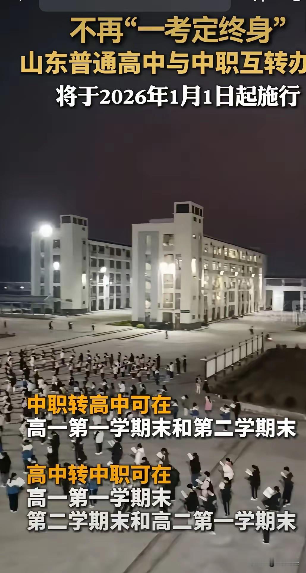 山东学生多了一条选择。 2026年1月1日起,山东省所有的高中可以跟中职学校互转。 也许现在很多人还没意识到这项政策意义多么重大。 可是知道之前学生,要么选高中,要么选中职,只能选其一,等于中考就决定了人生方向。高中与中职彼此独立,互不干涉。 可是这个政策呢,它是头一个架起了高中与中职桥梁,对学生十分利好。 对学生来说,如果学生在中职学习不错,那他就还有上高中考大学的机会; 如果学生在高中跟不上去,他也可以转到中职学一门技术傍身。 等于重构了学生的成长路径,给了第二次人生选择机会。 对学校来说,要想留住学生,就得提高教学质量,对一些民办学校来说,至关重要。 对家长来说,不用为了孩子上学过于焦虑,孩子既有文化知识,又有技能,就业面也宽了。 现在山东有很多学校已经开展了互转,比如淄博般阳中学, 般阳中学是一所生源比较弱的高中,此前就和淄博理工学校合作,帮学生将普高学籍转为中职学籍参加职教高考,2023年该校173名职教高考考生中92人本科上线,上线率达53.2%。 还有济南旅游学校,作为中职学校,却已经设立了综合高中部,学生有夏季高考或职教高考两条路线可选择。 如果高中部的学生苦于学业压力,高一结束后就可以申请转入职专部。 目前在青岛也已经存在大量的高中与中职互转现象,比如2023年有7021人普高生转入中职备战职教高考,2024年增至7767人。 可以想见,将来这种趋势会越来越明显,也会有越来越多的省份紧随。