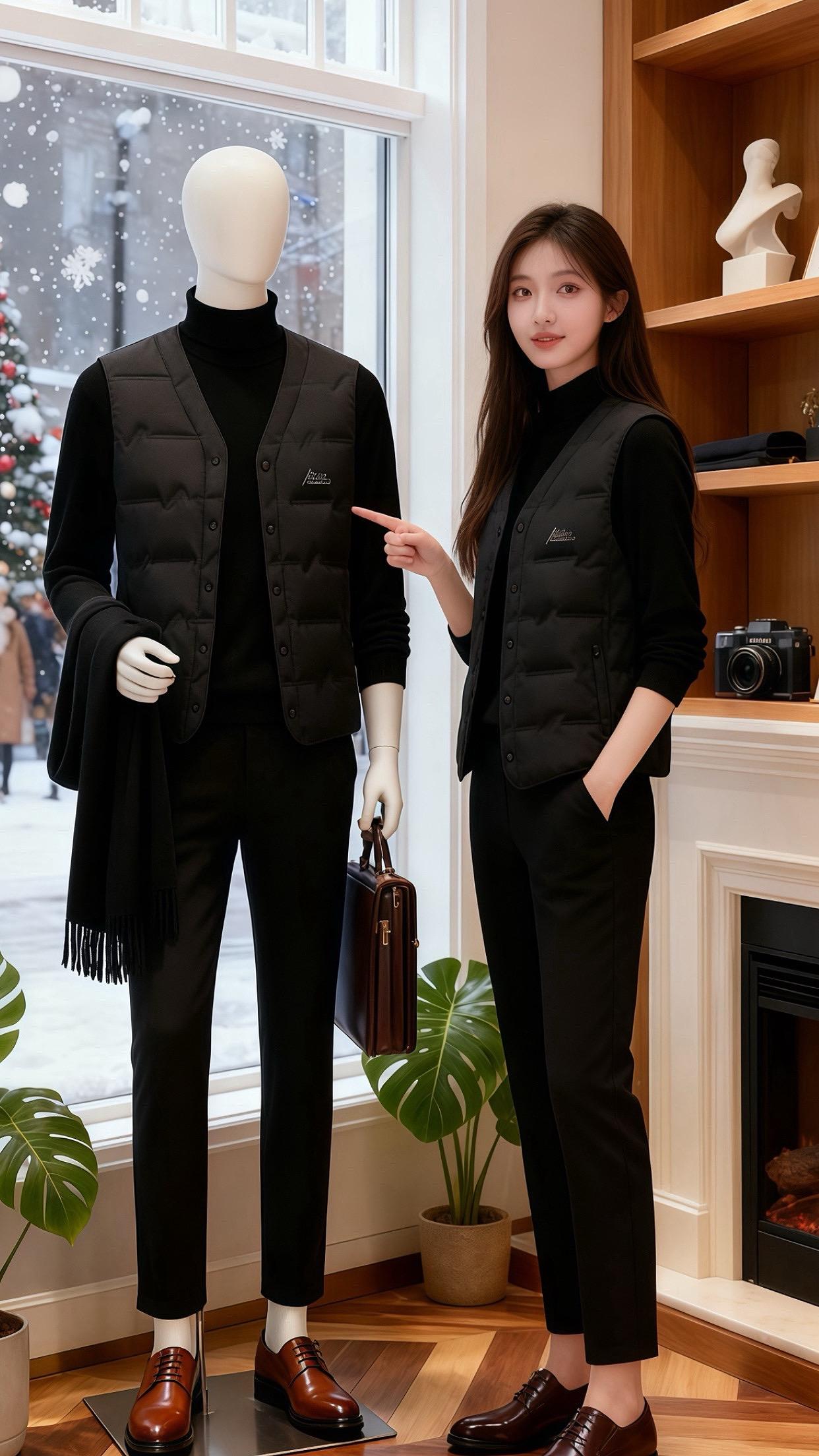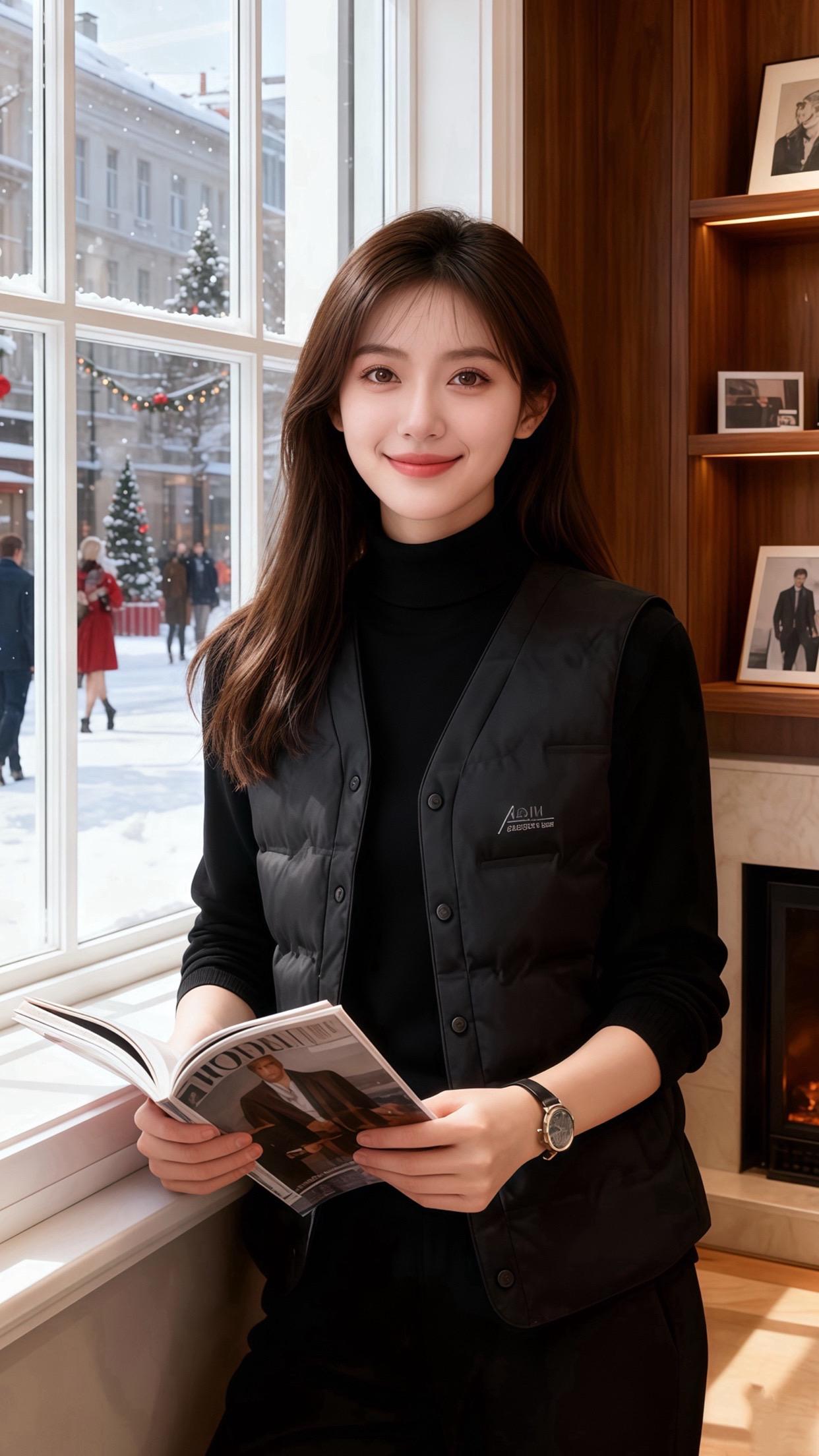 雪落满街的午后,林知意裹着那件黑色羽绒马甲,窝在窗边翻杂志——高领衫衬得肩颈线条软而利落,马甲的暗纹刺绣像藏在冬夜里的星,素净又妥帖。