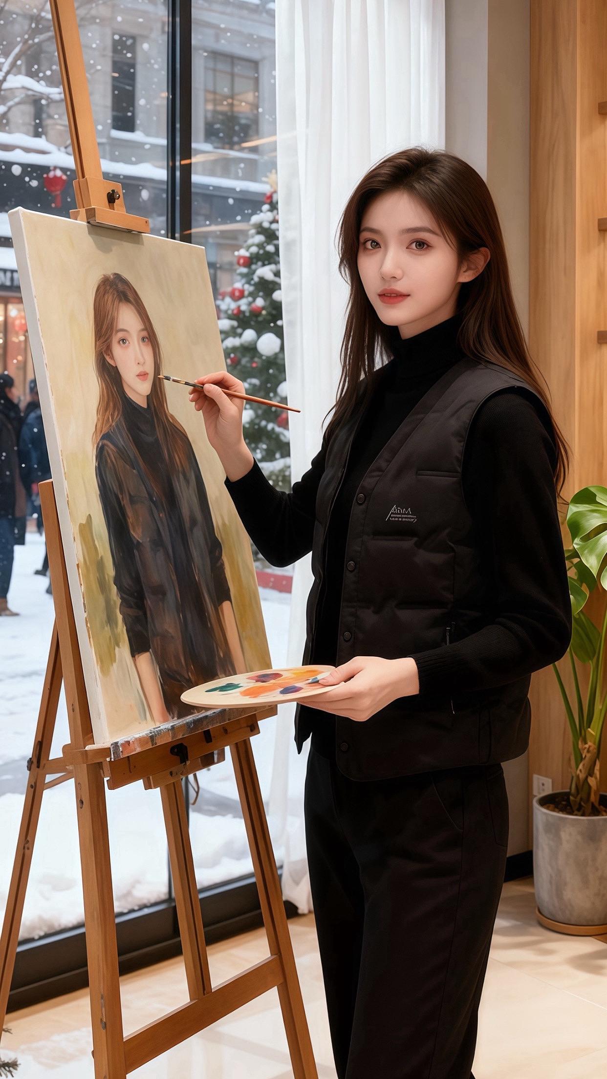 她再出现时,正举着画笔描画布上的自己,同一件马甲在画室暖光里,多了点松弛的温柔。我倚着门笑:“你这一身,像把冬天的风都揉成了妥帖的软。”