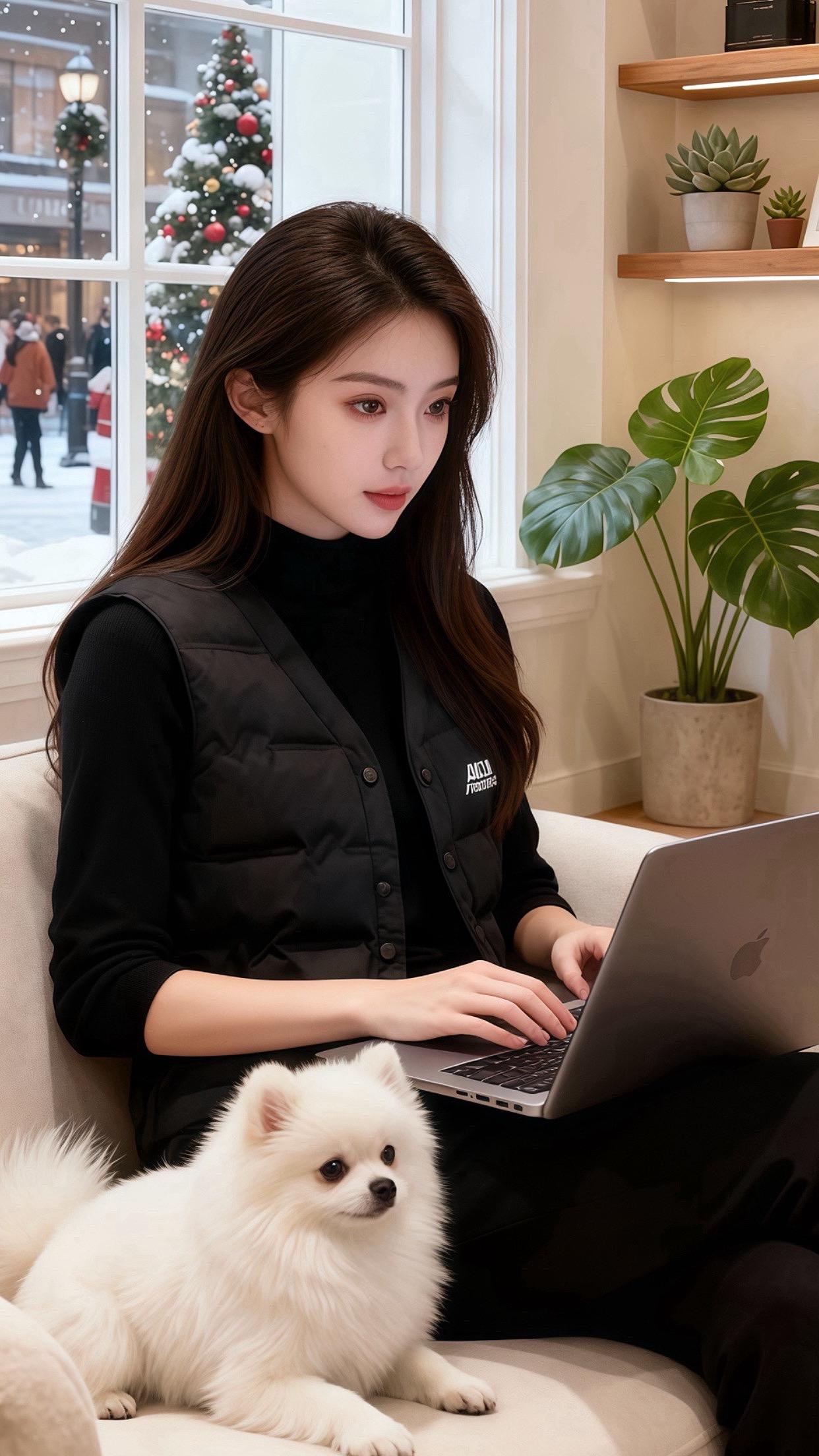 后来她蜷在沙发敲键盘,马甲搭在针织衫外,袖口露出一小截细腕,脚边的博美蜷成绒球。我凑过去碰她的马甲口袋,里面揣着热可可的糖纸:“这穿搭该叫‘把日子穿得暖和又好看’。”