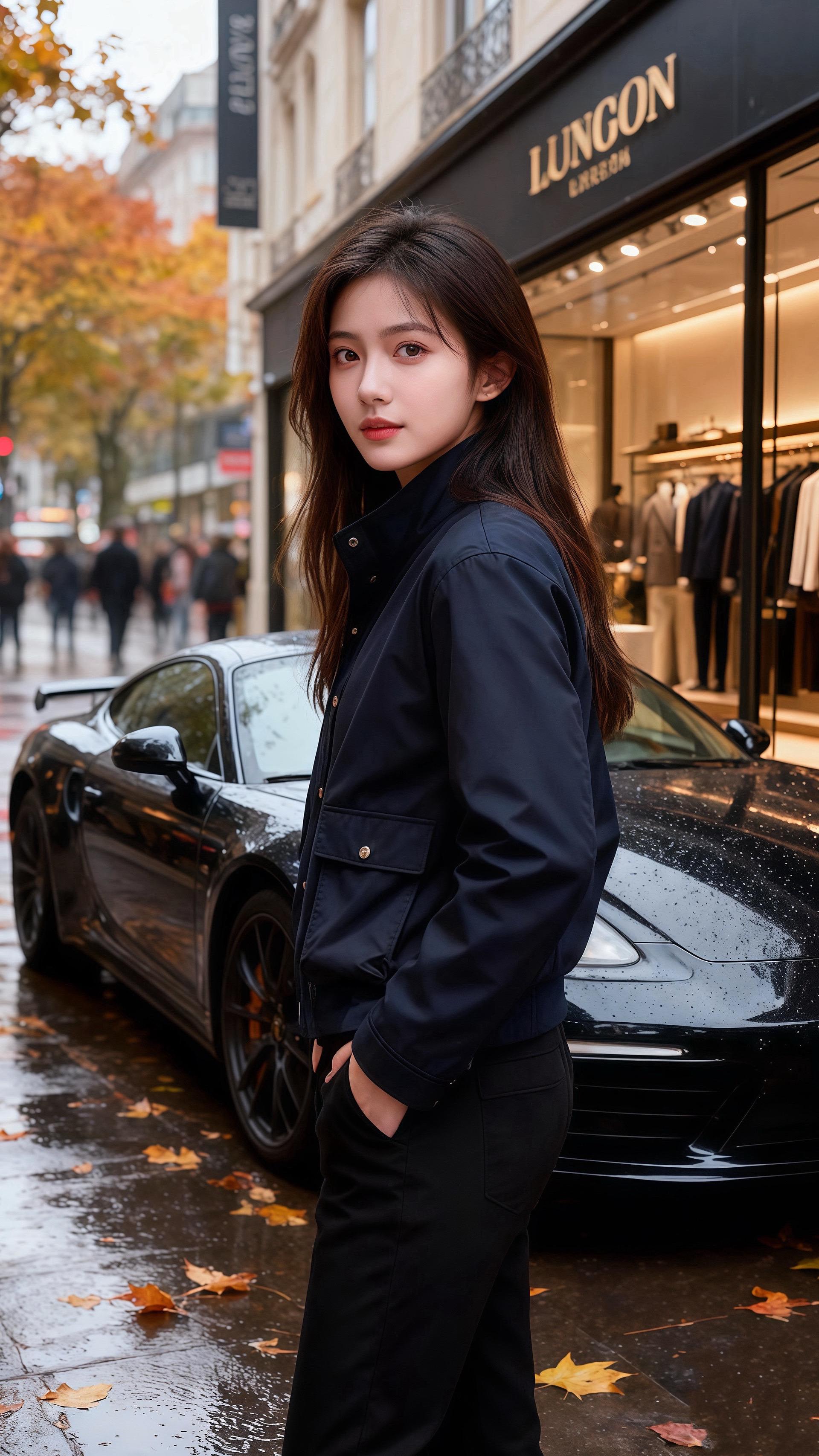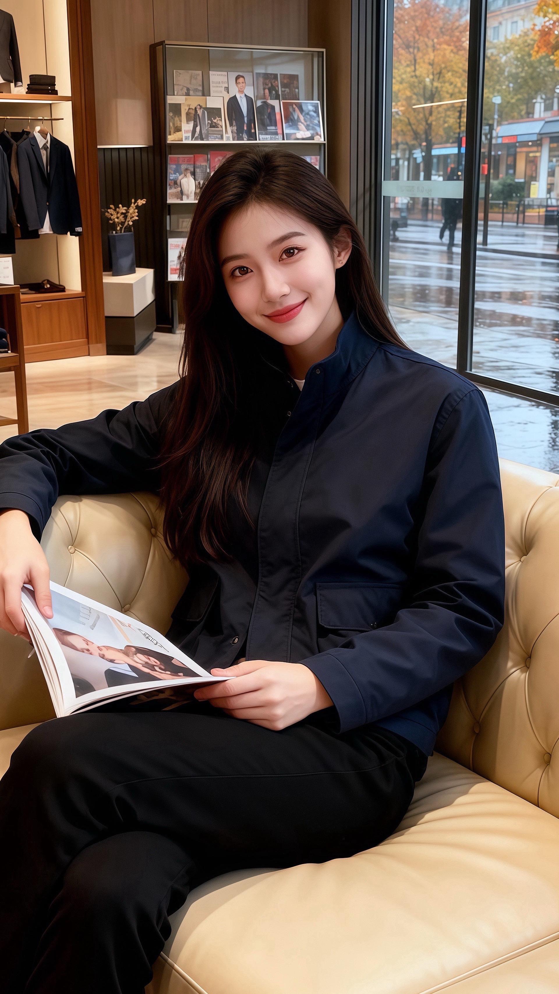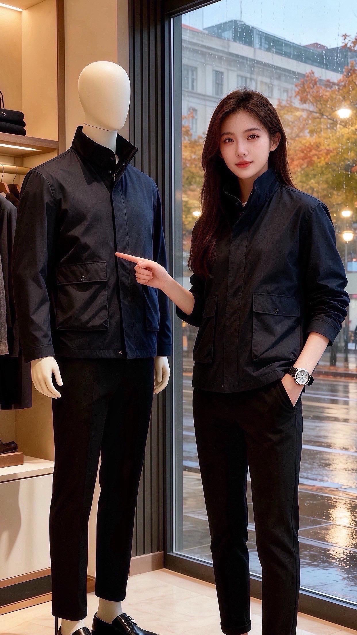 秋雨裹着梧桐叶打湿橱窗时,苏念正倚在男装店的衣架旁,指尖掠过一排西装领角。她身上的藏青立领夹克衬得肩线利落,口袋的细节又添了点软和,配着垂感恰好的黑裤,像把都市的冷调揉进了松弛里。