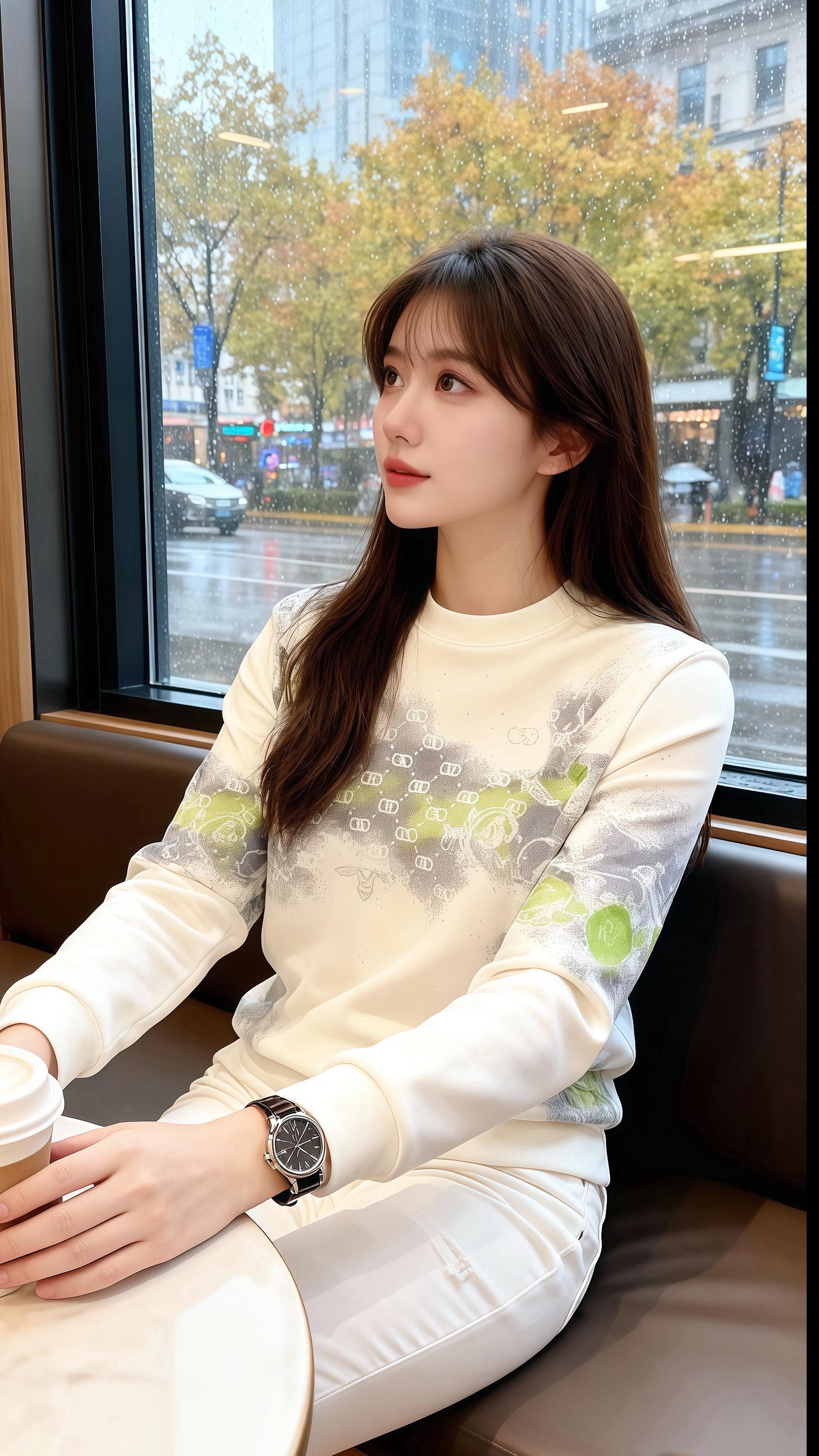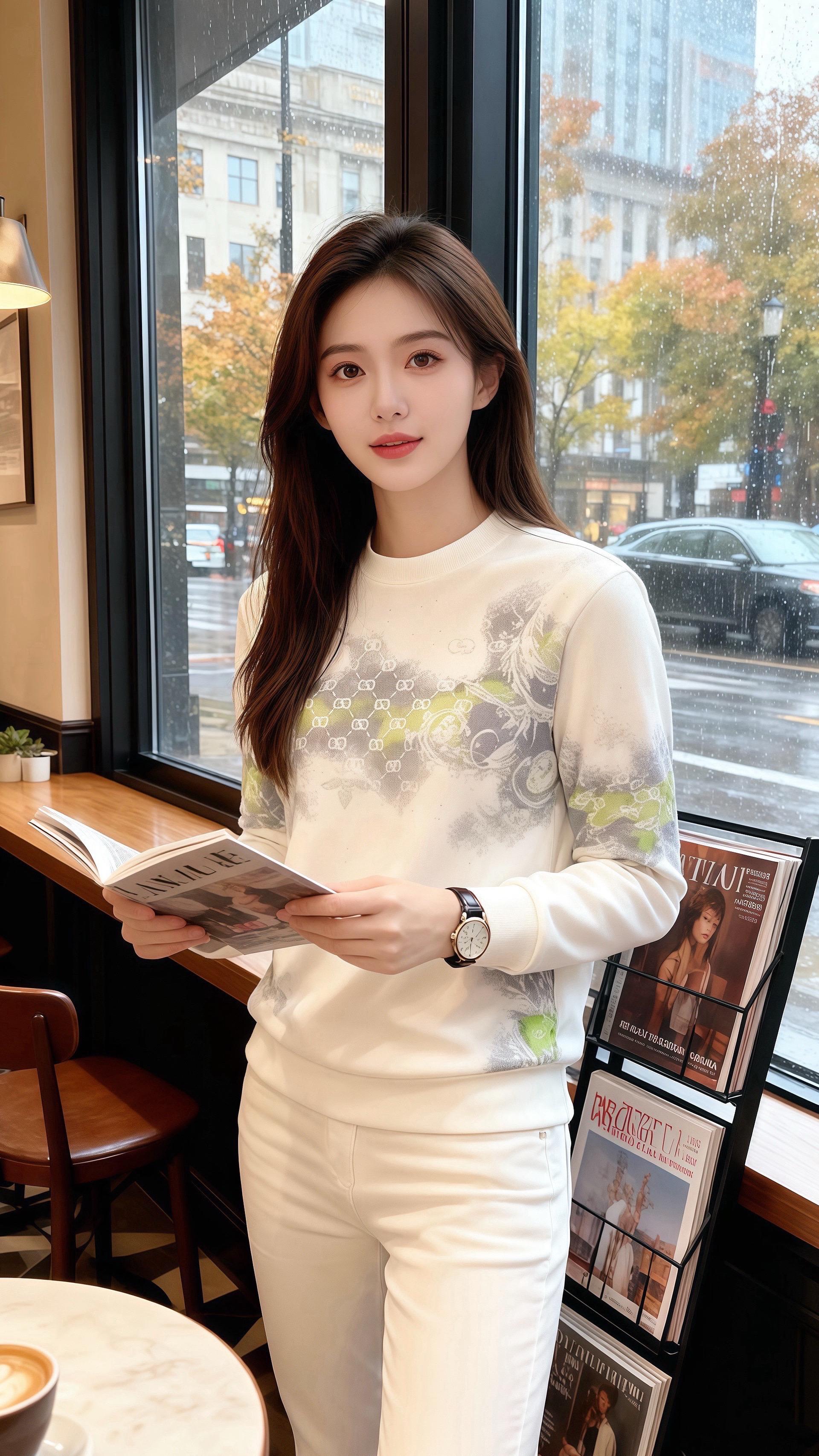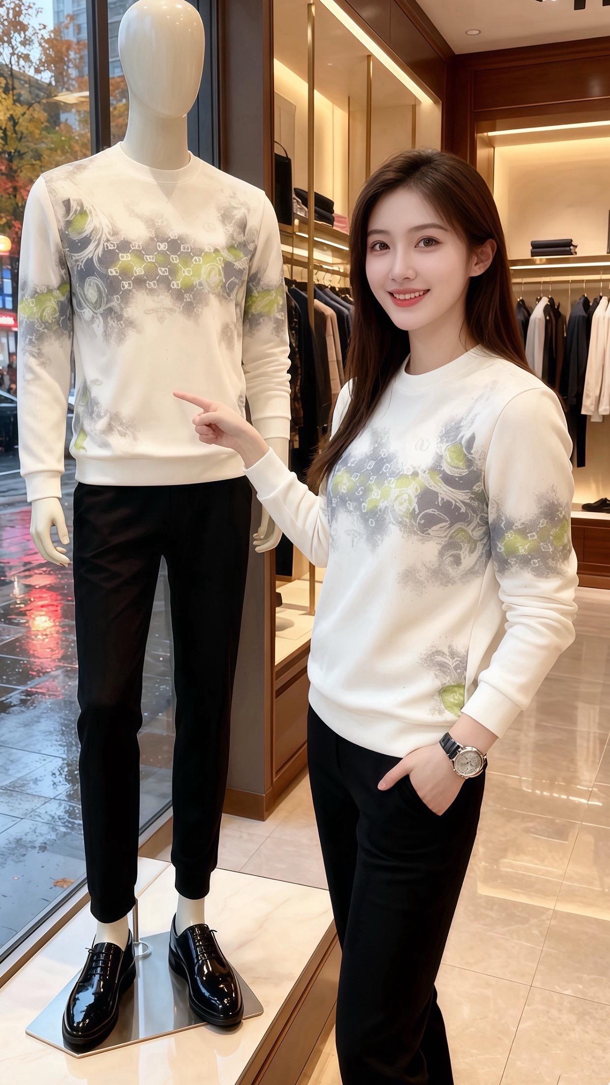 他目光先落向她身上——米白卫衣裹着肩线,灰绿纹样像把窗外的雨雾晕在了布料上,软而轻的质感,衬得她腕间手表的银边都温了些。卫衣下摆顺着腰线收得刚好,露出一小截同色裤装的线条,像把秋阳揉成了一身软和。