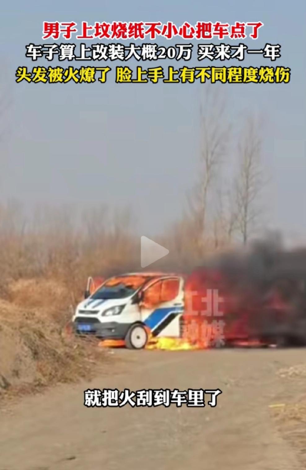 天呐,上坟烧纸把新车烧没了! 11月19日辽宁,一个大哥去上坟烧纸,刮过一阵风,直接把他20万的车给烧了,而且车里还有纸,这火瞬间就失控了。才买一年改装过的车啊!大哥头发被燎,脸和手也烧伤了,心疼他三秒钟。 这运气差得离谱啊,谁能想到上坟能把车搭进去。这事儿真是让人无语凝噎,感觉就像电视剧里的奇葩情节,没想到现实发生了!