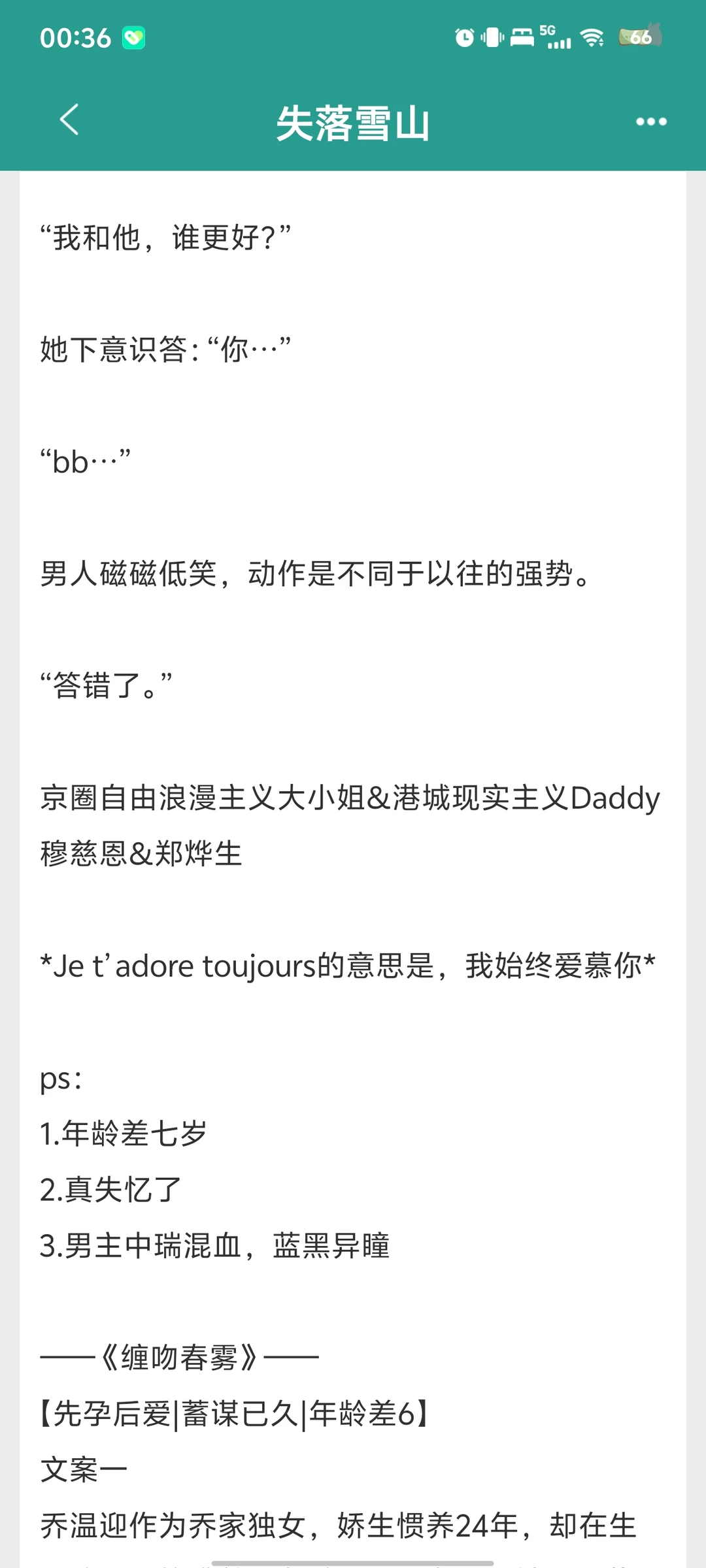 《失落雪山》by意栀 [郁金香R]京圈浪漫主义大小姐&港城现实主义Daddy 超甜京港联姻,先婚后爱,拉扯感绝了 年龄差7岁,男主中瑞混血,真失忆 [郁金香R]男主表面清冷端方,其实是个阴湿疯批男鬼。遇到女主前,他是坚决的不婚主义,遇到女主后真香了,克制不住向她靠近,为她打破原则,不再压抑天性……生理喜欢yyds!