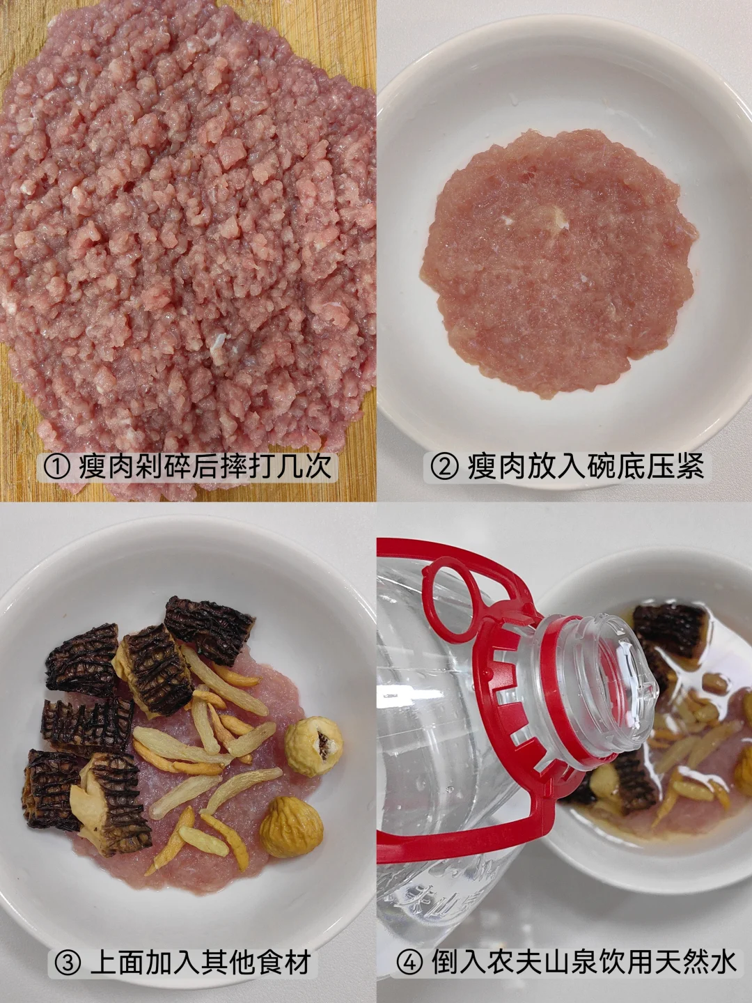 ❷ 肉泥平铺碗底压紧,放上食材,加农夫山泉浸泡20分钟(划重点!别用生水,这步是鲜味密码!)