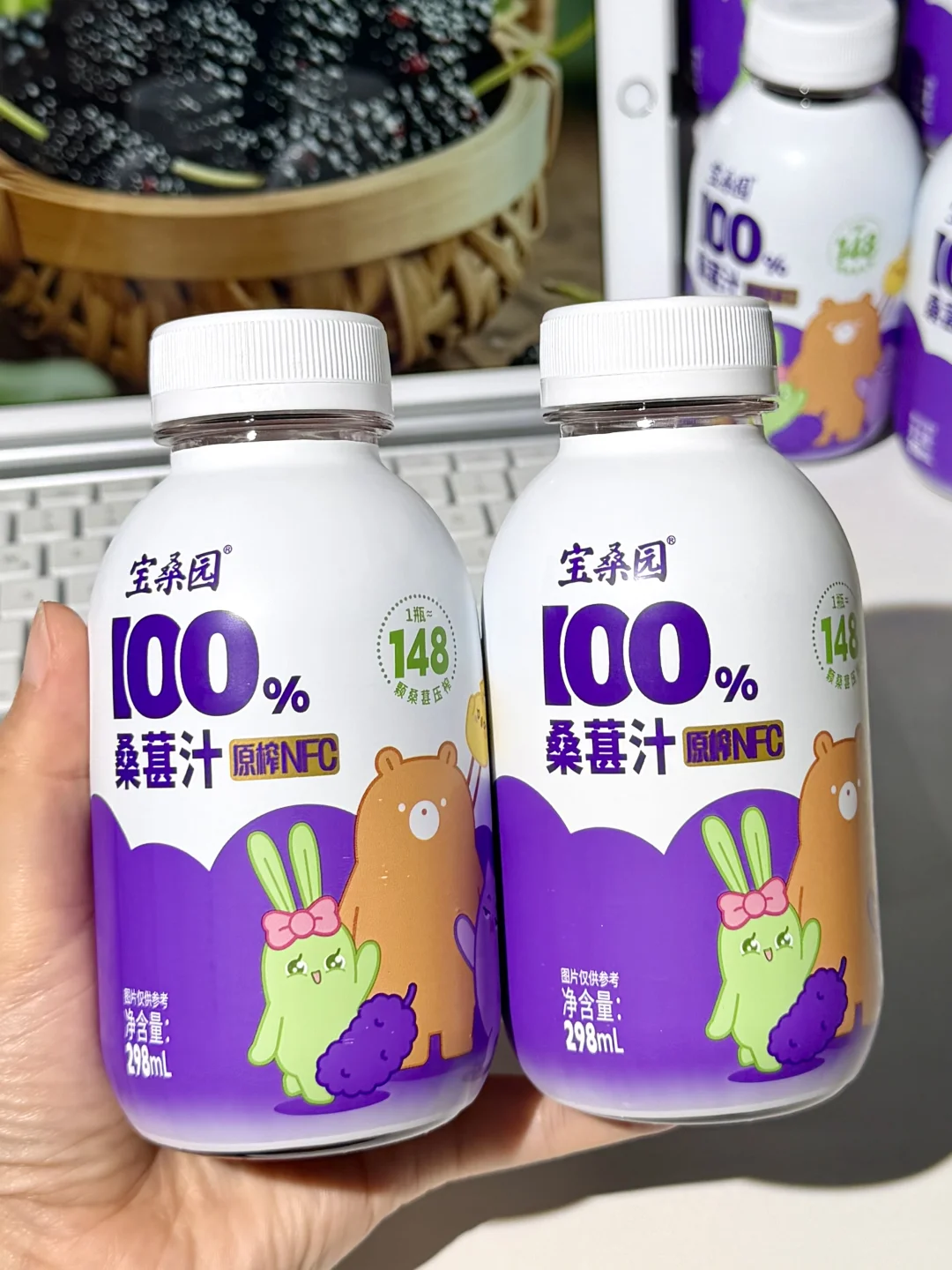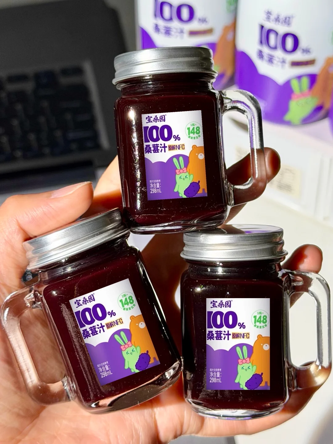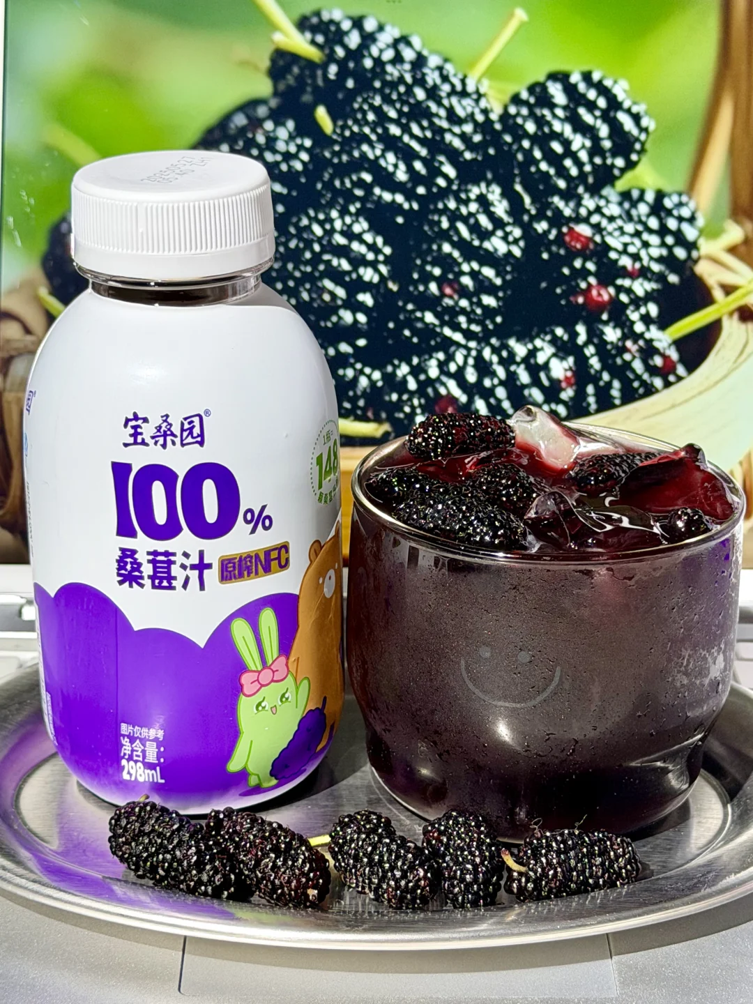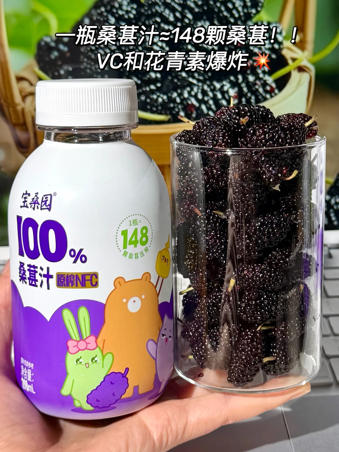 只有喝过才懂这瓶100%桑葚汁的含金量!!! 不愧是农科院出品!!配料表只有纯纯纯桑葚汁! 不加糖不加水,是实打实的100%NFC原榨!! 喝起来像无数颗新鲜桑葚在嘴里爆开,果味巨浓郁!爆汁感十足!!酸酸甜甜的,很清爽!! 一瓶桑葚汁≈148颗桑葚!!VC和花青素爆炸💥 爱熬夜的姐妹都去喝!!对👀很友好!! 还可以自己diy桑葚冰奶!!巨好喝!!奶茶店也赚不到我钱钱了!! 建议女孩子都去试试宝桑园桑葚汁!!