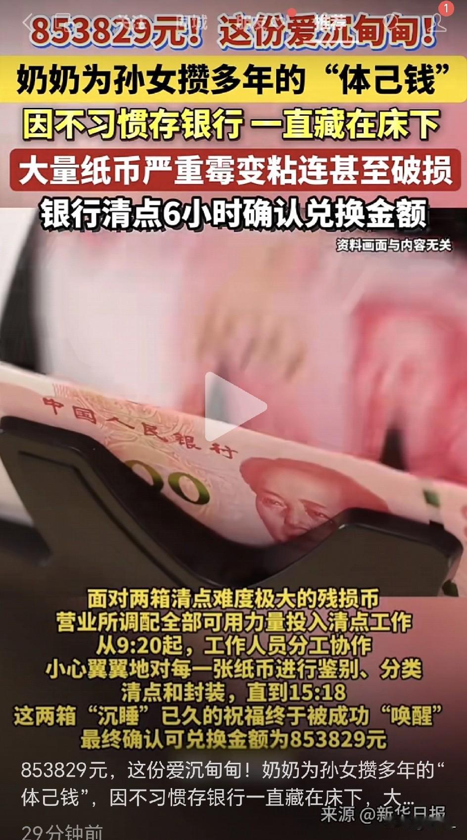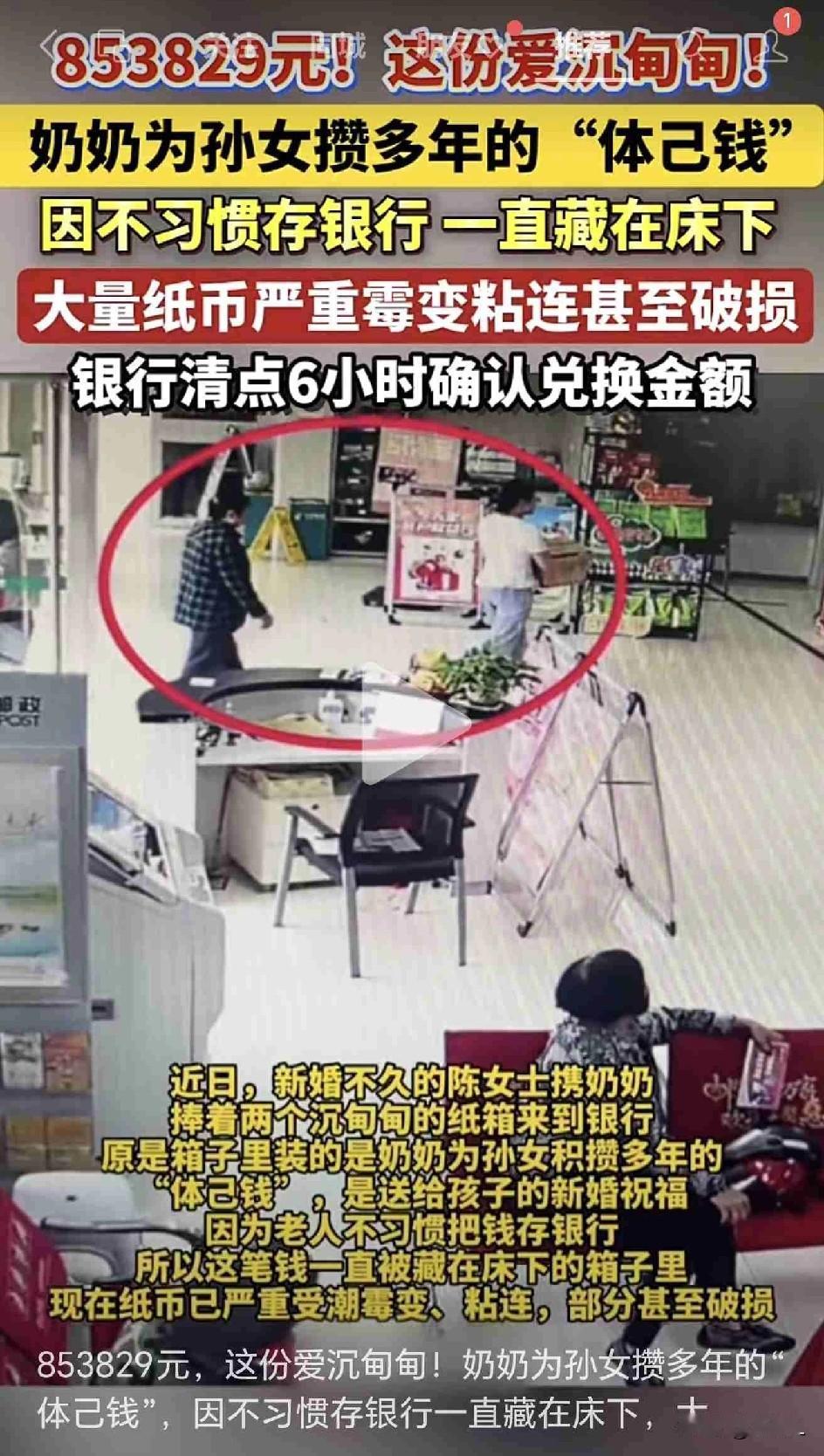 孙女新婚,奶奶抬来两大箱“破烂”,银行全员出动清点6小时!结果惊呆所有人…… 近日,江苏海安。新婚不久的陈女士带着奶奶,捧着两个沉甸甸的纸箱来到了某银行。 原来,箱子里装的是奶奶为孙女积攒多年的“体己钱”,是奶奶给孙女的嫁妆,对小家庭的殷殷祝福。 因为老人家不习惯把钱存银行,所以这笔钱一直被藏在床下的箱子里。直到陈女士新婚以后,老人家想把这份沉甸甸的爱心交到孙女手里时,才发现纸币已严重受潮霉变、粘连部分甚至破损。 银行迅速组织人员展开了一场“爱心抢救”行动。 清点工作从9:20起,工作人员分工协作小心翼翼地对每一张纸币进行鉴别、分类、清点和封装。 直到下午15:18,花费近6个小时,这两箱“沉睡”已久的祝福终于被成功“唤醒”。 在扣除了无法兑换部分后,最终确认可兑换金额为853829元。 奶奶激动地握住工作人员的手,眼眶湿润,连声道谢。而陈女士也当即决定把这笔满载深情的钱款存入这家银行,作为小家庭的美好开端。 奶奶的“体己钱”虽然一度“沉睡”,但最终在爱心与专业的共同作用下,成功“唤醒”,并继续在新的家庭里滋养着幸福。 形成了一个爱心的完美闭环,完成了爱与祝福的传承。 信息来源于观澜新闻,侵联删! 带定位晒今日生活 我的今日状态:😁轻松愉快 我这里的天气:☀️晴天