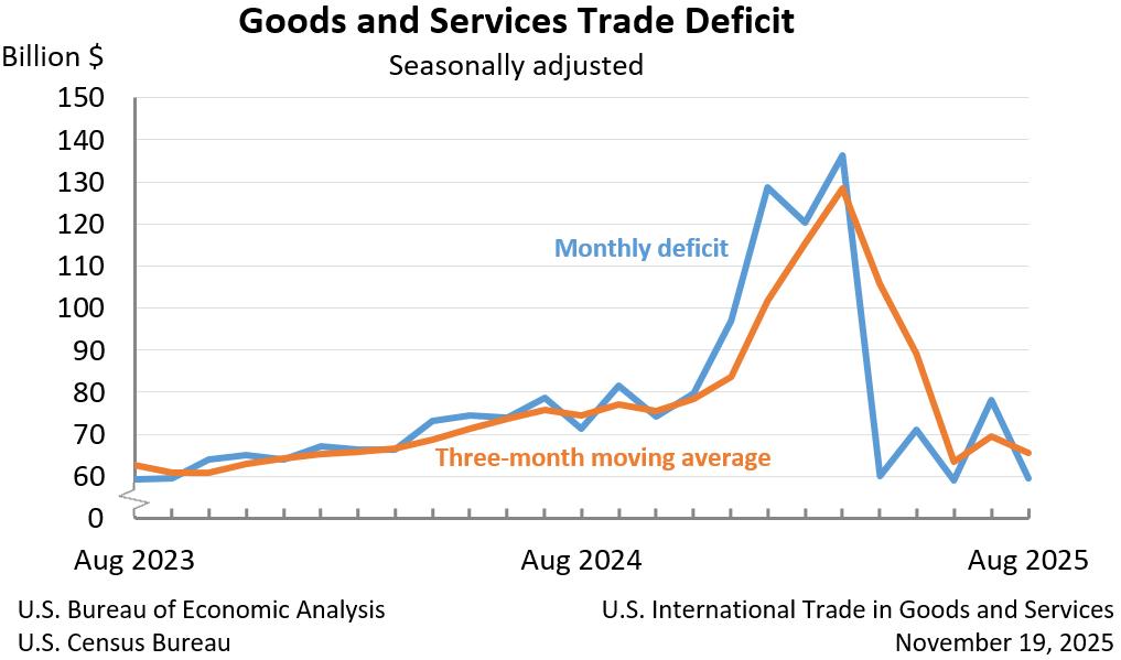 因政府停摆而延宕的美国商务部数据显示,在特朗普大范围征收全球关税之际,美国8月贸易逆差大幅收窄。最新报告指,商品与服务贸易逆差较前月缩小近24%,降至596亿美元。至于原定11月4日发布的9月贸易数据,目前尚无新的发布日期。人口普查局则宣布,9月零售销售将于11月25日公布,同月耐用品订单数据将在11月26日发布。 图片来源于网络