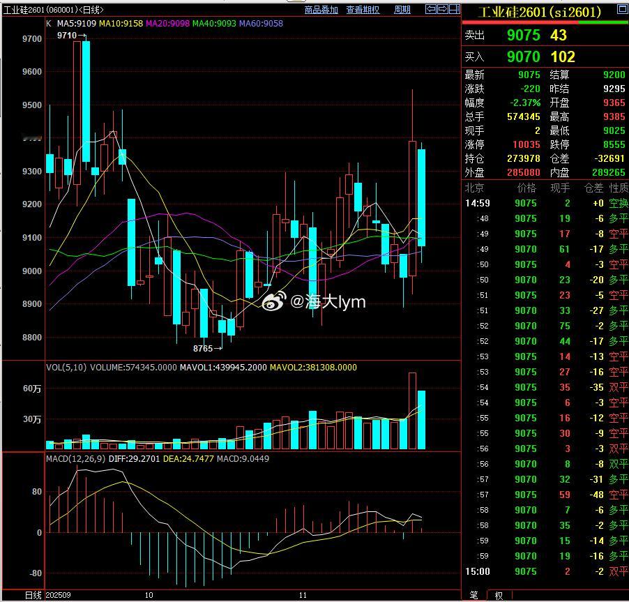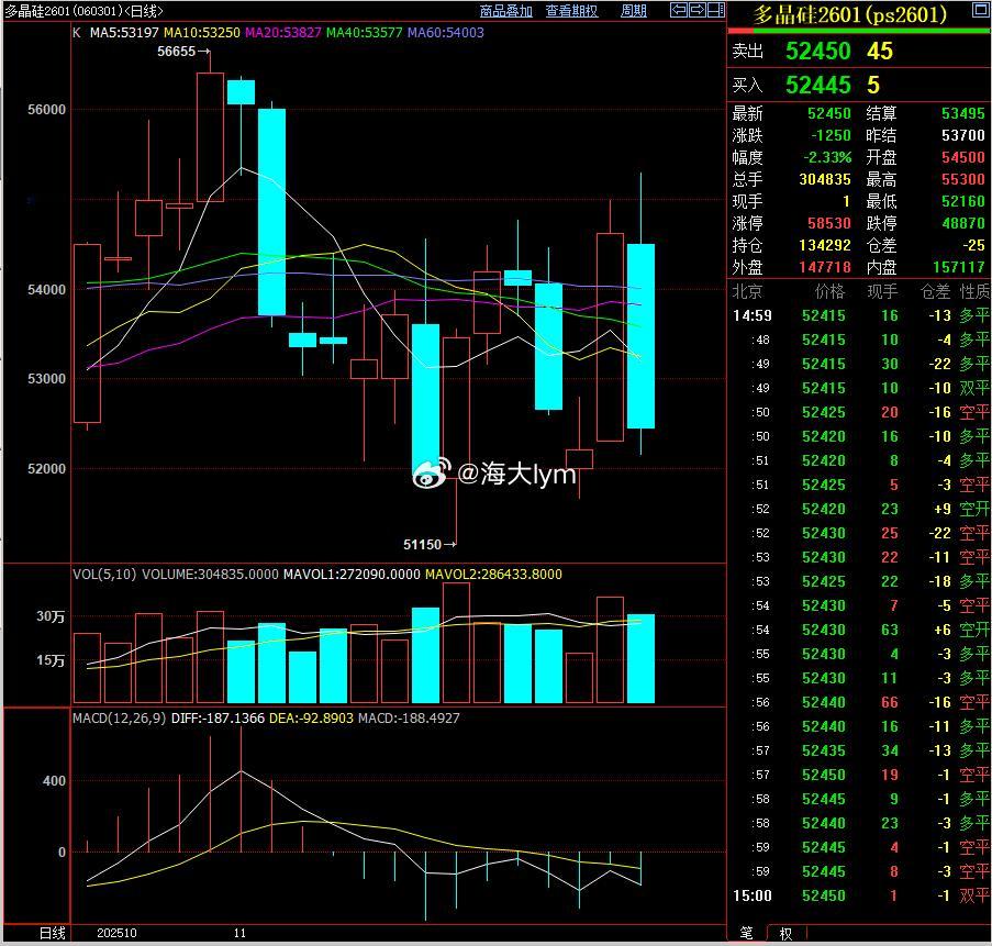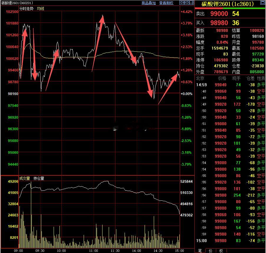 广期所的品种真不愧是“绞肉机”,工业硅和多晶硅昨天的涨幅今天就几乎跌没了;碳酸锂主力合约2601的行情也很刺激,“过山车”的走势上午的行情:高开后小幅下挫,快速拉升3000点,马上跳水近4000点,随后又震荡回升4200点 还创新高了;下午的行情:本周碳酸锂去库不及预期,下午的开盘价差不多就是下午最高价,随后就是快速回落,最低打到97720,回吐了日内4%的涨幅;尾盘小幅回升至9万9附近