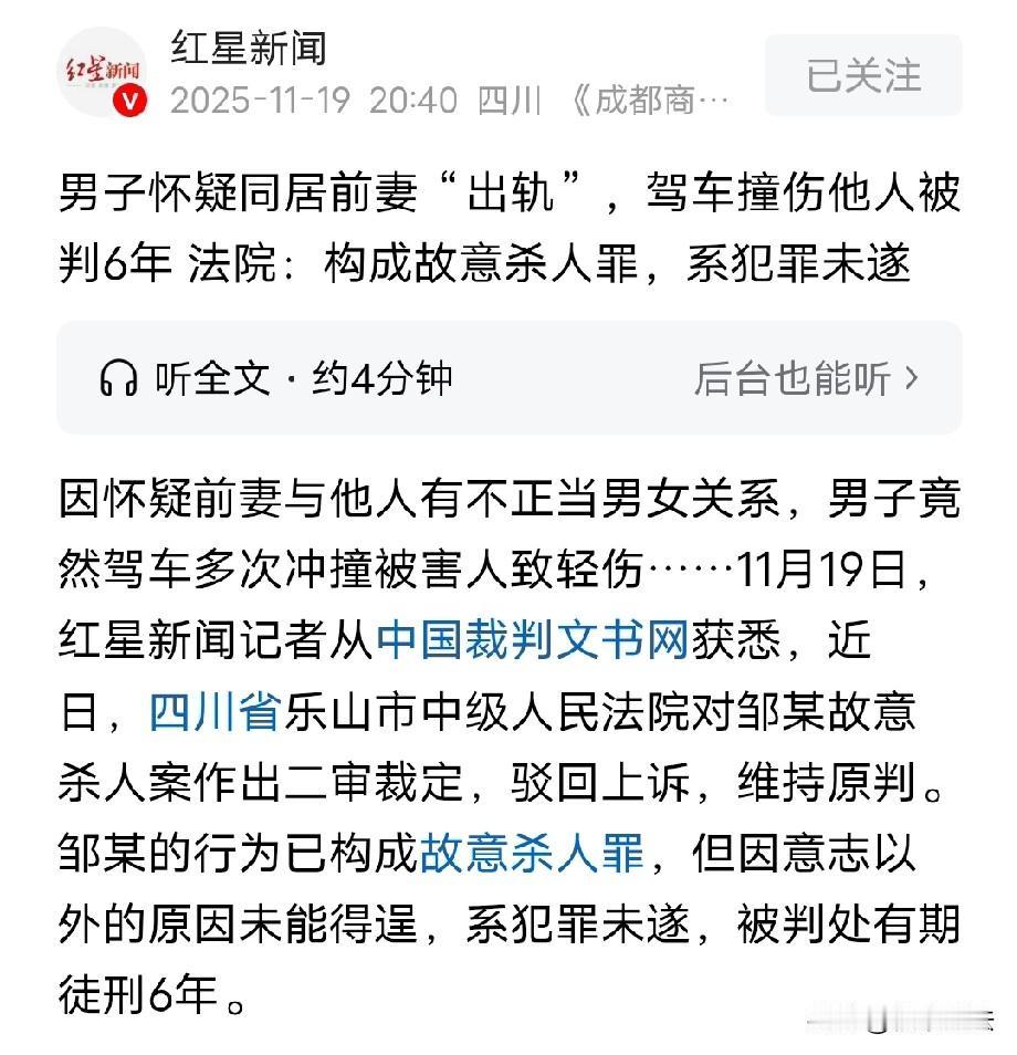 四川乐山,男子和前妻离婚后,为了孩子仍住在一起,2年后,男子发现前妻常夜不归宿,还总和一男人通话,甚至男人还来过家里,男子醋意大发,在一个下午,带把尖刀,开车去找那男人报复,见男人开着三轮车,男子一脚油门将对方连人带车撞翻,随即下车查看,见男人呻吟不止,男子又上车两次冲撞、碾压,导致男人受伤,事后,男子报警撒谎说发生车祸,结果还是露馅了。 邹某和李某甲原本是一对夫妻,在2022年,两人协议离婚,可孩子还小,如果各奔东西,担心会给孩子带来伤害,所以,两人虽然离婚了,仍然住在一起。 正常来说,夫妻离婚后,继续同居在一起,也该划清界限,彼此不再干涉对方的个人感情生活了,但是,邹某没有想通这一点。 邹某和前妻离婚后在一起过了2年后,他发现前妻的行为反常,让他焦虑不安。 2024年8月开始,李某甲频繁的晚归或者夜不归宿,把这一切看在眼里的邹某开始不断的猜测,前妻李某甲“出轨”了。 为了证实自己的猜测,邹某开始悄悄调查,他调取了前妻的通话记录,一个频繁和前妻通话的手机号引起他的注意。 手机号的主人是冯某。 眼看着前妻有了新的情况,邹某坐不住了,他的猜忌愈发强烈,他又查看了小区监控,看到让他痛苦的一幕。 监控视频中,冯某曾在2024年9月25号晚上去过他家。 这一发现让邹某更加确定,前妻和这个冯某之间一定有不正当关系,这一刻,愤怒和嫉妒让他产生了报复的想法。 10月8号下午1点多,邹某带上一把尖刀,开着车从家里去找冯某,心里盘算着报复计划。 一番打听,邹某找到了冯某工作的快递仓库,刚到仓库附近路口,他发现了目标——冯某正在开着快递三轮车往外走。 邹某一看到冯某瞬间火冒三丈,他猛踩油门,加速冲向冯某开着的三轮车,“砰”的一声,冯某连人带车被撞翻在地。 邹某下车查看,看到冯某在痛苦呻吟,心里还不解恨,他返回驾驶室,倒车准备继续碾压冯某。 冯某惊恐万分,拼尽全力跑到路边的车辆旁躲避,这才逃过一劫。 然而,邹某根本不想停手,倒车的时候,因为车速太快,又把停在一旁的另一辆快递三轮车撞翻,万幸的是,驾驶员张某反应迅速,跳车逃过一劫,没有受伤。 邹某此时没有停止疯狂的行动,他看到躲在车辆空隙中的冯某依然压不住怒火,两次开车冲向冯某,因为别的车辆阻挡,冯某算是幸运的,没有受到严重伤害。 可是,那两辆小轿车可惨了,遭受了不同程度的撞损。 干完这些之后,邹某似乎恢复了一些理智,他打了120和122,不过,他没有说实话,而是撒谎说发生了车祸。 当交警到了现场时,邹某依旧隐瞒自己故意撞人的事实,试图蒙混过关。 但真相终究无法被掩盖,民警调取现场监控一看,画面中邹某开车疯狂冲撞的场景,让他的谎言不攻自破,在证据面前,邹某才说了实话。 因为嫉妒和不甘心,邹某不惜开车撞人,他却没有想过,前妻已经跟他离婚了,哪怕有新的男朋友也是正常的,他作为前夫不应该介入前妻的感情,这么做不仅毁了家庭也伤害了别人。 经过鉴定,冯某的伤势令人痛心。他的左腓骨下段骨折、右手第1掌骨基底部完全性骨折等三处损伤,均构成轻伤二级。 2025年7月,一审法院认为,邹某因怀疑前妻与冯某有不正当关系,萌生报复念头,携带匕首驾车寻找冯某,表明其主观上具有明确的杀人故意。 在首次撞击后,邹某发现冯某仍能呻吟,又返回驾驶室倒车欲继续碾压,进一步证明其积极追求冯某死亡的结果,而非仅造成伤害。 《刑法》第232条规定:对故意杀人罪的规定:故意杀人的,处死刑、无期徒刑或者十年以上有期徒刑;情节较轻的,处三年以上十年以下有期徒刑。 另外,邹某驾车加速冲撞冯某驾驶的三轮车,将冯某连人带车撞翻,此行为具有高度危险性,可能导致冯某死亡。 倒车碾压、两次驾车冲撞躲在路边车辆空隙中的冯某,均是对冯生命权的直接侵害,符合故意杀人罪的客观行为要件。 因此,一审法院认定,邹某构成故意杀人罪(未遂),判处有期徒刑6年。 另,邹某赔偿冯某医药费、误工费128981元,以及赔偿相关人员的车辆损失维修费2万余元。 并没收邹某作案工具,越野车一辆,退还邹某尖刀、手机。 一审判决后,邹某不服,认为自己只是故意伤害,不是故意杀人,属于犯罪中止,还有自首、立功情节,而对赔偿也有异议,应该减轻处罚。 二审法院认为: 第一,邹某因为怀疑前妻和冯某有不正当关系,就开车多次冲撞冯某泄愤,并且他撞伤冯某,是有追求他人死亡的故意。 第二,邹某开车冲撞冯某,是因为路狭窄,以及路边车辆阻挡等外部因素,才没能得逞。而在此过程中,邹某没有停止冲撞冯某的行为。 第三,邹某报警撒谎说是车祸,隐瞒故意开车撞人的事实,不构成自首,也没有证据证明他有立功的表现。 因此,二审法院驳回邹某上诉,维持原判。 关注@福康说法 从日常点滴学法律,生活安稳更有底
