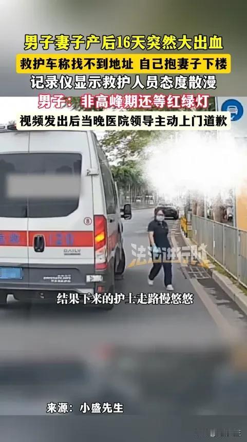 “严查到底!”近日,广东深圳,一女子在家突然大出血,老公焦急的叫了救护车,不料,对方却表示找不到地方,男子只能抱着妻子到小区门口等,没想到,赶来的护士却十分散漫,站在一旁无动于衷!网友:这是拿生命当儿戏。 救护车属于特殊车辆,在紧急情况下,是可以闯红灯的,因为每省出一秒钟的时间,病人生存的几率就会多一分,所以驾驶救护车的司机一定要经验丰富,熟悉各路段的状况,医护人员更要专业。 网友评论这辆是外包车。派出这车医院一定严查。这种车一般不出车。这种车一般用于租用转院。或者送人回家。或者比较山的地方要人带路才用这车。 救护车司机找不到地址就应该是报警中心通知病人家附近医院时没有说清楚,大家要明白,救护车并不是120报警中心的。全部都是由医院开出来的。 也有网友说如果病人,出现更严重的后果,这几个医务人员必须负全责,危重病人,每一秒钟都是黄金时间,分秒必争,早一分钟抢救,都比下一分钟好。 这样的人不应该是批评,直接辞退,因为一个不热爱本职工作的人,就不应该给他这份工作。 我觉得出现这种事情,医院应该立即开除当班医护人员及司机,耍通报全社会,整改认错,医院领导及全体医护人员,认真学习救死扶伤的伟大精神。 大家怎么看?