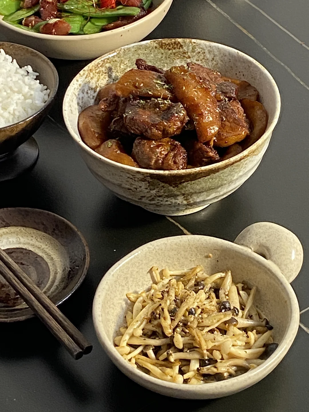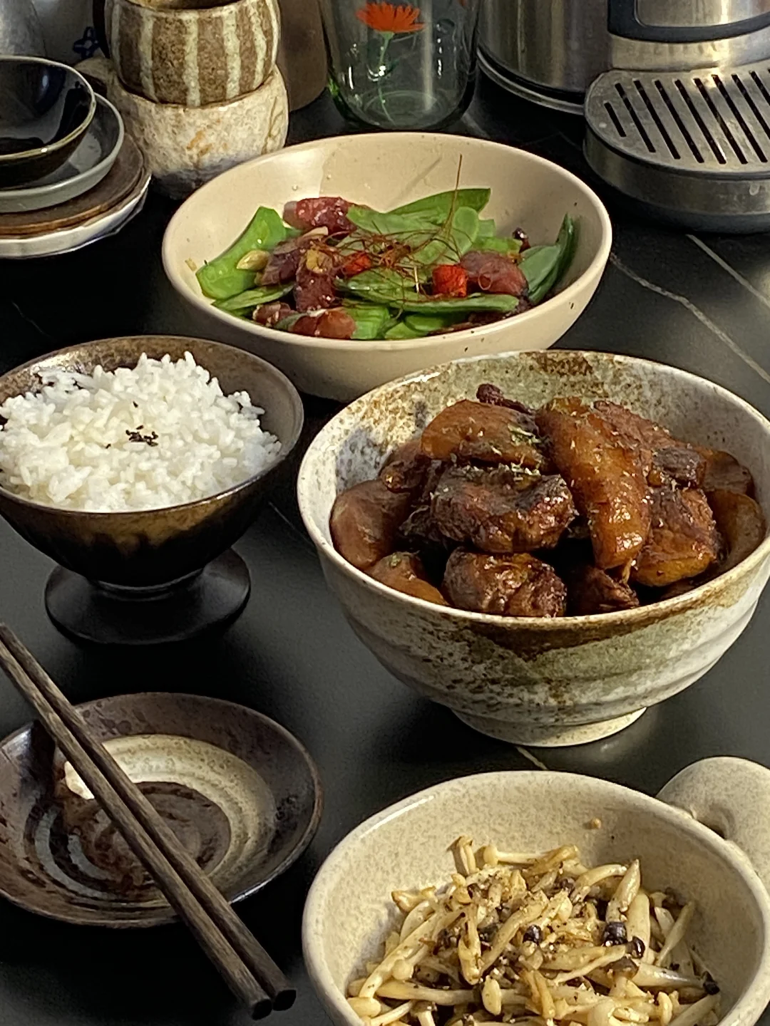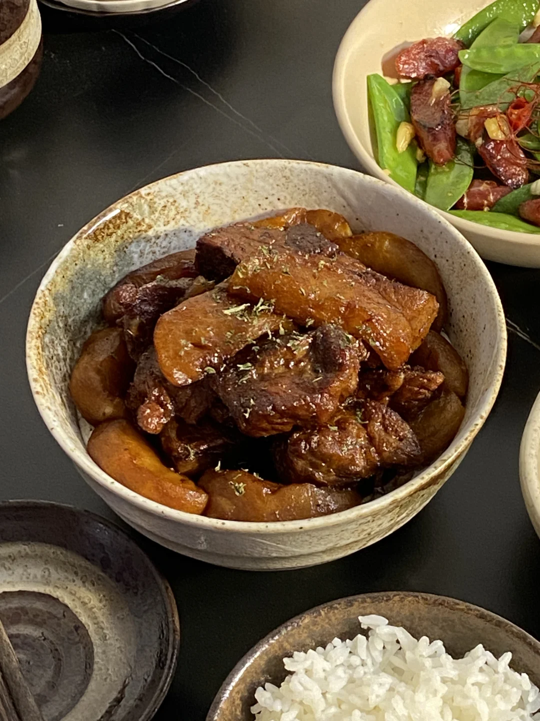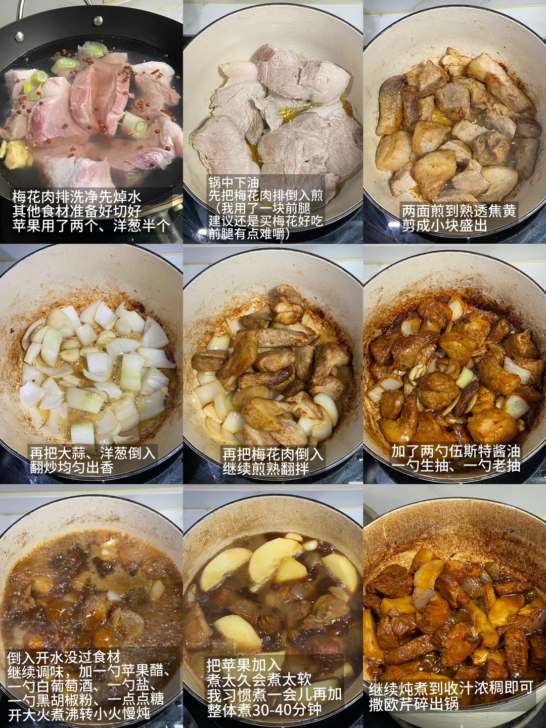 好吃一顿家常菜谱,和苹果一起炖的猪排真的好香,完全可以试试看不出错!简单做了两个素菜搭配着,这一顿吃好!食谱如下: ——————【苹果炖猪排】—————— 食材: 梅花肉排|苹果|洋葱|大蒜|欧芹碎|伍斯特酱油|苹果醋|白葡萄酒 步骤: 1)梅花肉排洗净先焯水,其他食材准备好切好,苹果用了两个、洋葱半个 2)锅中下油,先把梅花肉排倒入两面煎到熟透焦黄,剪成小块盛出 3)再把大蒜、洋葱倒入翻炒均匀,再把梅花肉倒入继续煎熟翻拌,加了两勺伍斯特酱油、一勺生抽、一勺老抽,倒入开水没过食材,继续调味,加一勺苹果醋、一勺白葡萄酒、一勺盐、一勺黑胡椒粉、一点点糖开大火煮沸转小火慢炖 4)把苹果加入,煮太久会煮太软,我习惯煮一会儿梅花肉排再加,整体煮30-40分钟,继续炖煮到收汁浓稠即可,撒欧芹碎出锅 ——————【荷兰豆腊肠】—————— 食材: 荷兰豆|腊肠|蒜末|小米辣 步骤: 1)荷兰豆掐头去尾,食材都洗净切好,锅中下油,先把腊肠炒熟透盛出,再把蒜末、小米辣倒入炒香 2)荷兰豆加入炒到软,再次把腊肠倒入一起翻炒,加一勺生抽、一点盐和鸡精即可 ——————【香煎菇】—————— 食材: 蟹味菇|白玉菇|黑胡椒海盐 步骤: 蟹味菇、白玉菇洗净切开,锅中下黄油开始煎,煎到微微干焦,撒黑胡椒海盐调味即可