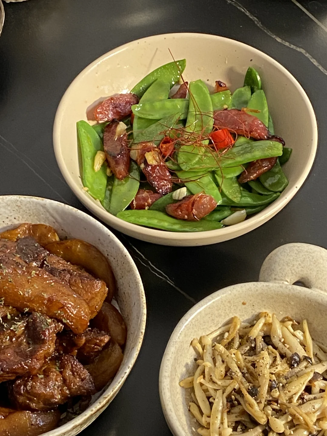 今日菜谱📜苹果炖猪排香煎菇腊肠荷兰豆🥢